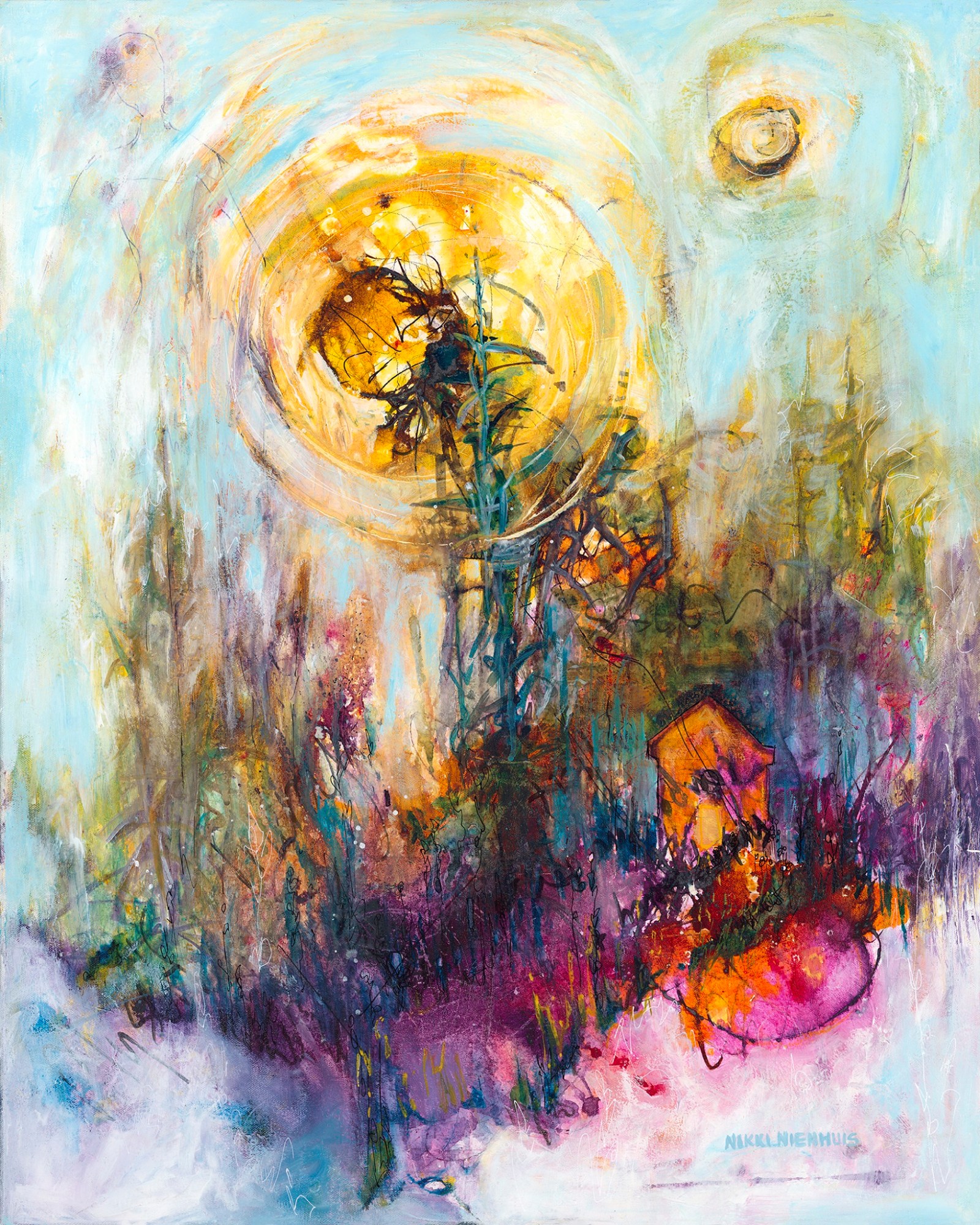 One summer morning I woke up grumpy and realized that I hadn’t really deeply painted. I meditated on what was my next best step in the good for all and then (as a out of the blue) my good friend invited my daughter over for the day. I wrote 4 pages working from prompts that guided me through some feelings. Then I put some words and symbols onto this canvas. After that I poured paint and scribbled more into it and eventually it came.... I opened an old emotion that hadn’t healed and was able to rewrite the story of it. Our biography becomes our biology- Making art heals- even if you trash it afterwards. It’s the process that matters. framed in a black float frame.