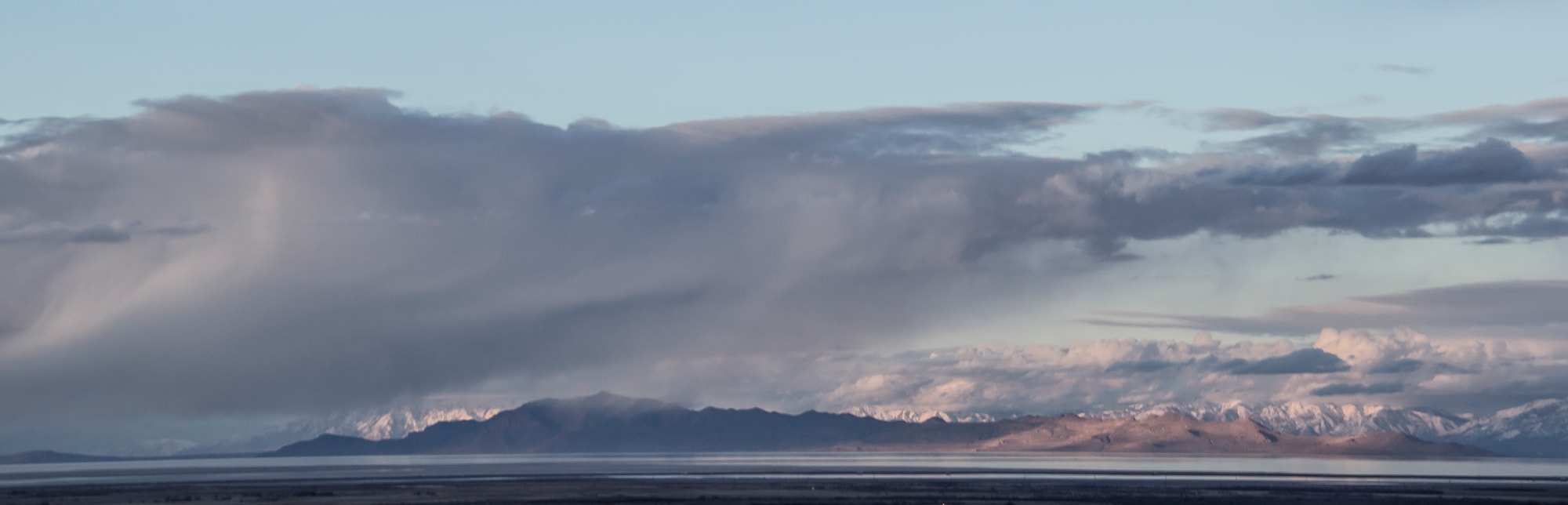 Photo taken with fully extended telephoto lens look across the distance from Grantsville Reservoir over the Great Salt Lake looking toward Salt Lake City. The Skies were playful and joyous, making this the best photo op ever! But it was Cold!!!