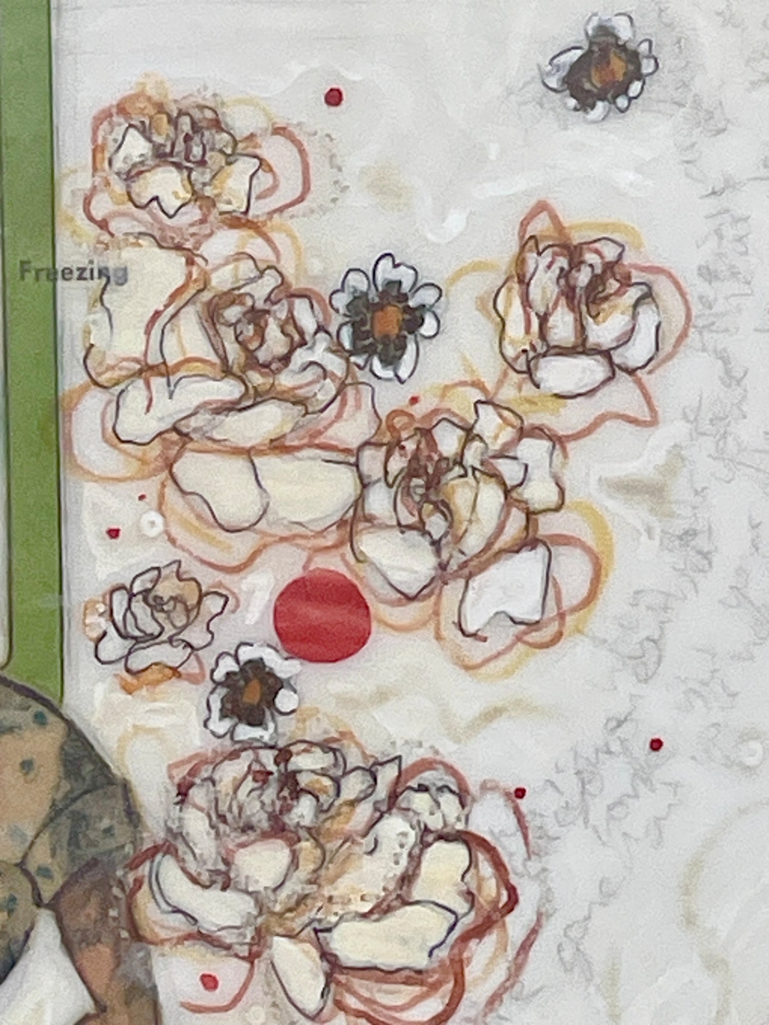 Images and text are on all layers. The piece is sewn, beaded and waxed. The finished work is adhered to a wooden panel. The edges of the painting are a little uneven, transparent and slightly extend over the canvas.