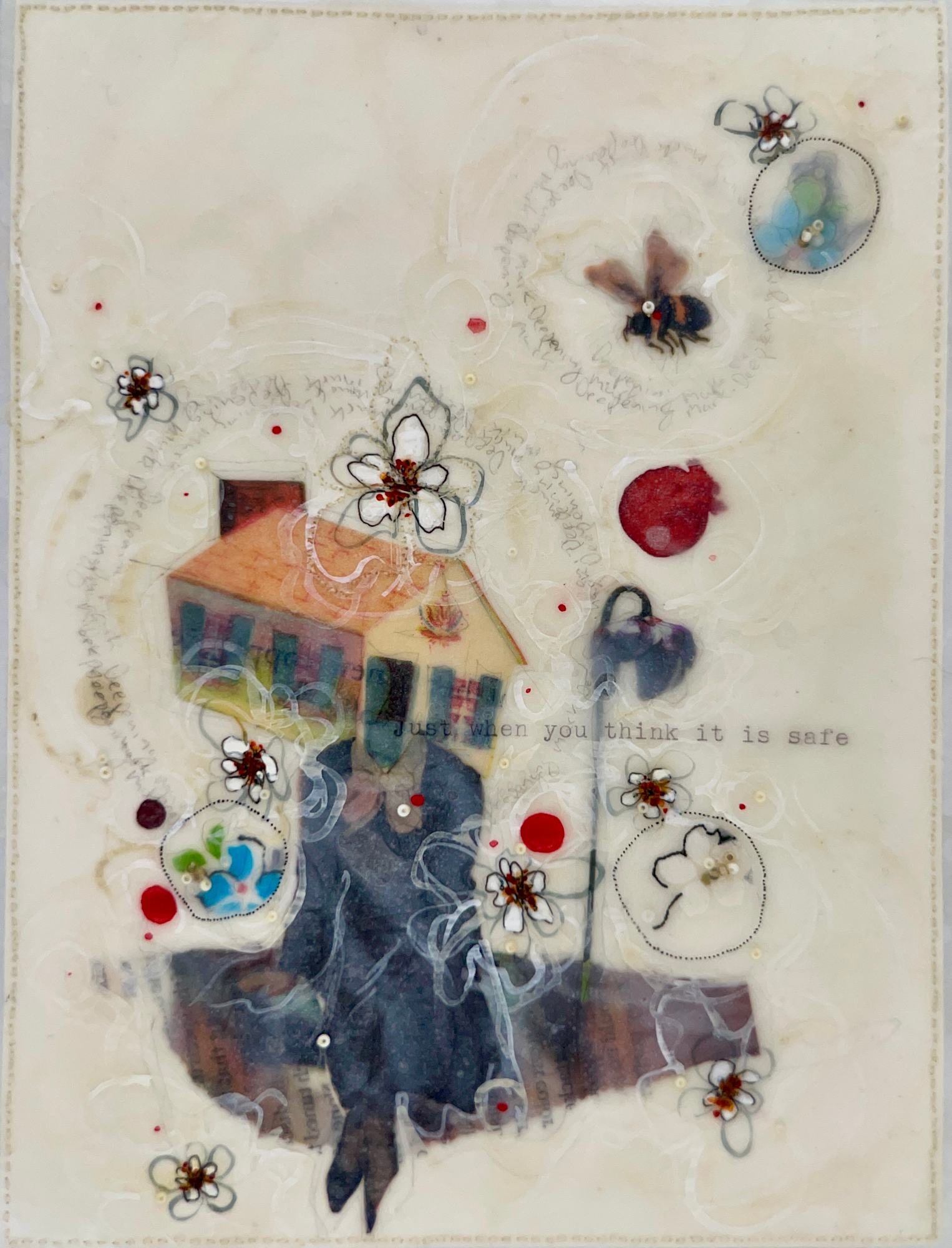 Cold wax is added between layers of paper to create a soft sheen, and wrinkled surface. The edges of the painting are handsewn and slightly extend over the wooden panel. Each painting is signed and ready to hang.