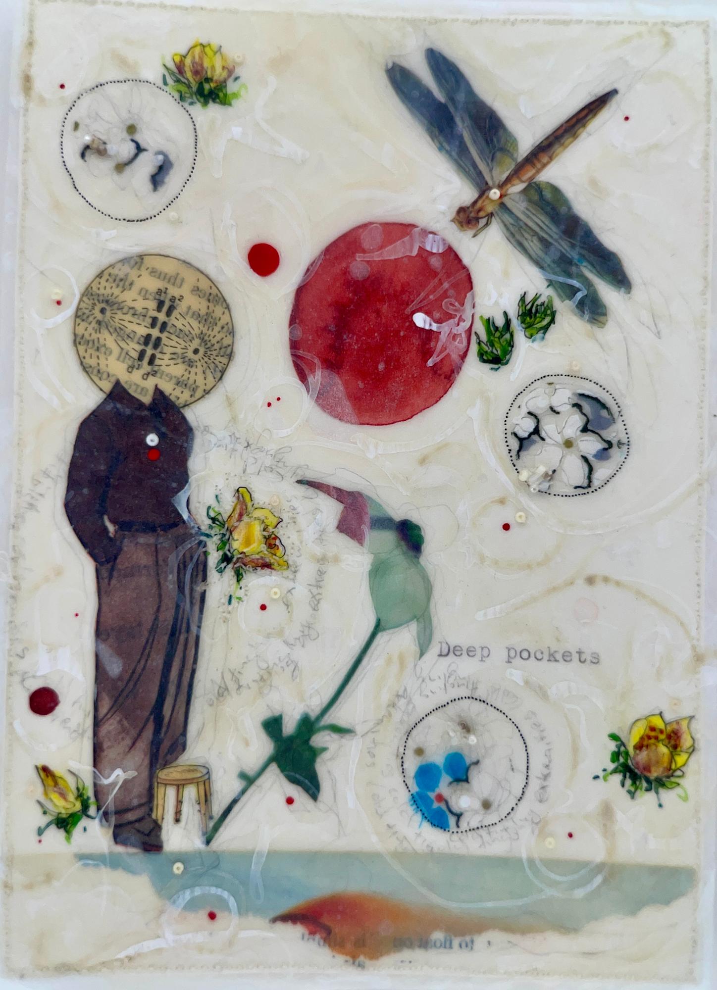 Cold wax is added between layers of paper to create a soft sheen, and wrinkled surface. The edges of the painting are hand sewn and delicate.