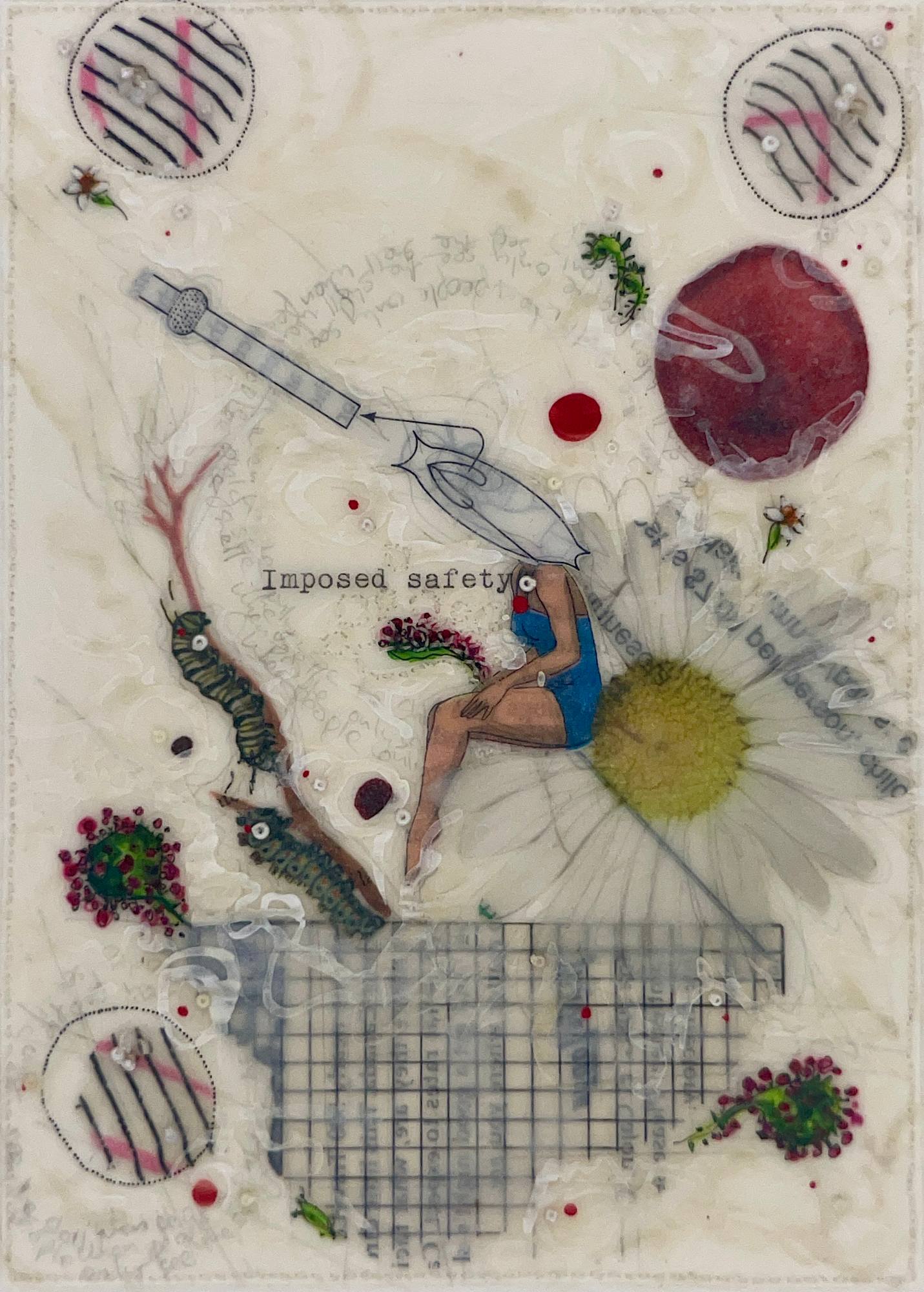 - Collage, paint, pencil, fabric, tracing paper, beads, thread, wax.