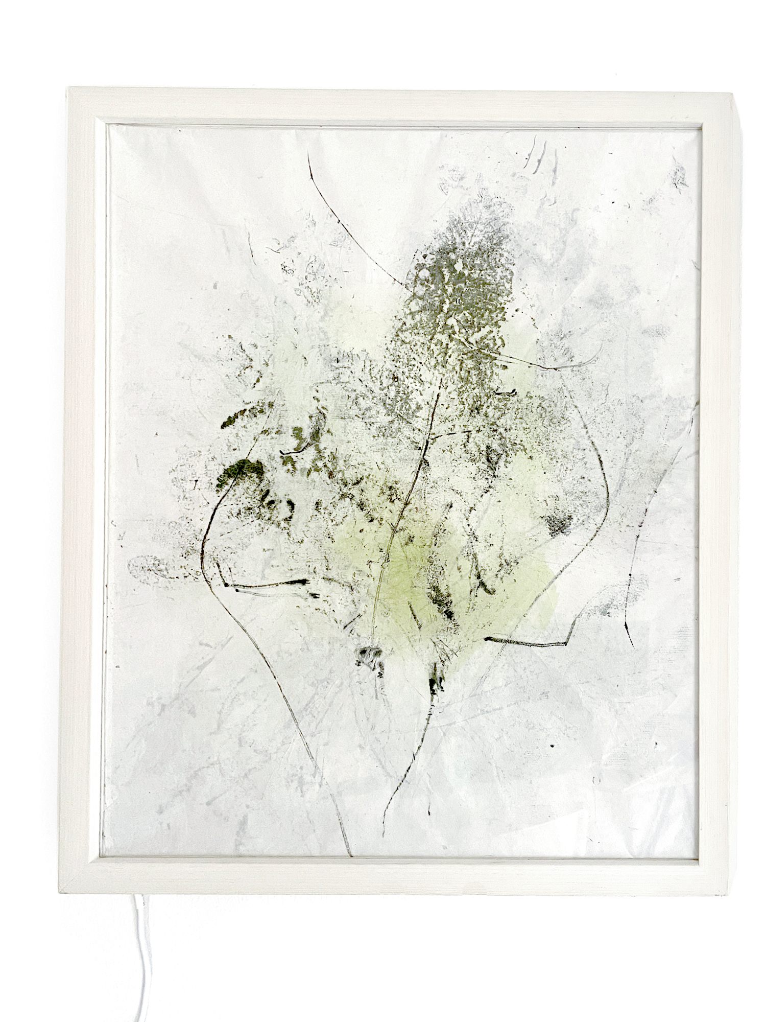 • Frottage (Nat. Geographic magazine, beeswax) & watercolour, on Japanese rice paper, light box