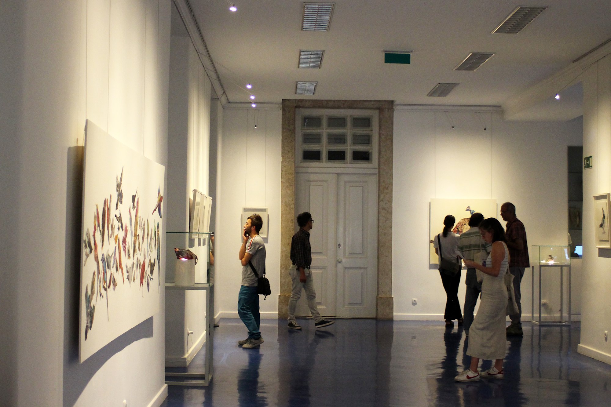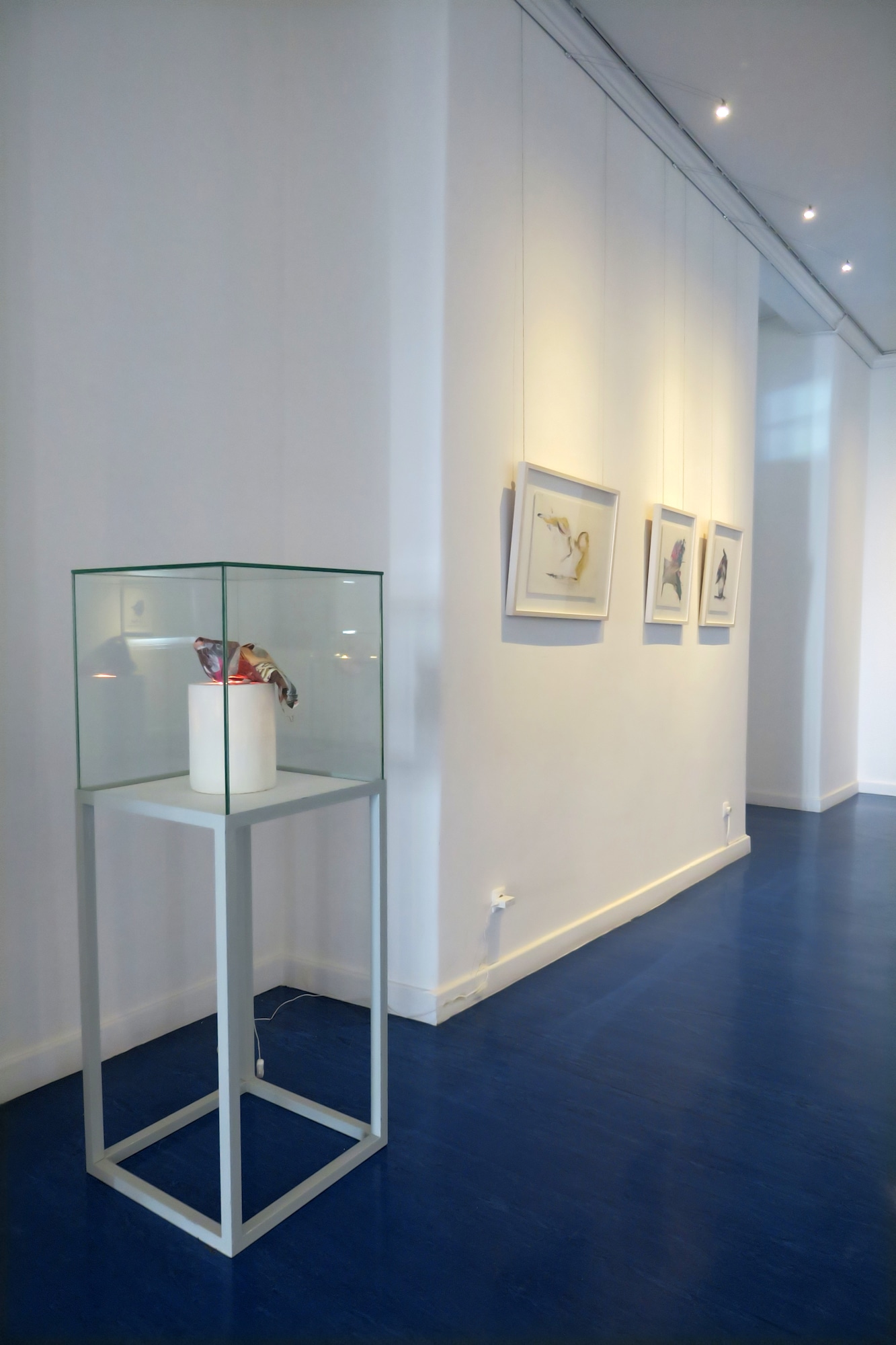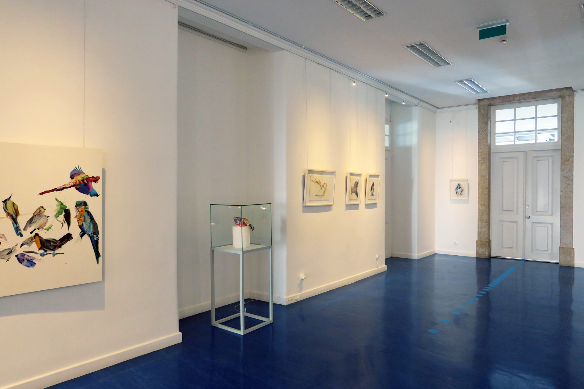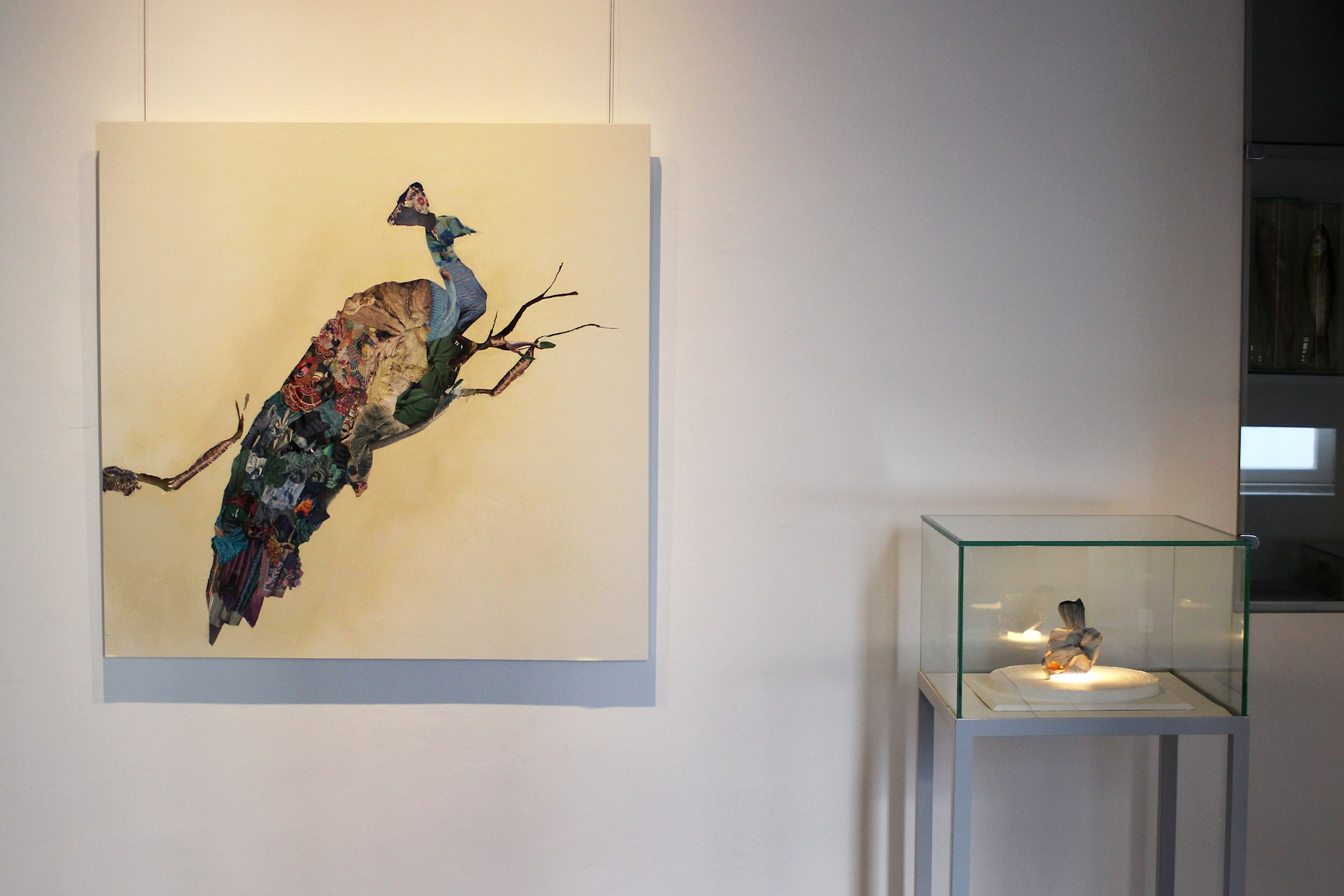 The exhibition Taxis Derma by Nina Fraser is composed of paintings with collage from fashion magazine cuttings; 13 drawings and 2 paper sculptures. The artist intends in a subtle but provocative way to evoke the relationship between society and animals. Nina Fraser uses images of clothing as a symbolic material to cover the head and body of the birds, creating a discontinuous involvement of the viewer with the animal.