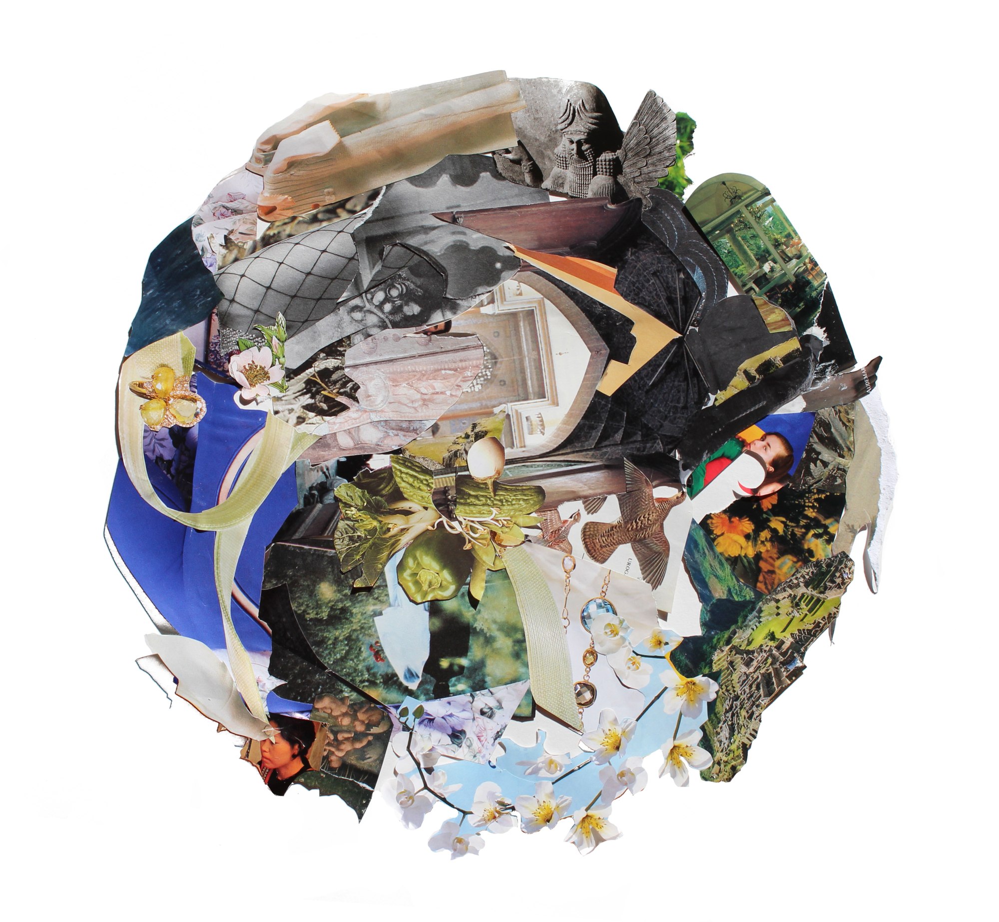 Working with the symbolism of a circle that protects, maintains, flows and connects, magazine imagery is held in a space of suspended animation, exploring notions of disposability and temporality within a unified whole. By exploding the external - an obsessive fragmentation of multiple perspectives drawn from the visual culture that surrounds us - I am simultaneously looking inward, drawing references from diverse philosophical sources and spiritual practices. Often seen as a symbol of protection, the circle template was taken from my dining table placemat, referencing intimacy and constraint within the domestic sphere. Emotionally accentuated during the pandemic, the home became a central ground for every aspect life, redefining a sense of time, relationship and priority.
