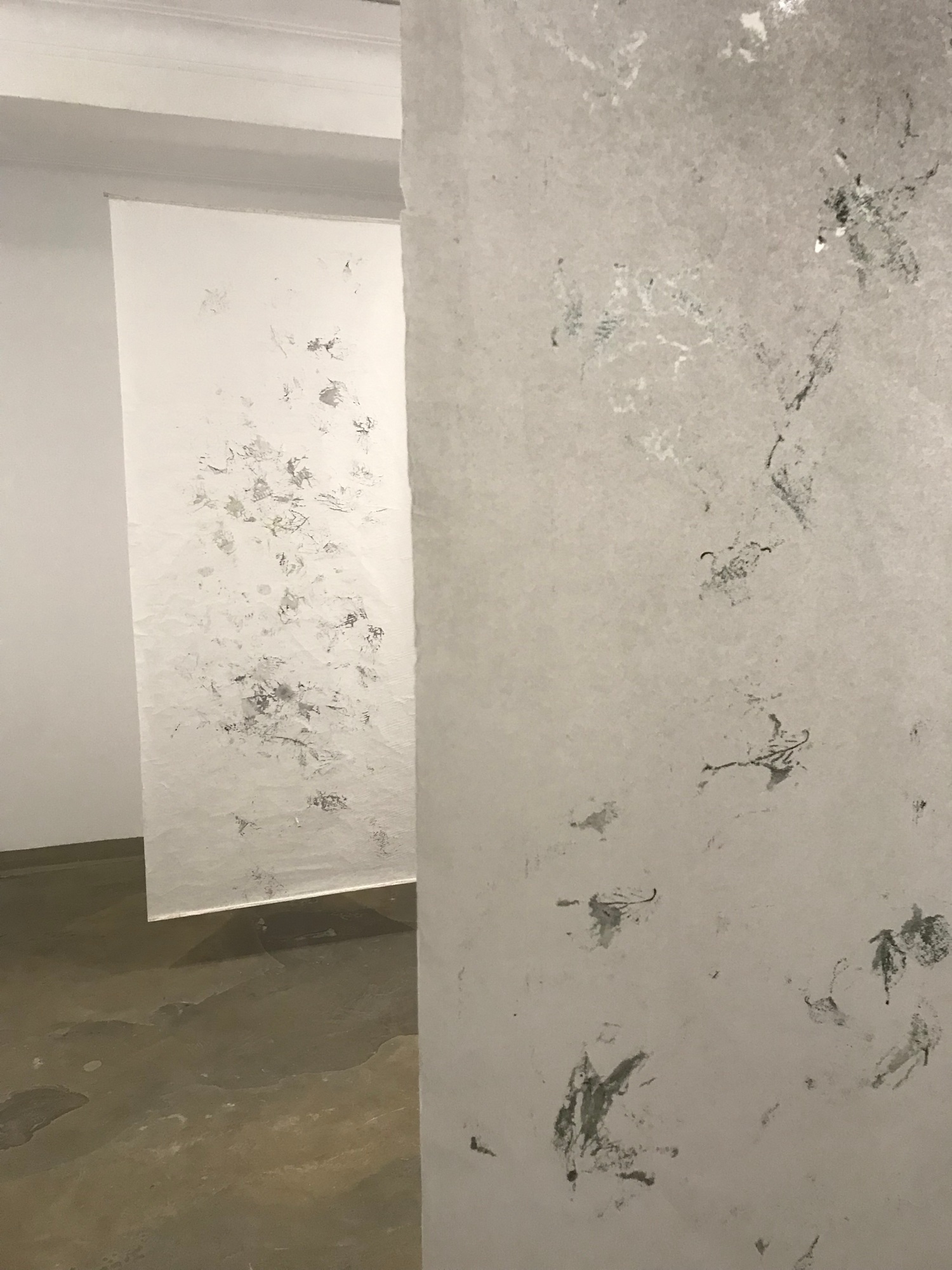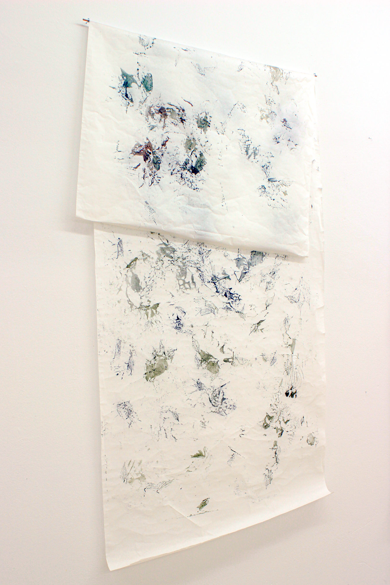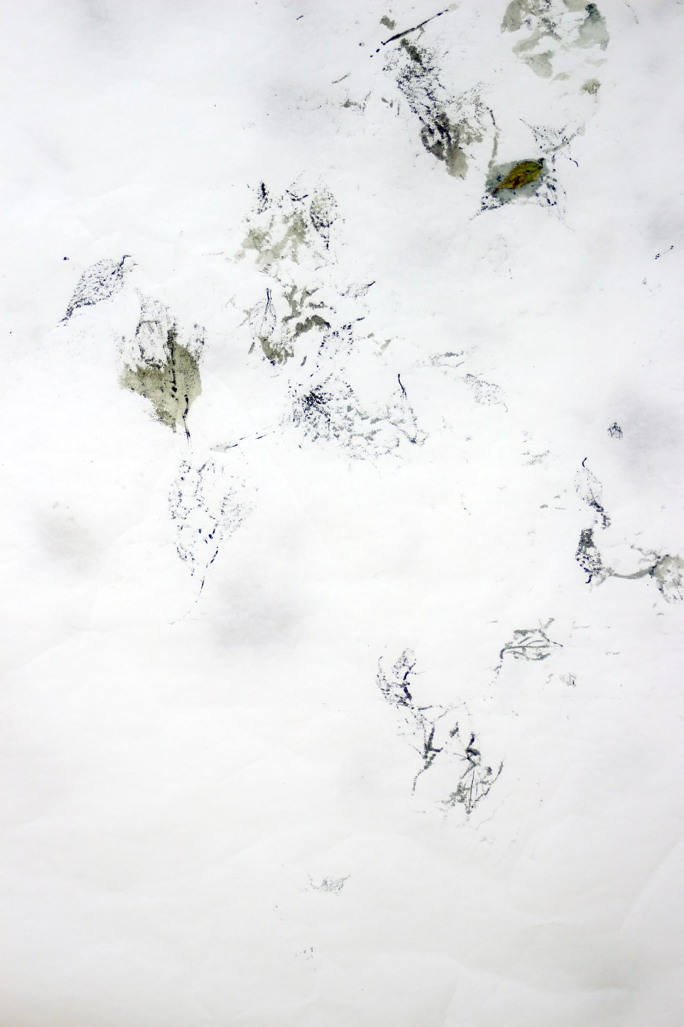 A Frottage technique is invented from the application of heat and beeswax rubbed onto a National Geographic from the 1970’s to transfer its ink to the Japanese rice paper. The leaves are placed under the paper when the process occurs, revealing their form as an imprint. The process harnesses metamorphic qualities, and embodies a transference of time to the present state - my memory is now embodied in a symbolic gesture. The work explores the leaf image as both a simulacrum, a reminder of our increasing psychological distance from nature, and a universal representation of cycles, decay and regrowth.