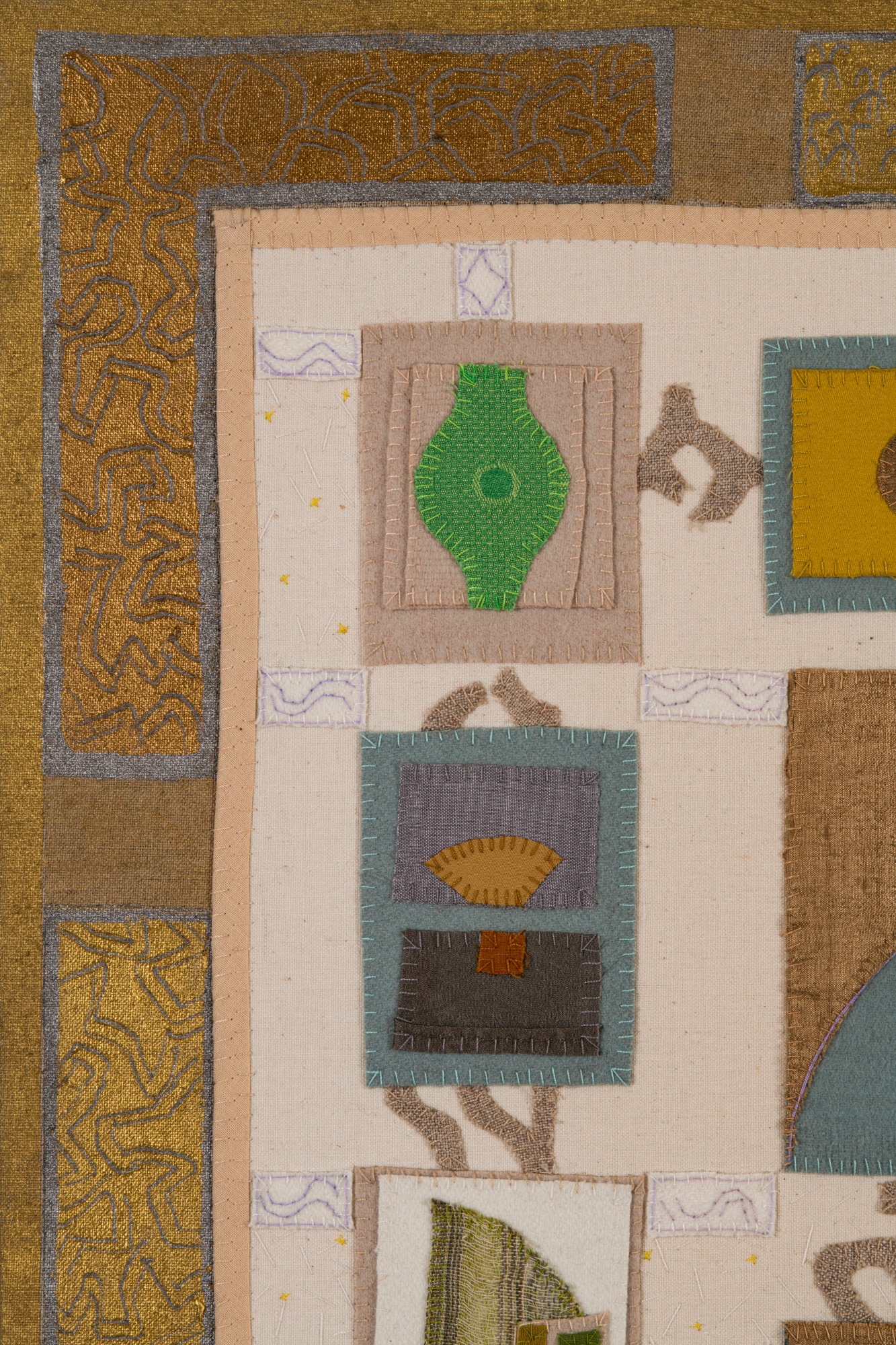 Handsewn fabric collage with acrylic paint