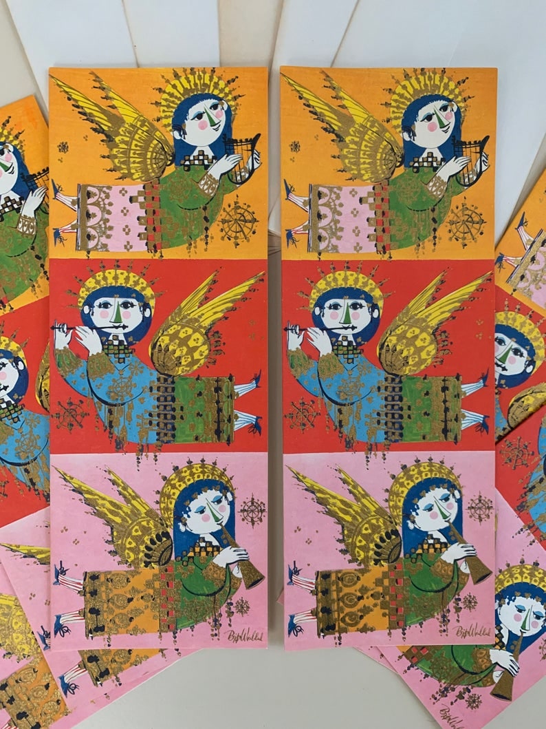 Vintage Christmas cards by the Drawing Board featuring artist Bjorn Wiinblad. What was originally a box of 25 is now 6 cards with 5 envelopes, one being very yellowed. The cards are beautifully printed with gold embellishment. The box has a thin plastic top that is worn and has a rip.