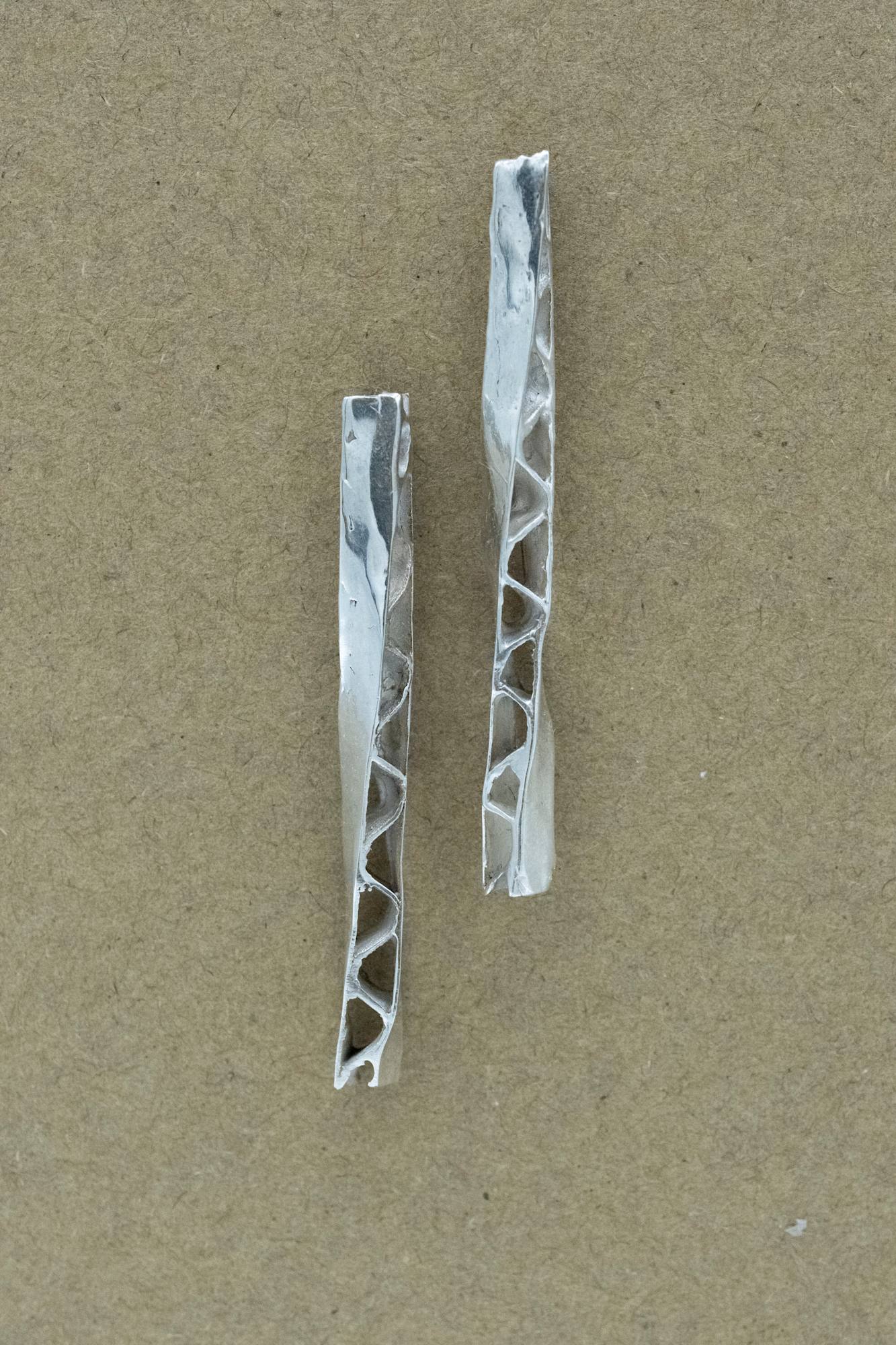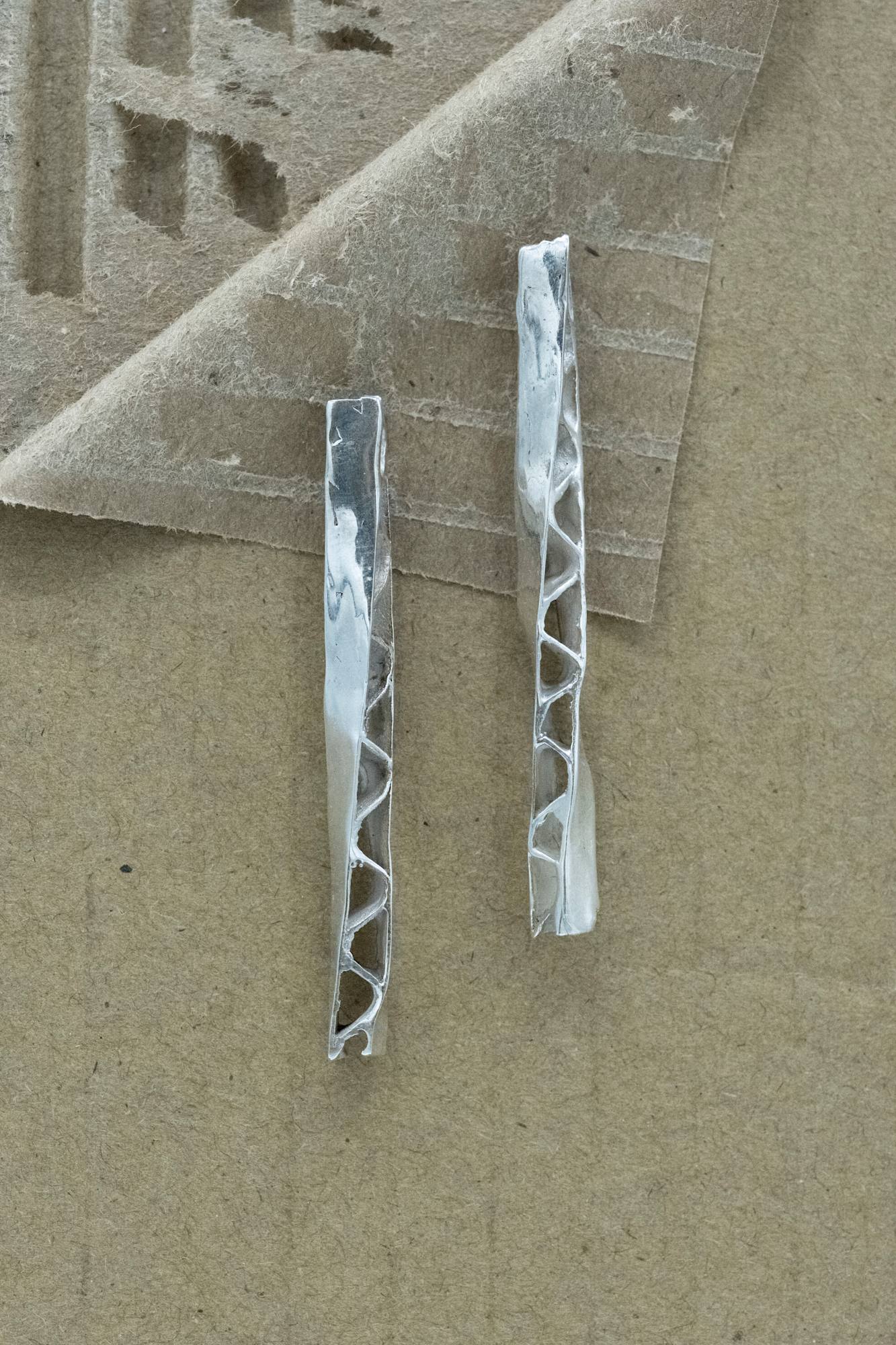 These earrings are brothers with the box they are affixed to. They once started off as the same cardboard, now transformed into sterling silver.