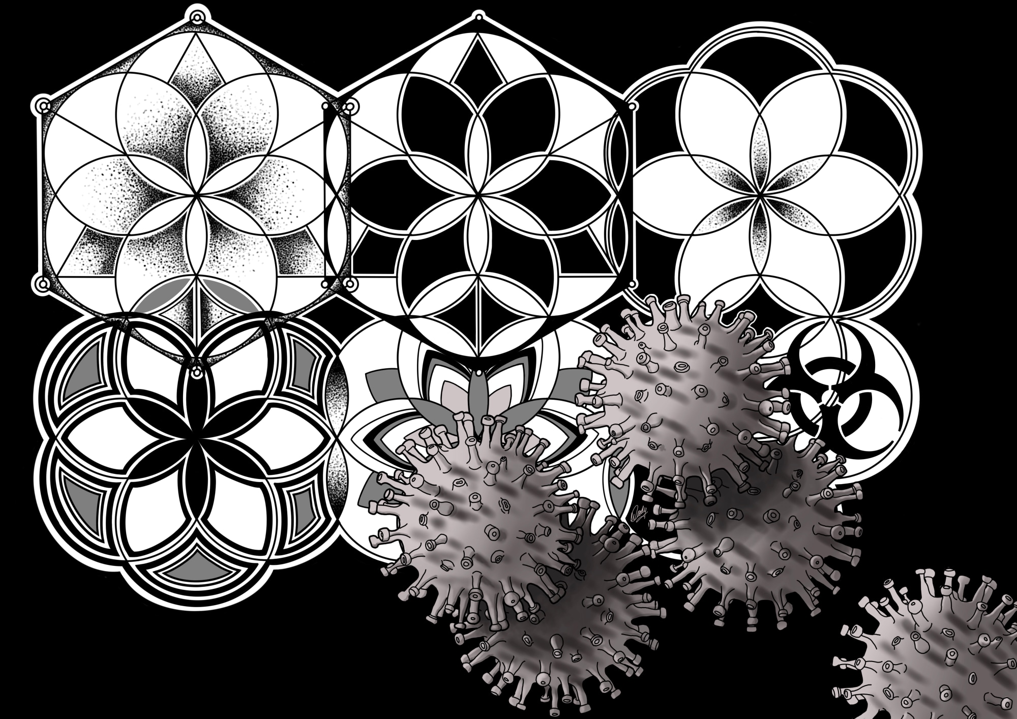 This digital piece was created for the Inspired In Lockdown Exhibition 2020 and was based on the flower of life mandala verses/against the virus of death Covid 19 during the global pandemic. It depicts the change of natures beauty twisting and mutating into the biohazard form of the deadly virus.