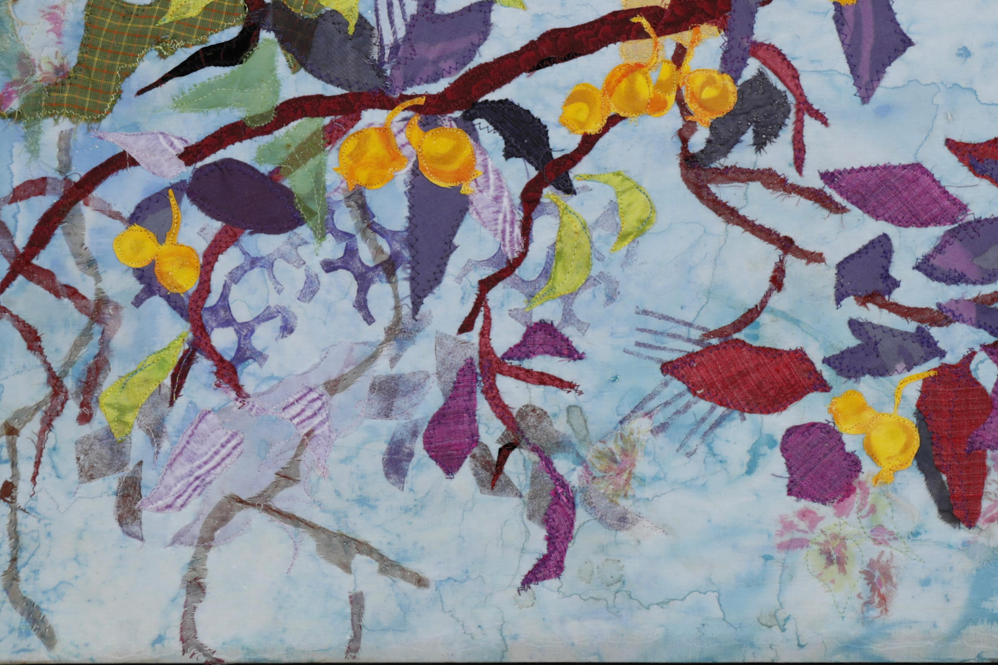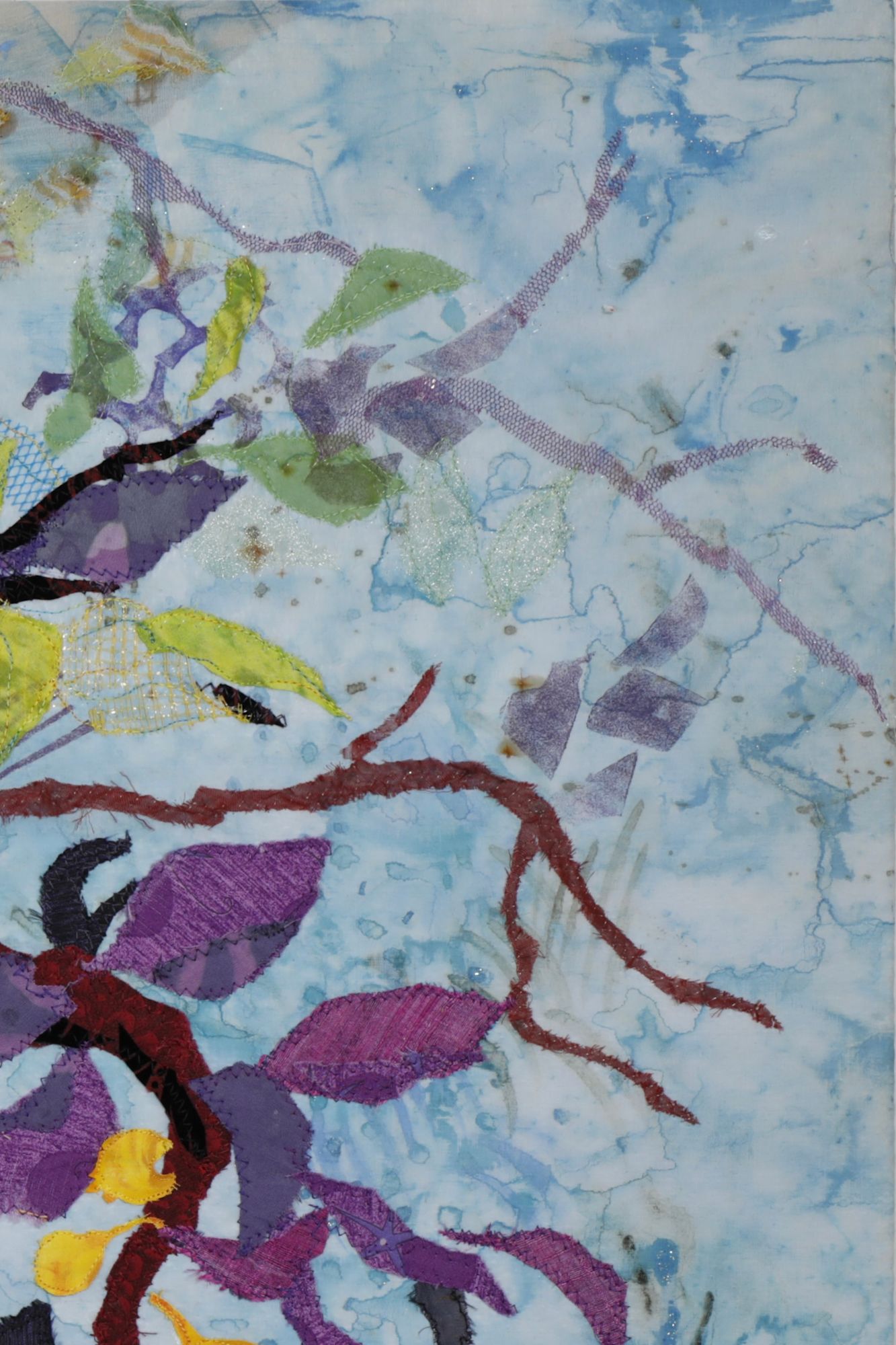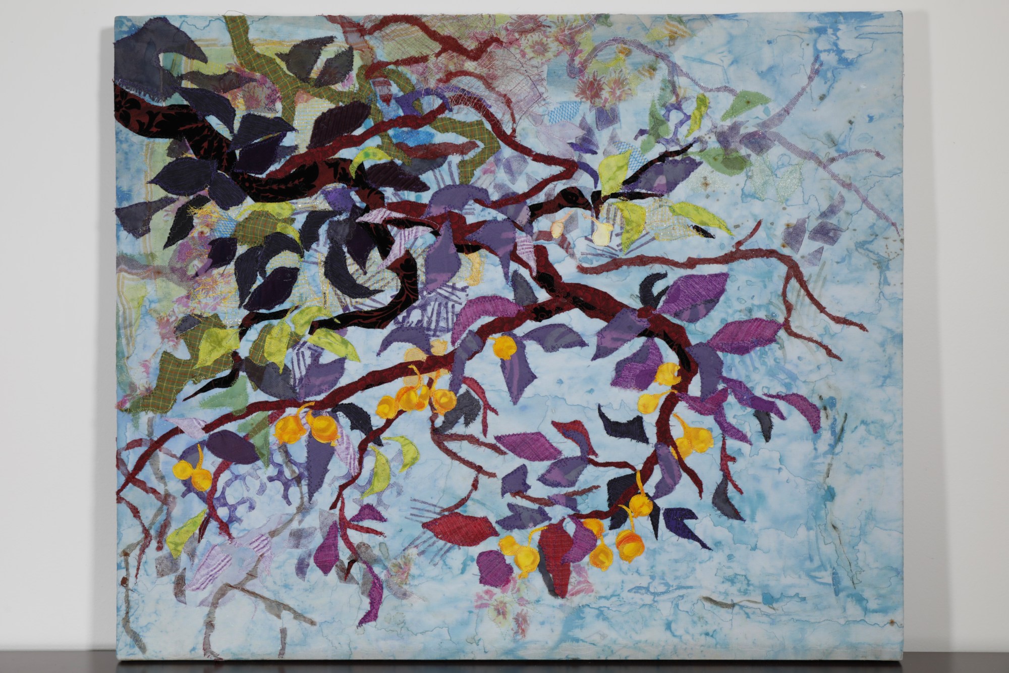 I reclaim cast offs through painting, printing, stenciling, thermo-faxing, rusting, and composting layering myself onto a past creating a new enriched surface. In tandem, I often create large drawings to flesh out ideas and metaphors. My multifaceted approach uses imagery from nature as a symbol of our life cycle, text to convey or imply meaning, and abstraction to mirror the cacophony and complications of everyday life. As I stitch hundreds of snippets together, each part becomes integral to the whole, akin to the sum of the many moments that make up a lifetime.
