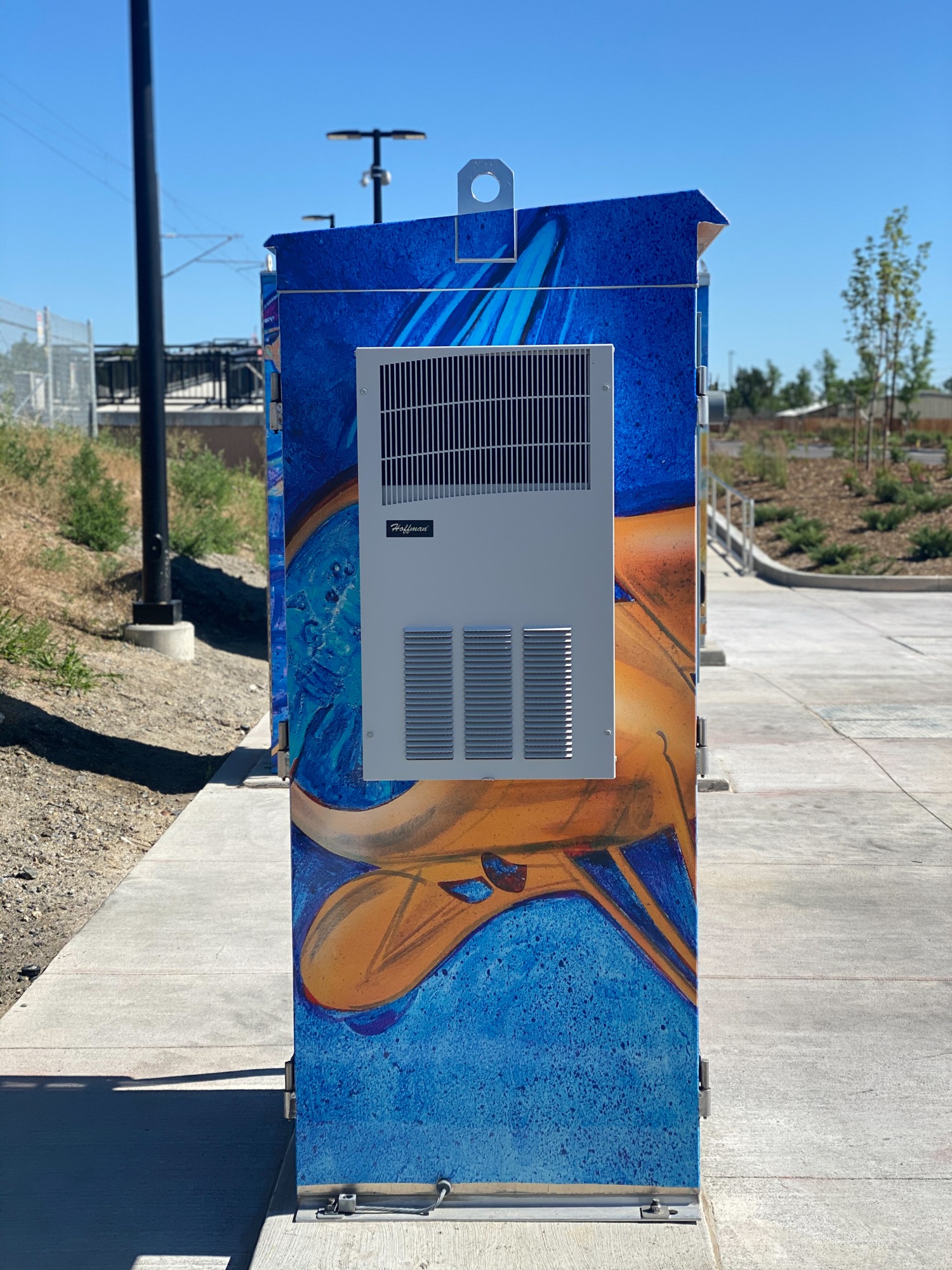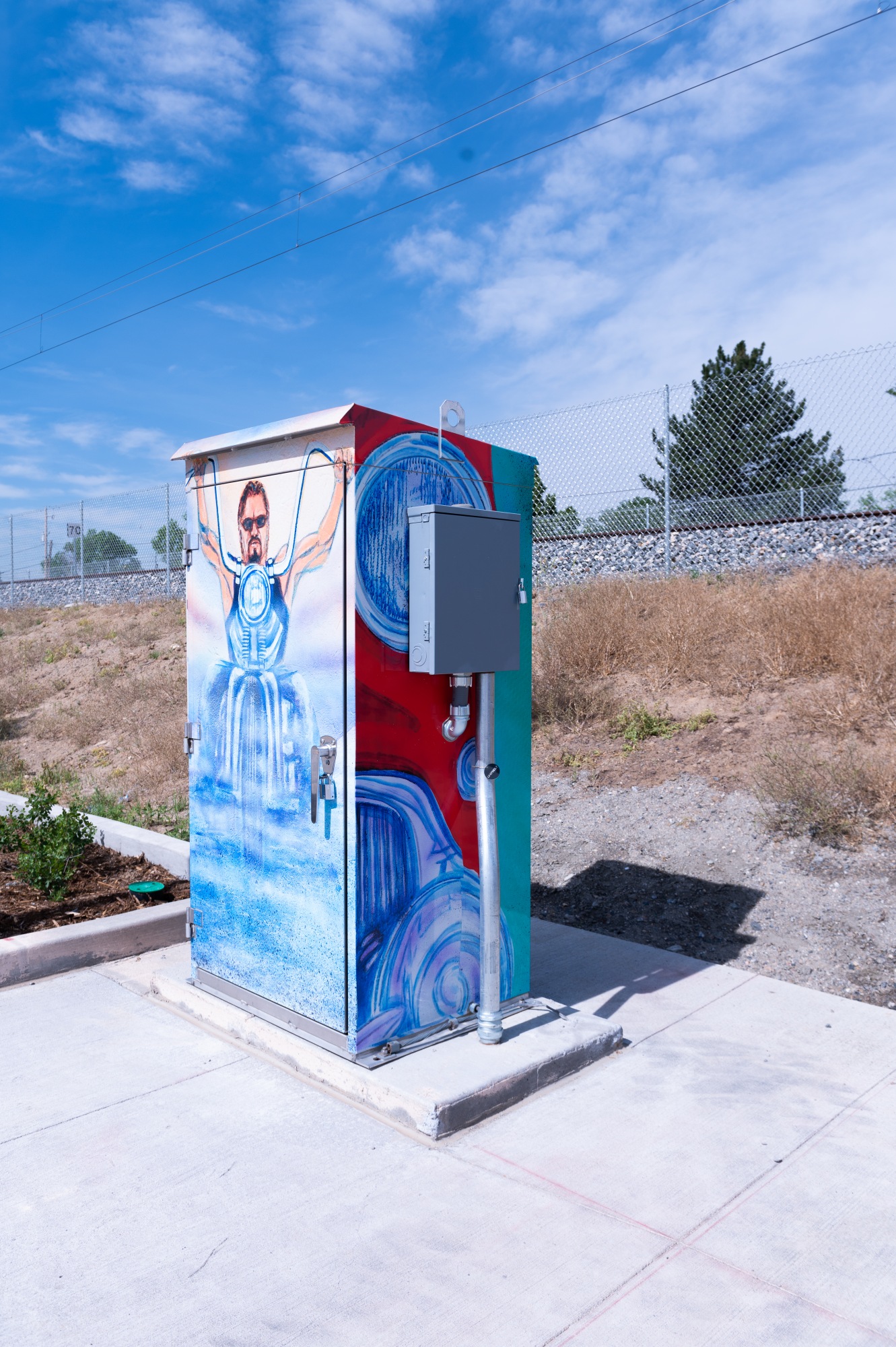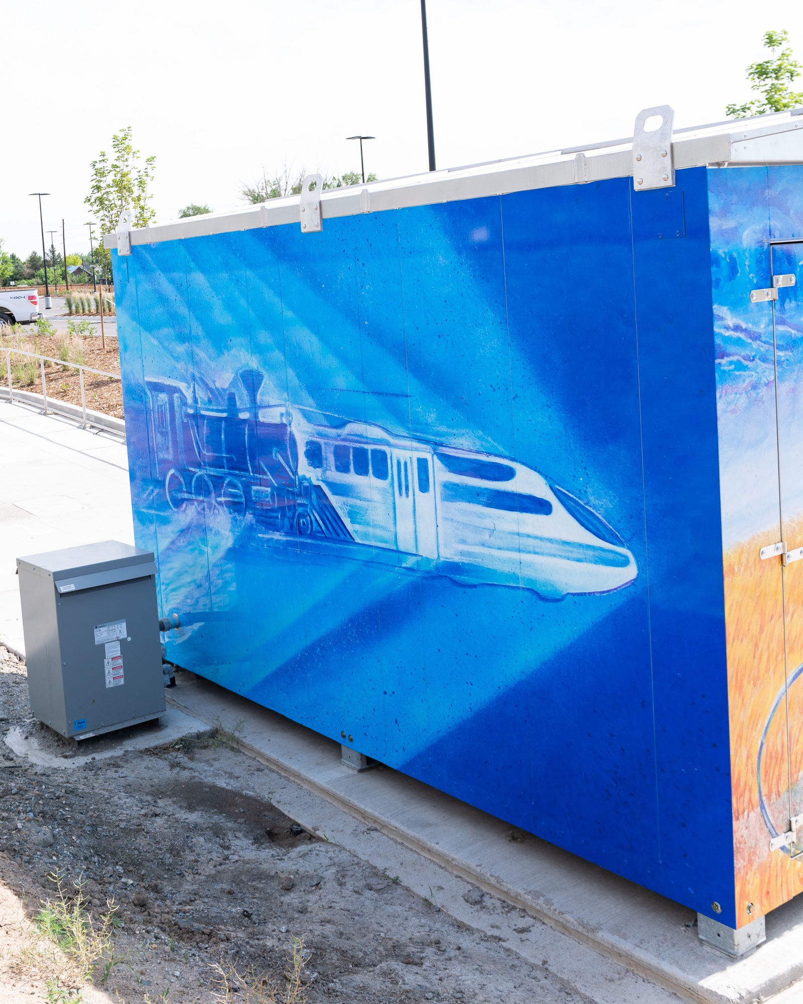 A vibrant, transportation themed mural spanning three wrapped electrical boxes features images created by Northglenn resident Jerry Jaramillo. The murals were commissioned as a part of the new RTD N Line station installation in Northglenn.