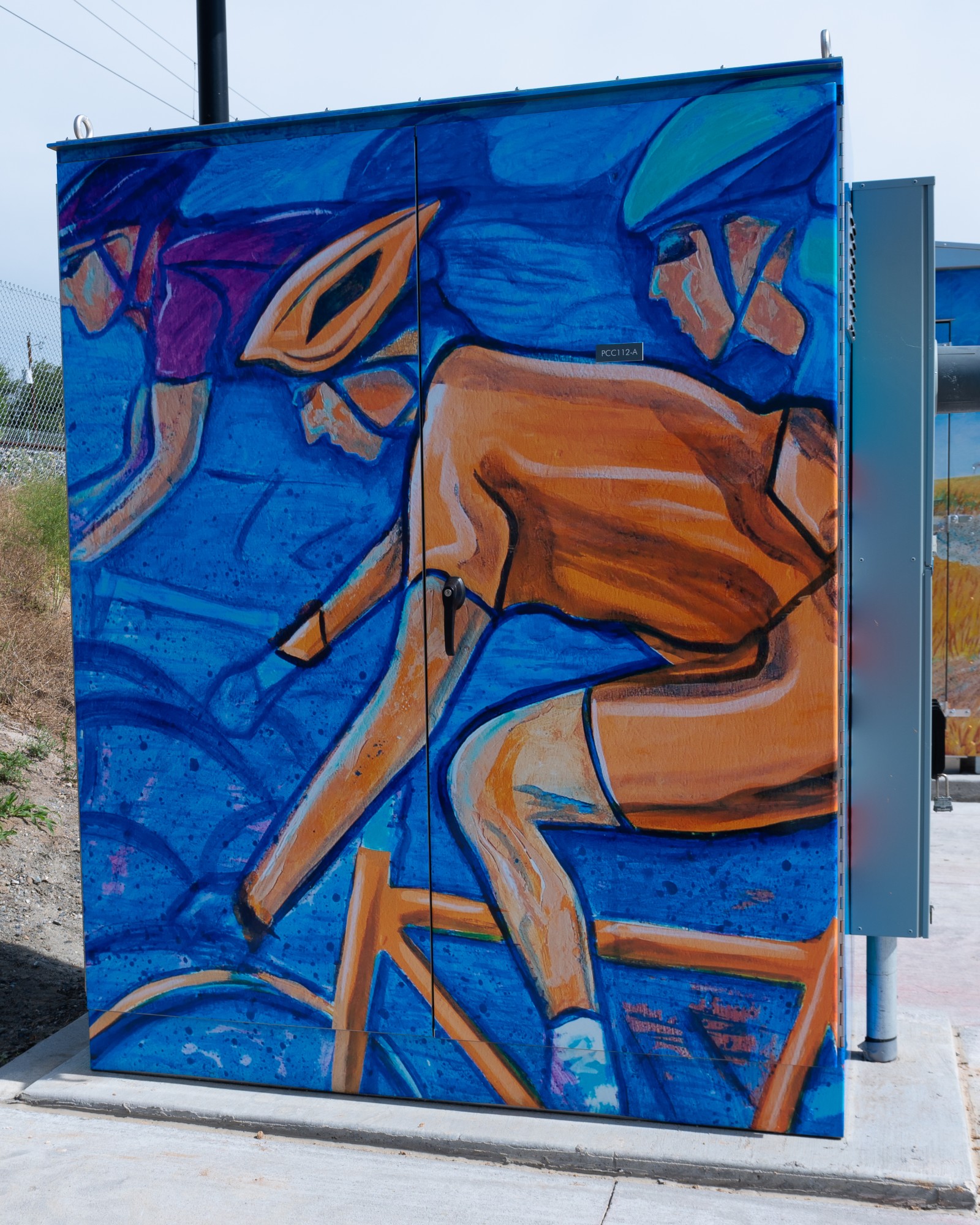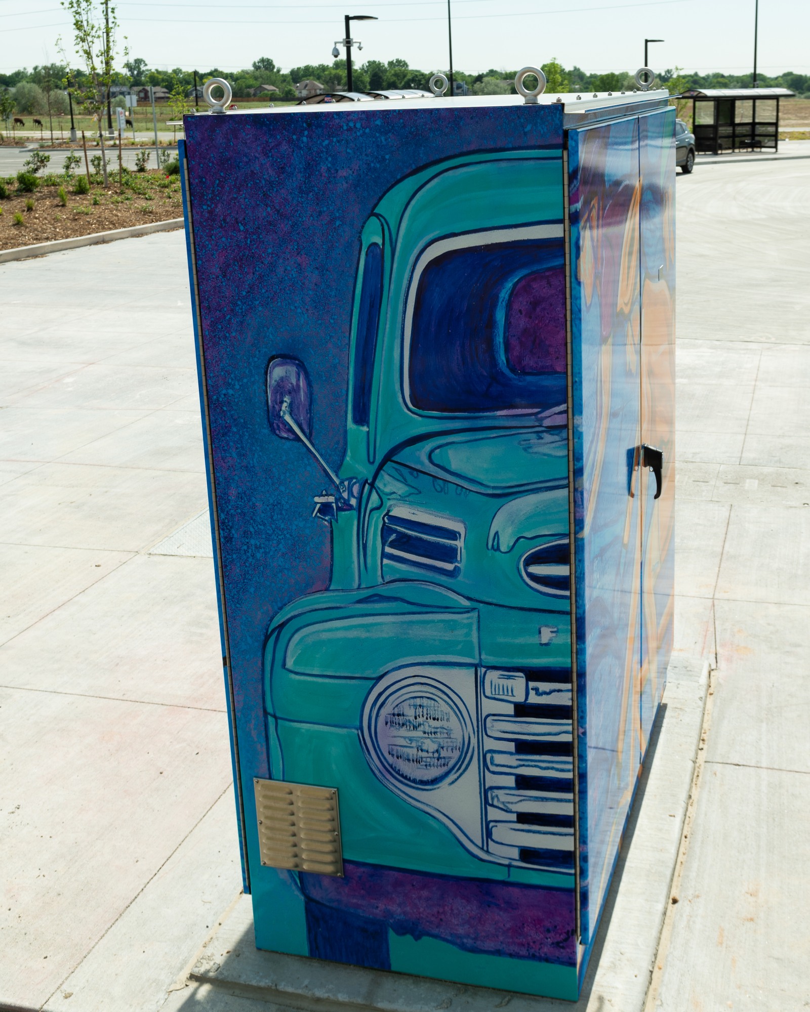 A vibrant, transportation themed mural spanning three wrapped electrical boxes features images created by Northglenn resident Jerry Jaramillo. The murals were commissioned as a part of the new RTD N Line station installation in Northglenn.