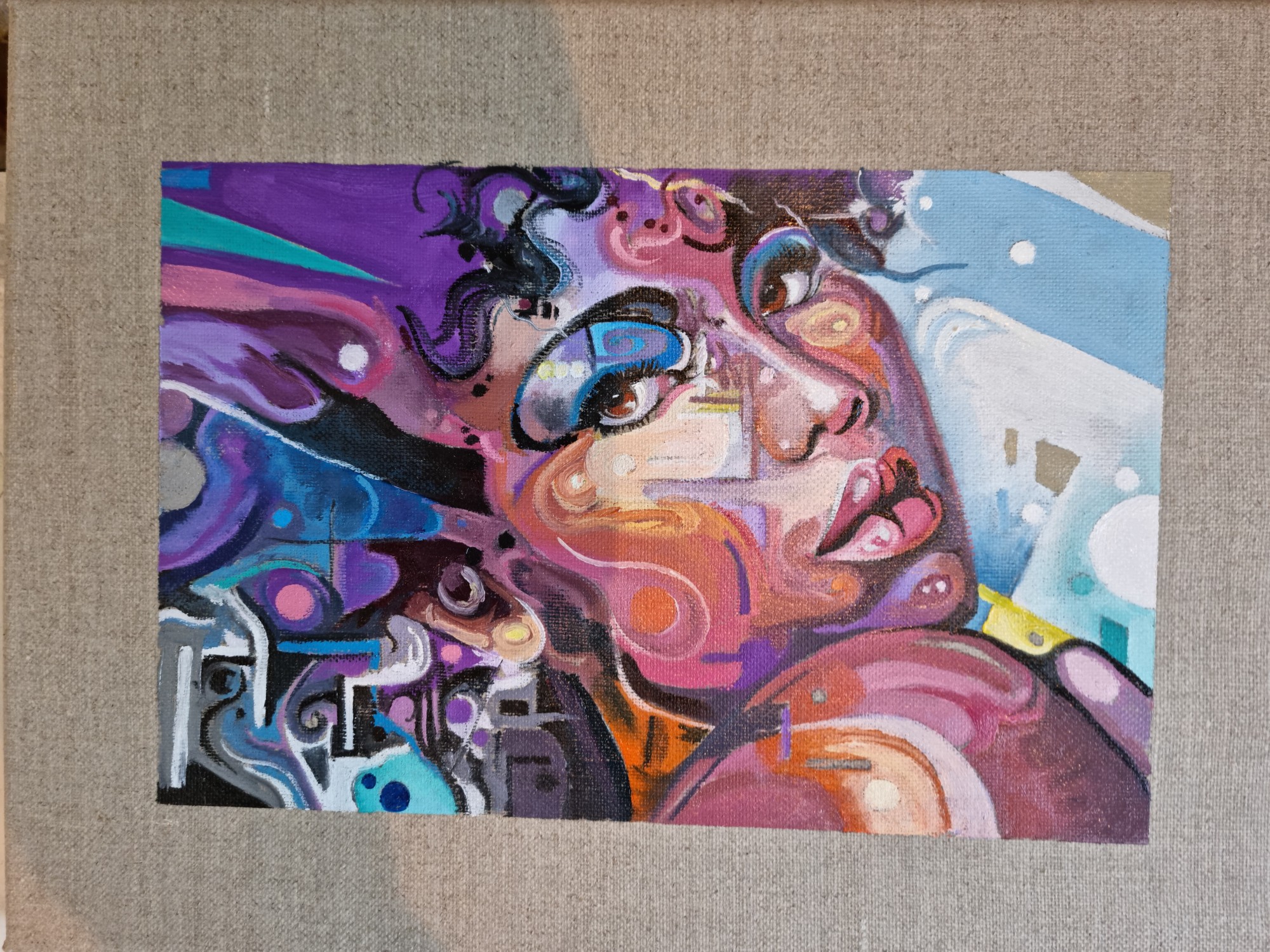 Abstract painting of girl in purples and blues