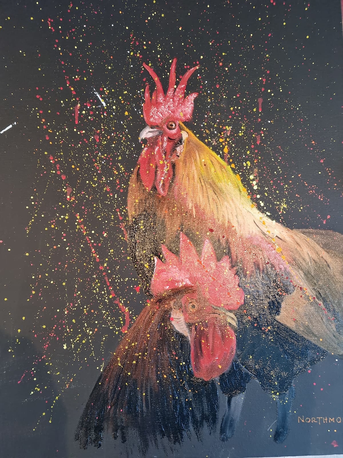 These lovely roosters are painted in oils on linen canvas with splashes of colour added