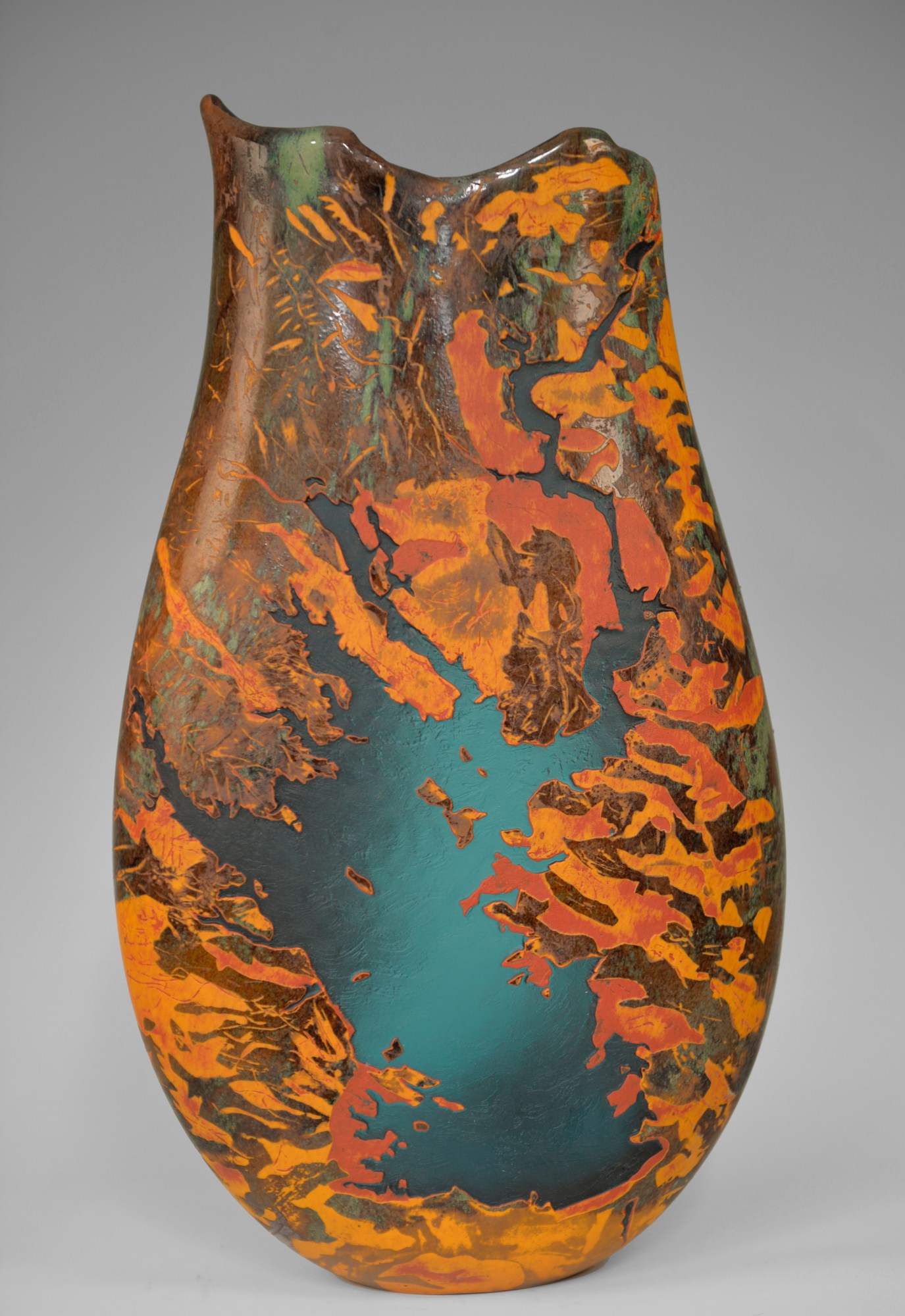 Hand blown vase with a transparent underlay and multiple layers of powdered color. We then sand carved a satellite image of Lake Pleasant on one side and an image of Horseshoe Reservoir on the other, through the layers of color.