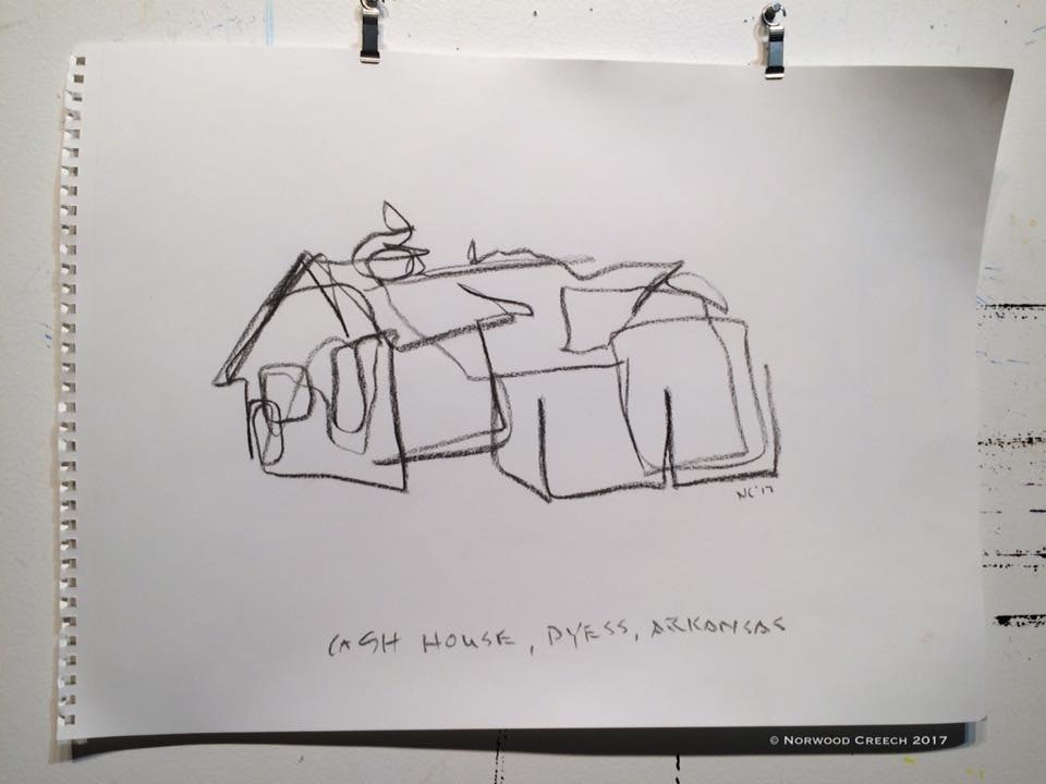 Cash House, Dyess, Mississippi County, Arkansas, single line blind charcoal drawing, drawn on location