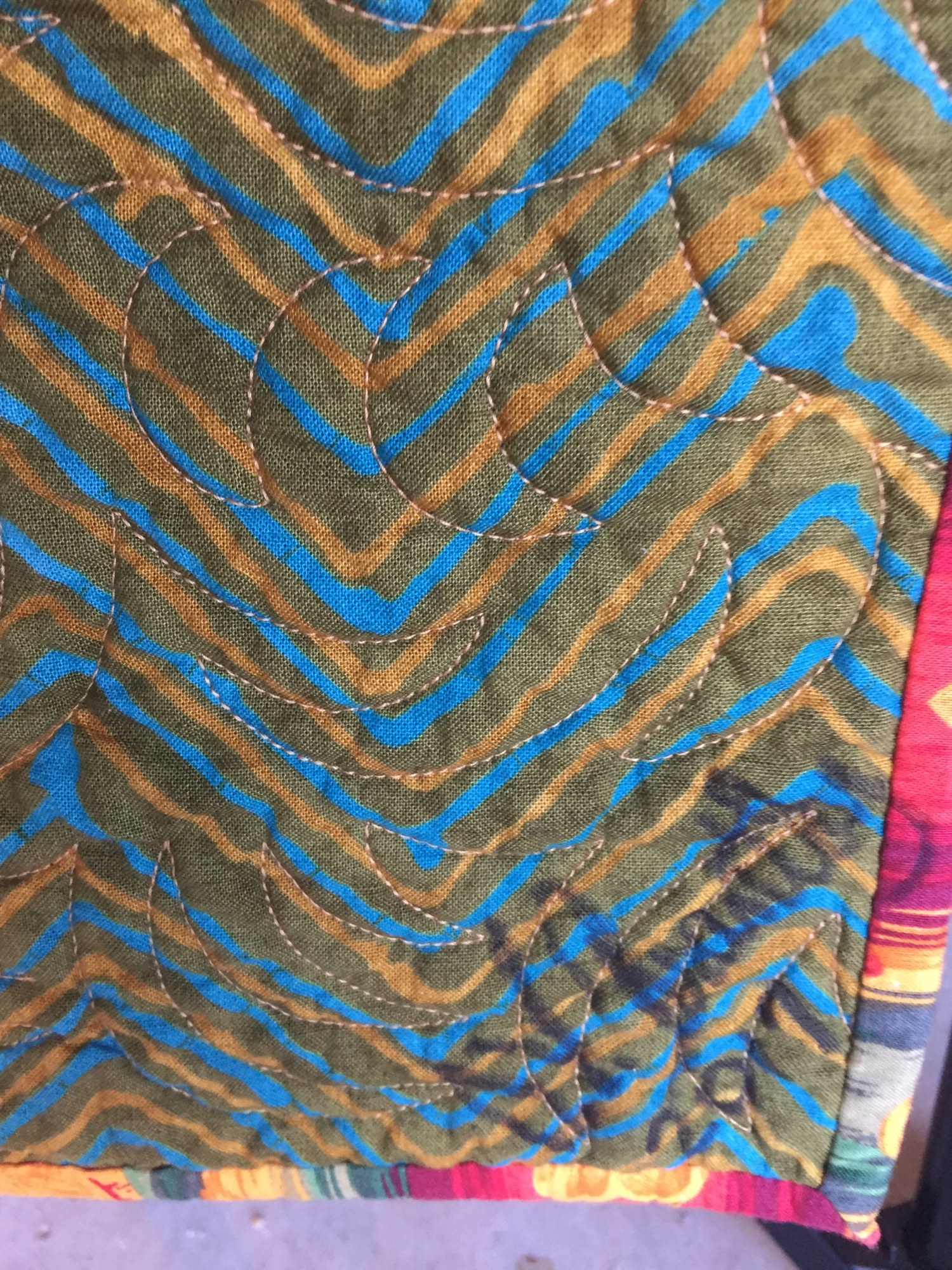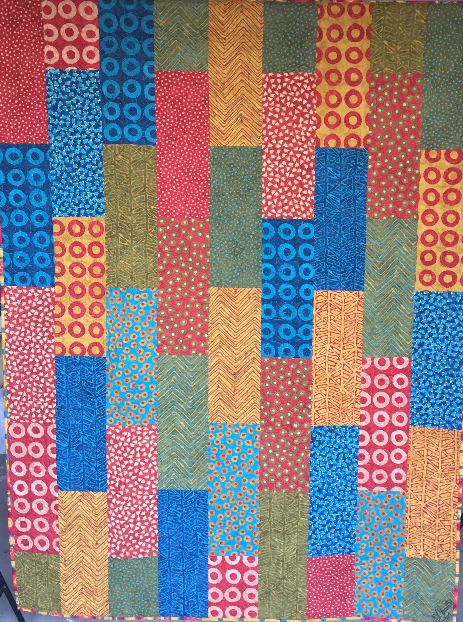 “A Good Day to Curl Up With a Book” is a lap quilt that measures 54x72 inches. It is machine pieced and machine quilted on a long arm. It is based on the “spice drop pattern” by Villa Rosa Designs.