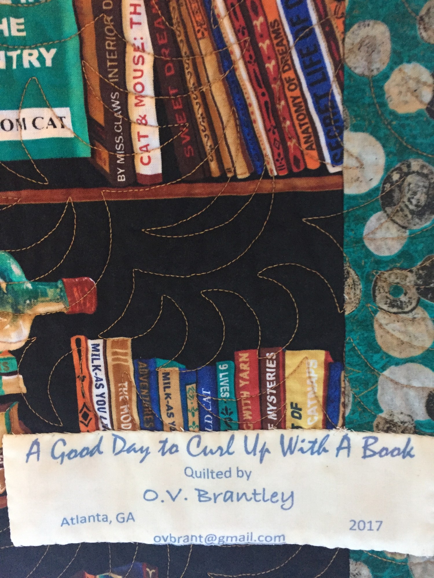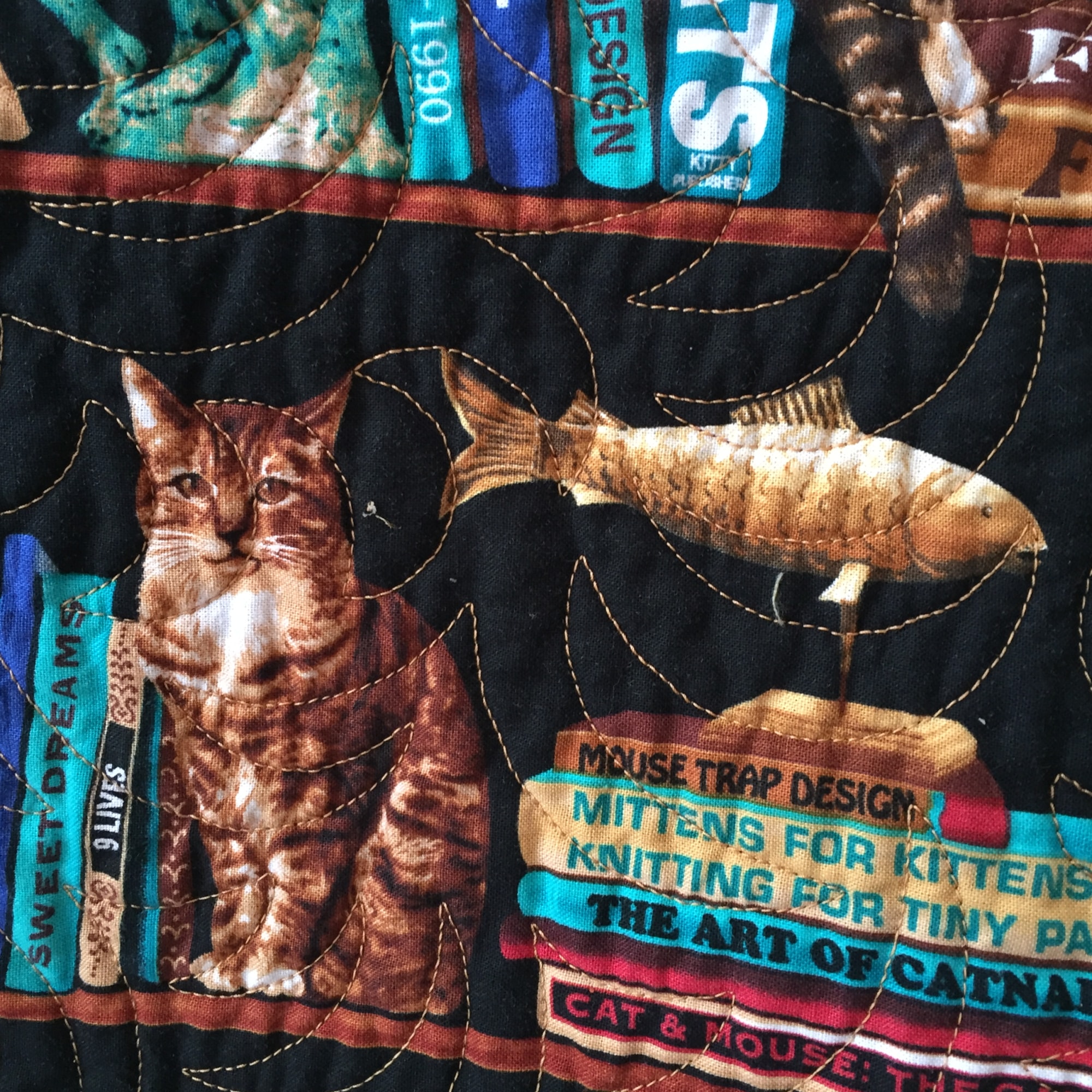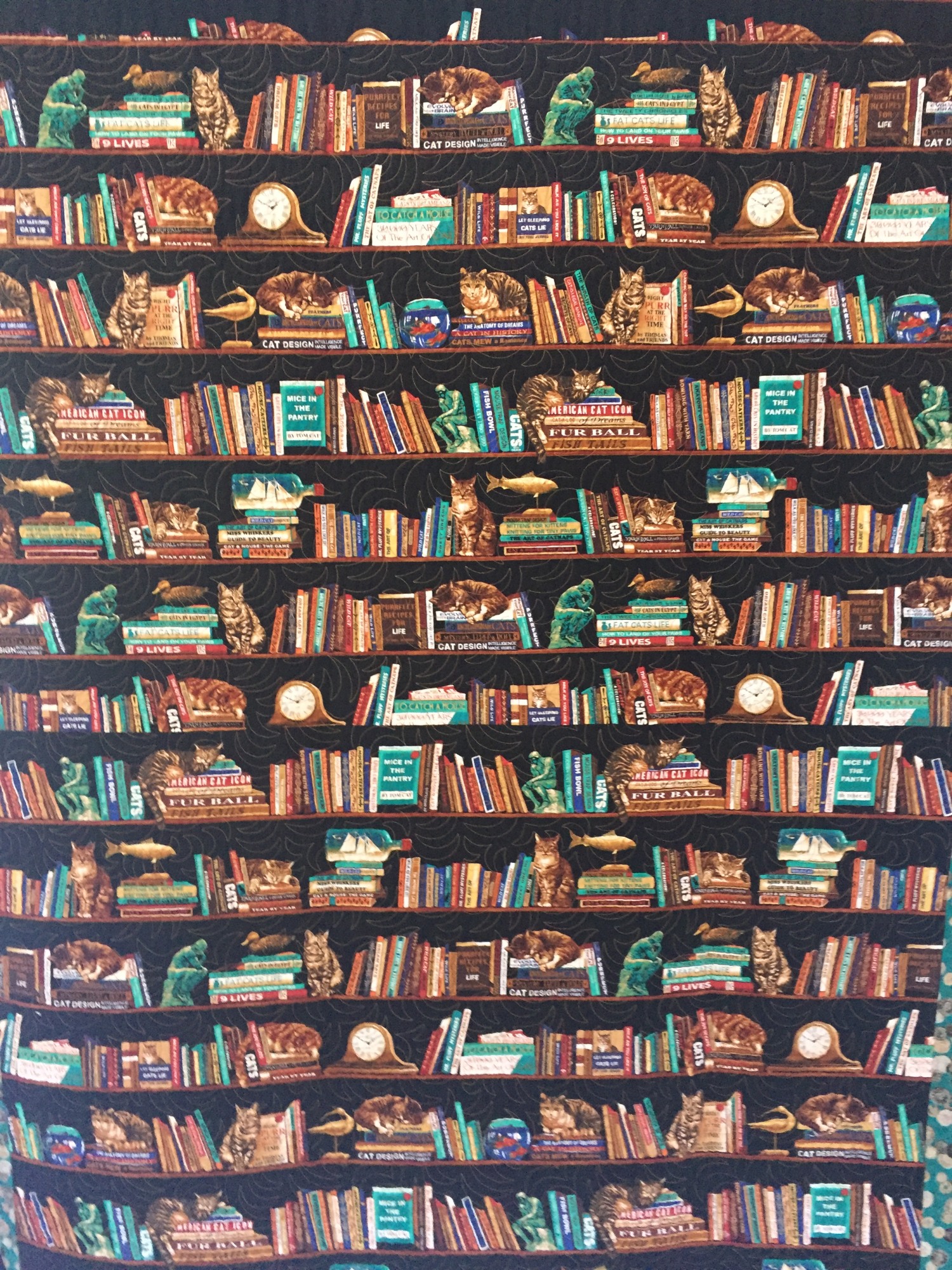 The fabric in the back is a book shelf print featuring cats and cat book titles. There is a hanging sleeve on the back in case you want to hang it. A label documents the quilt. I signed it on the front.