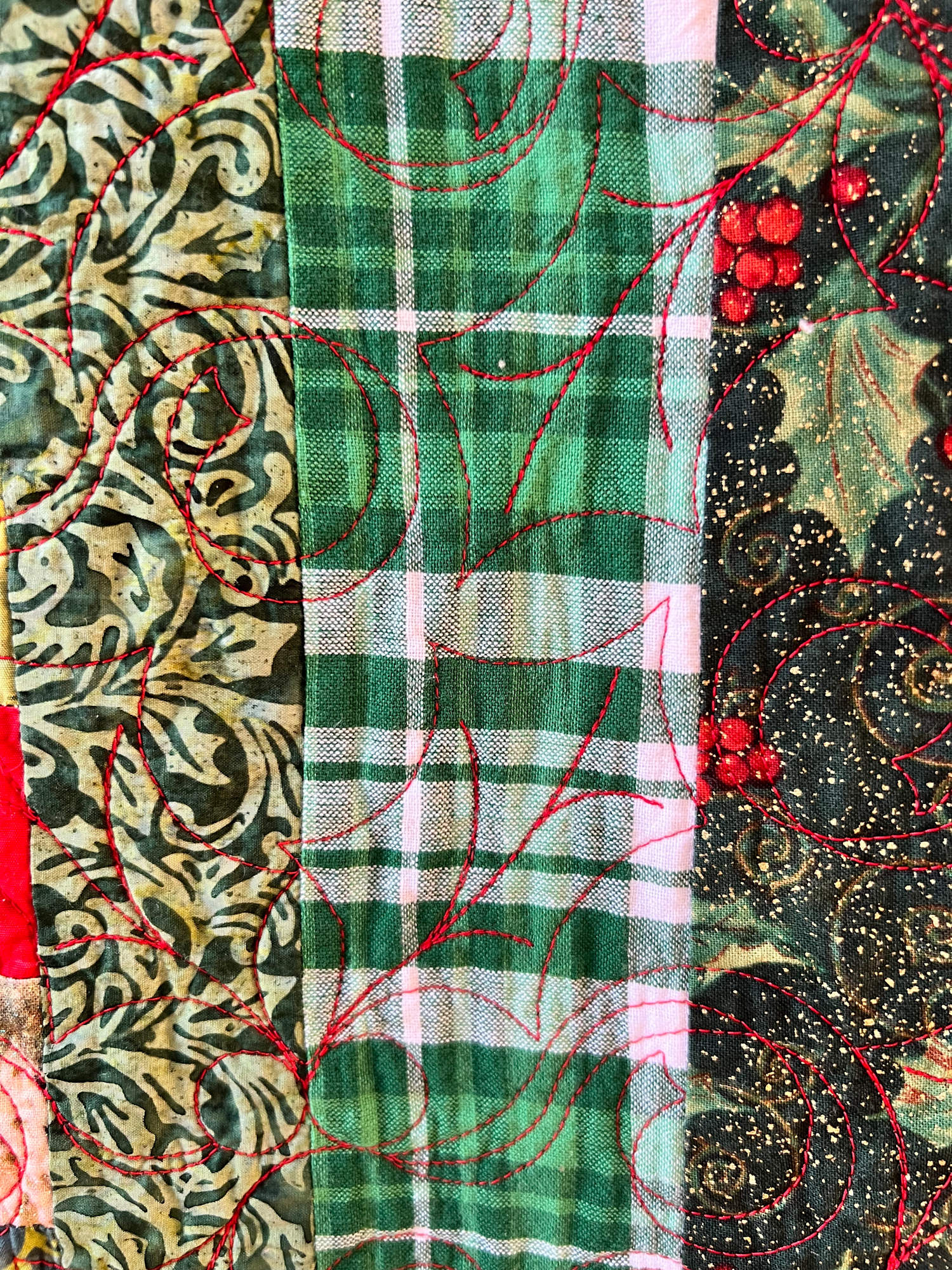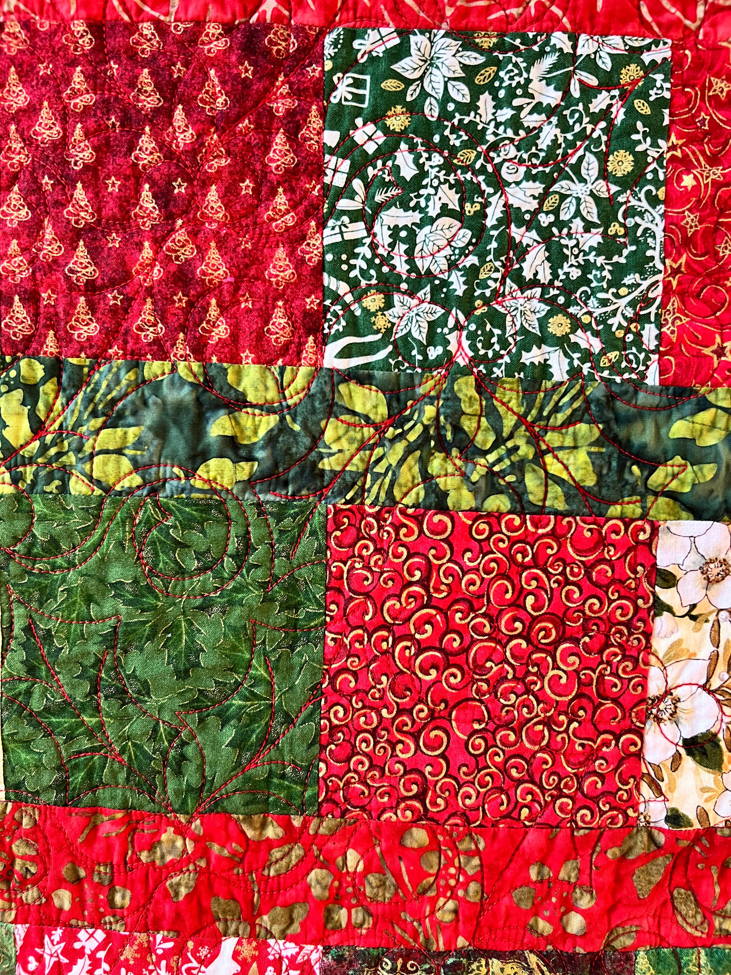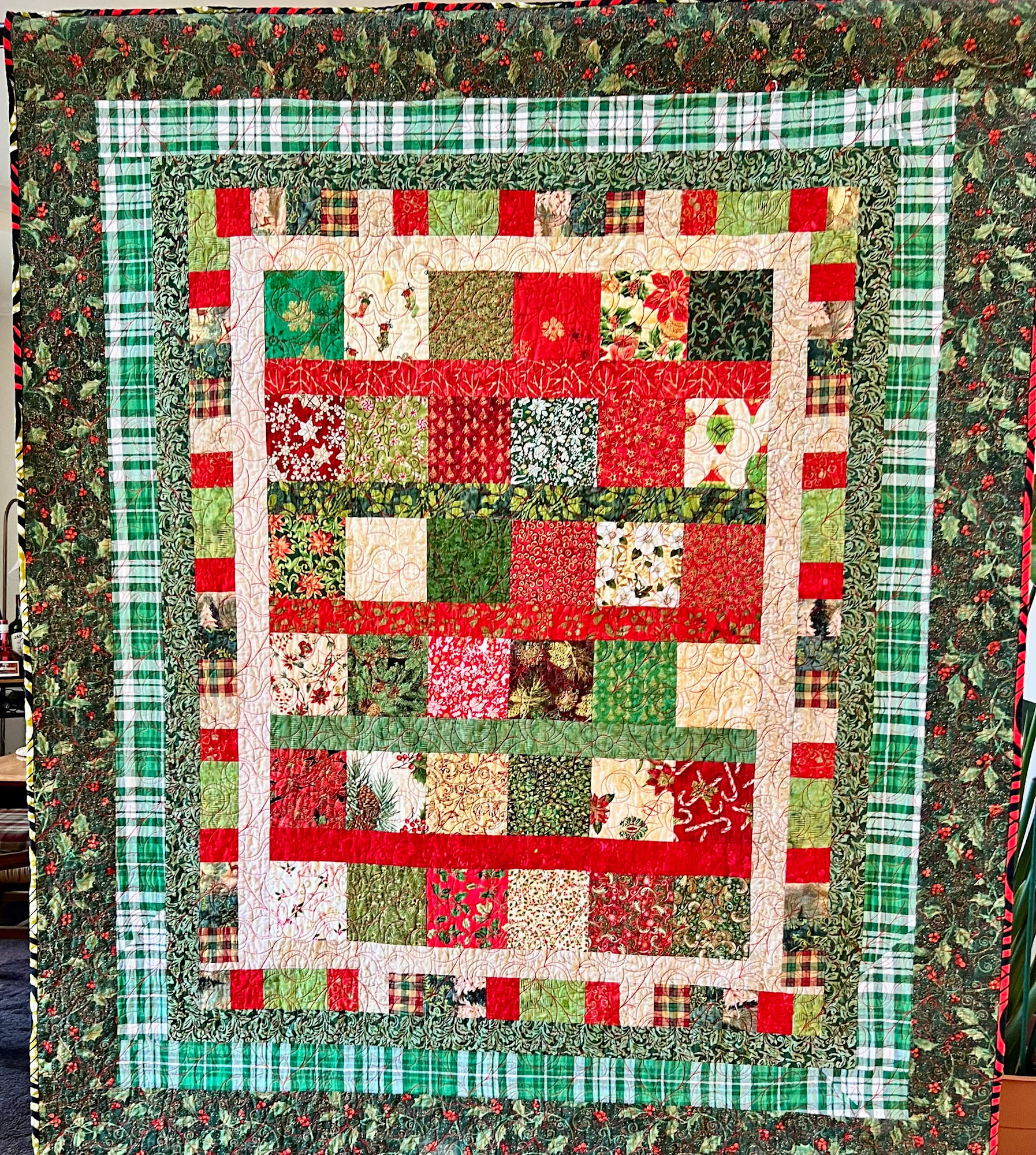 A Very Berry Christmas is my 2025 addition to my Christmas quilt collection. It is comprised of traditional Christmas fabrics which I love. The pattern is my composition reflecting traditional patchwork. The fabrics are the most important ingredient for a Christmas quilt. Even the simplest patterns can become heirlooms.