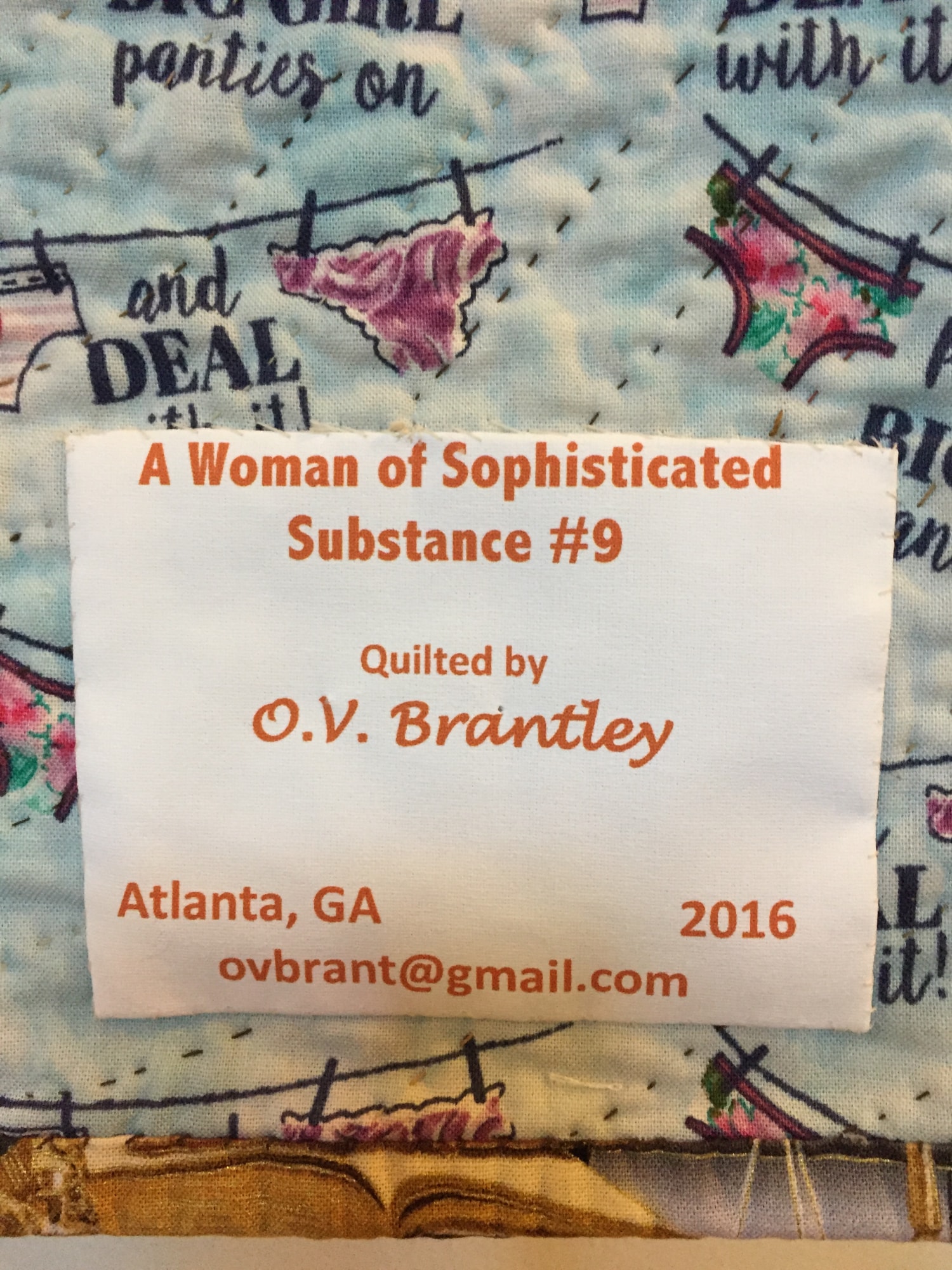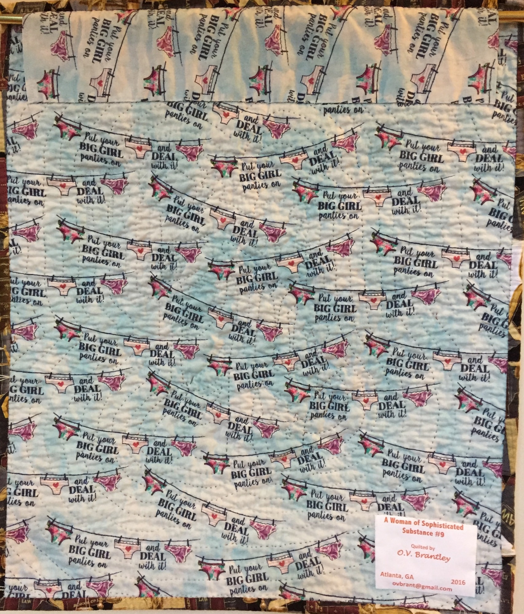 This piece features African women in the center block with a single inspirational word --courage. The border fabric has a Law theme. I lovingly quilted it by hand.