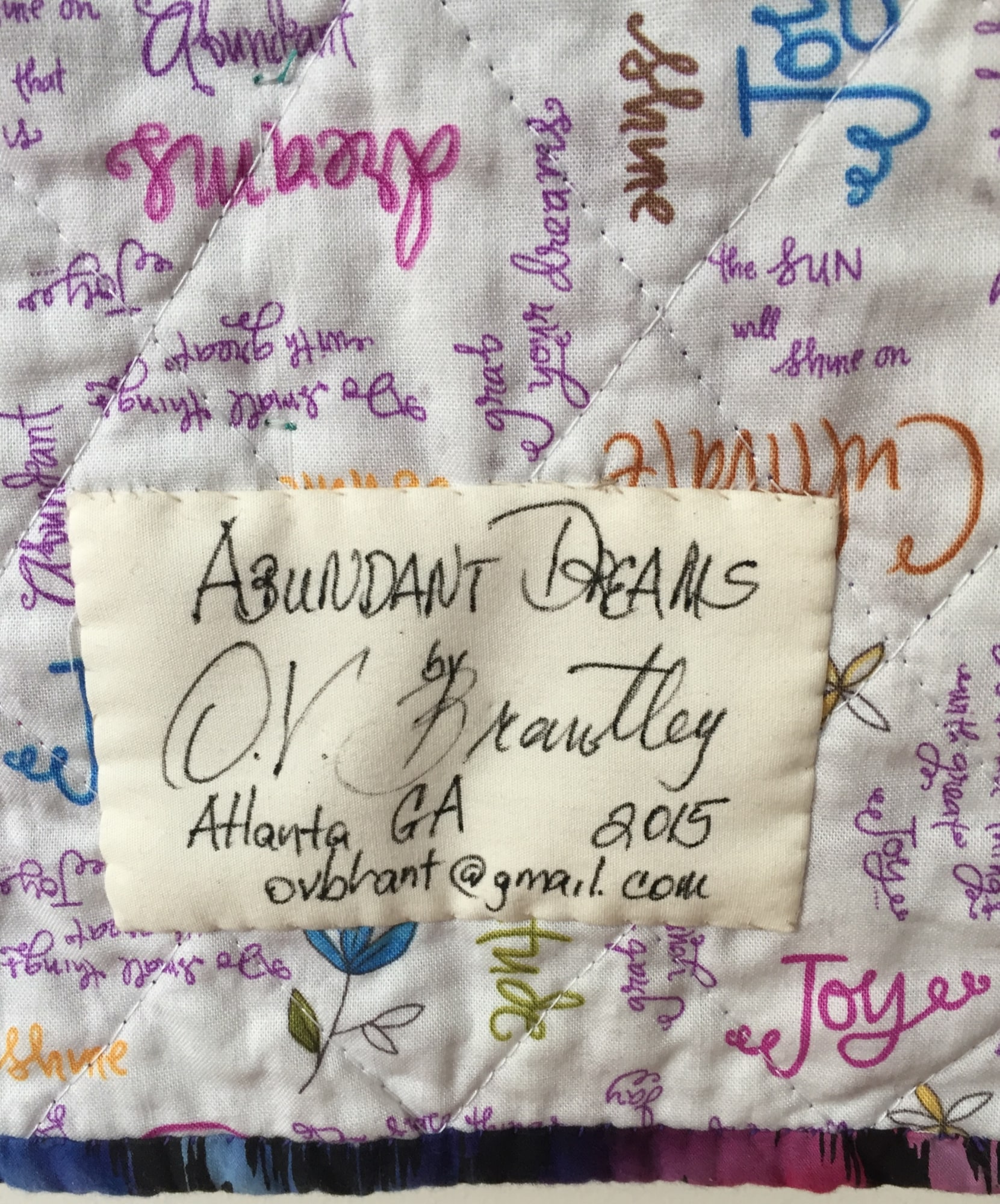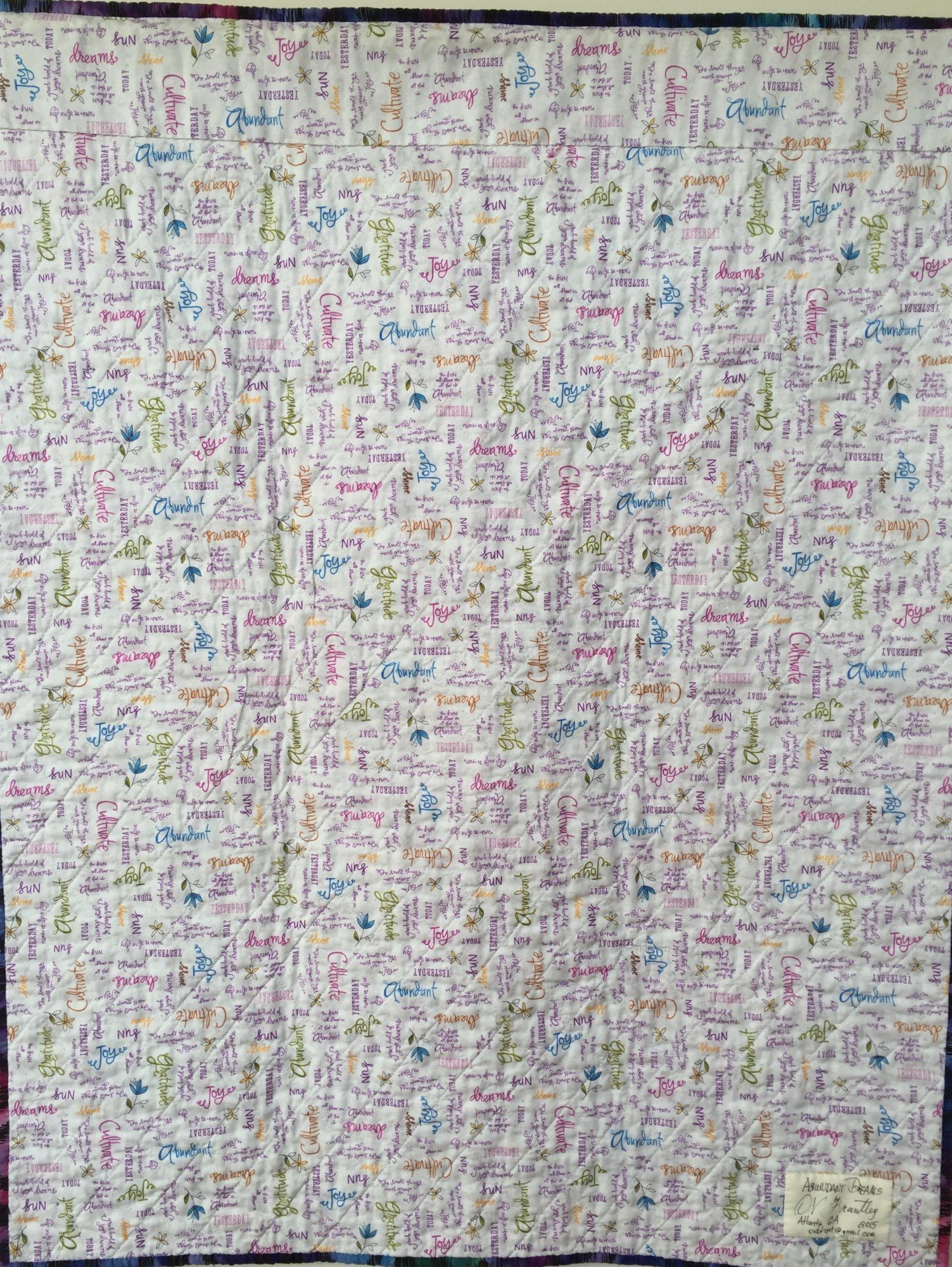 The fabric on the back of the quilt is filled with inspirational words. There is a label on the back that documents the quilt and a hanging sleeve for easy display.