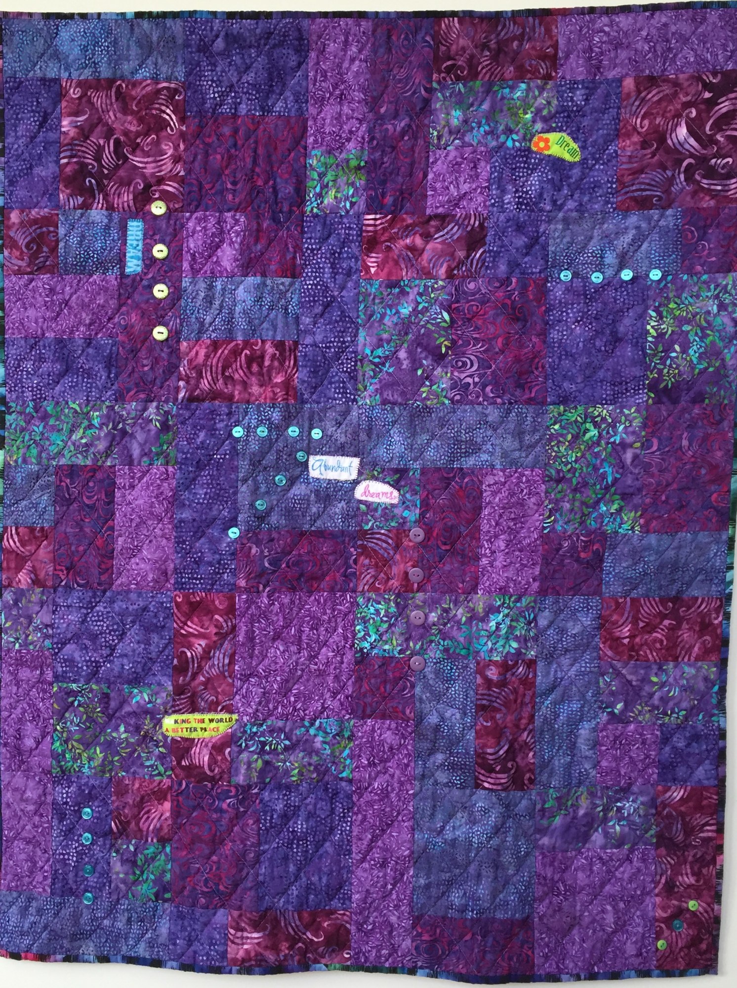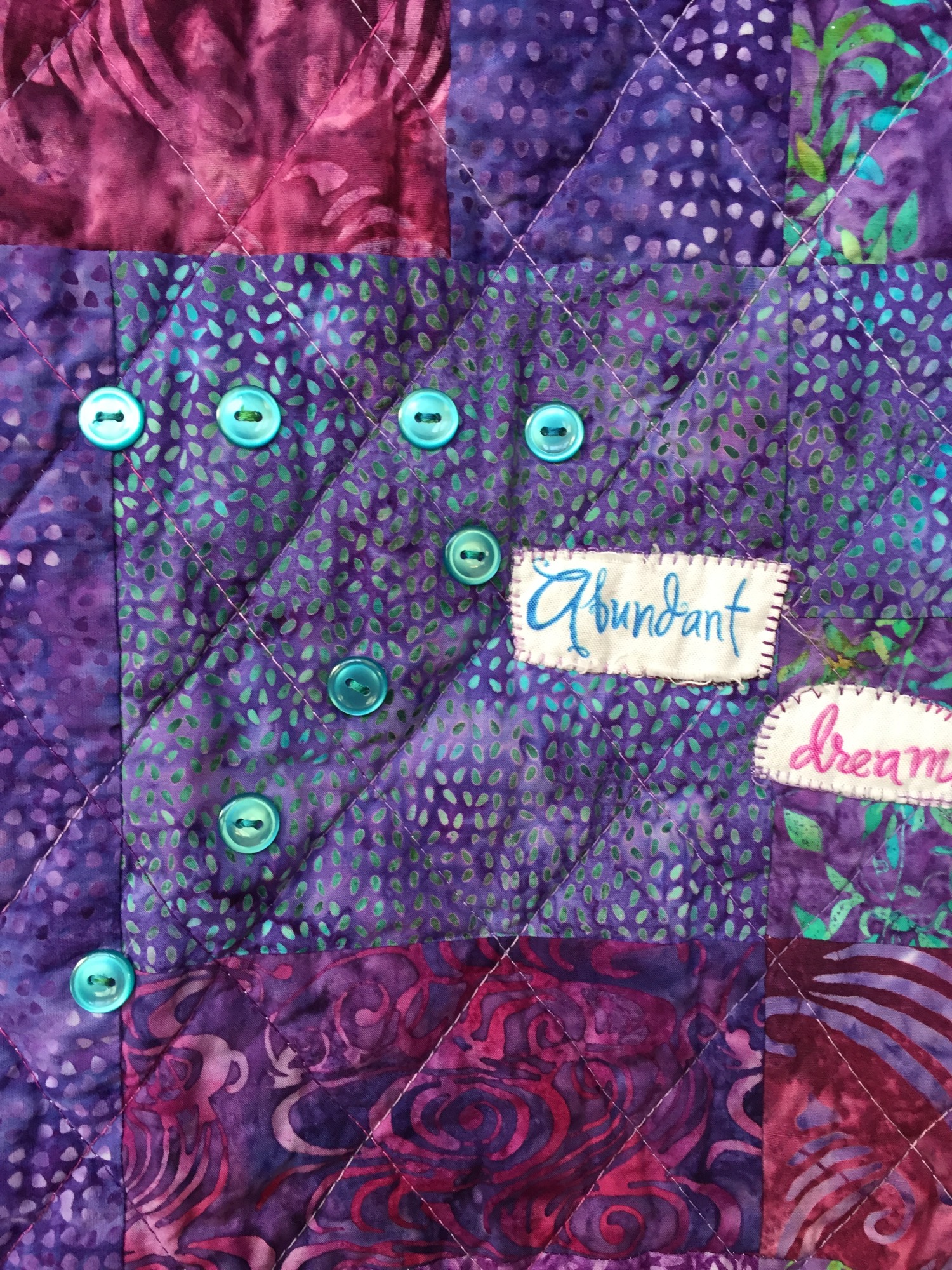 "Abundant Dreams" is an art quilt that measures 36x45 inches. It is made from a rich palette of purple batiks and embellished with buttons and words.