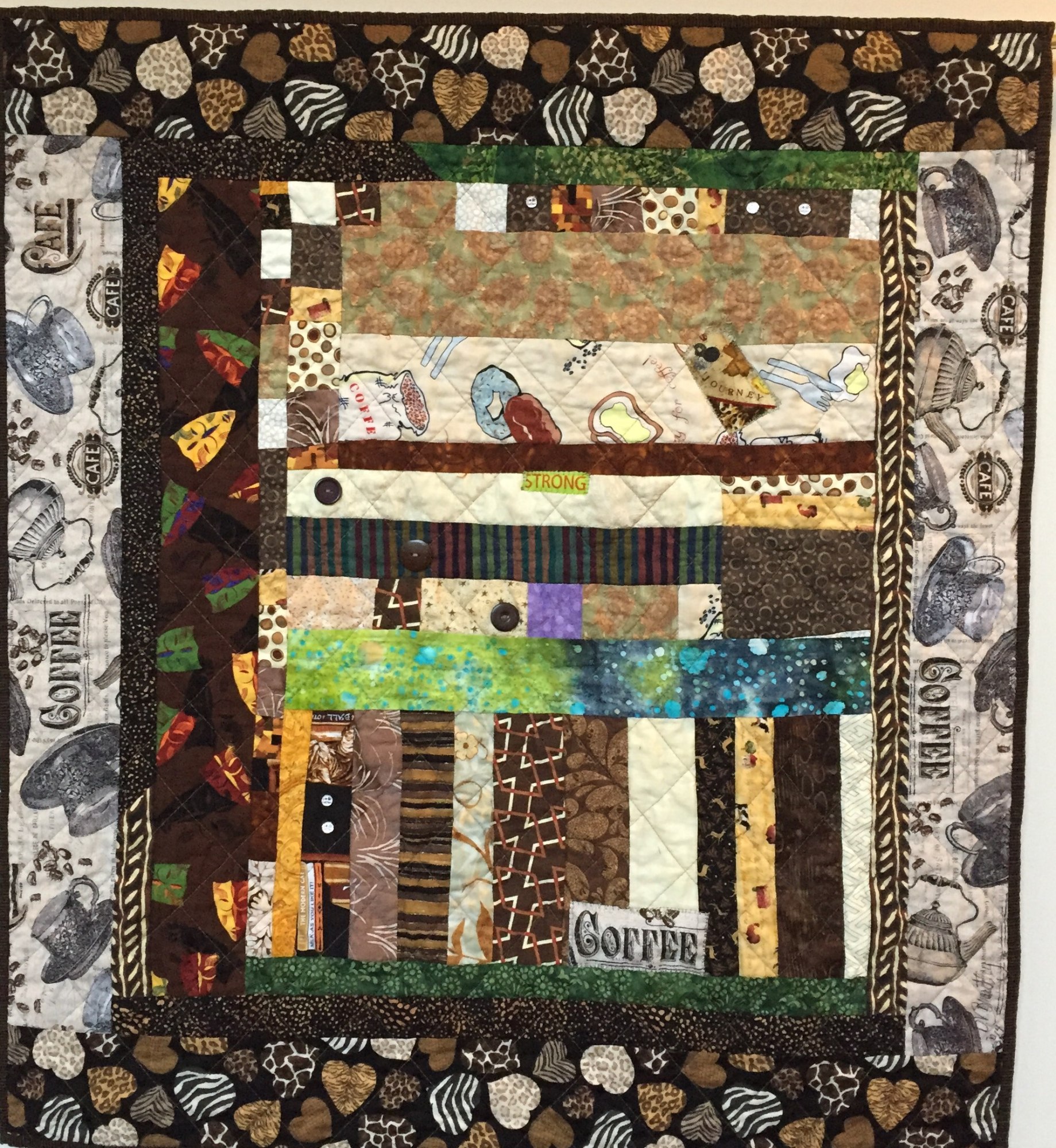 "After My Coffee" is a small quilted wallhanging that measures 30x33 inches. It is done in brown and cream neutrals with coffee motifs throughout and embellished with charms and buttons.