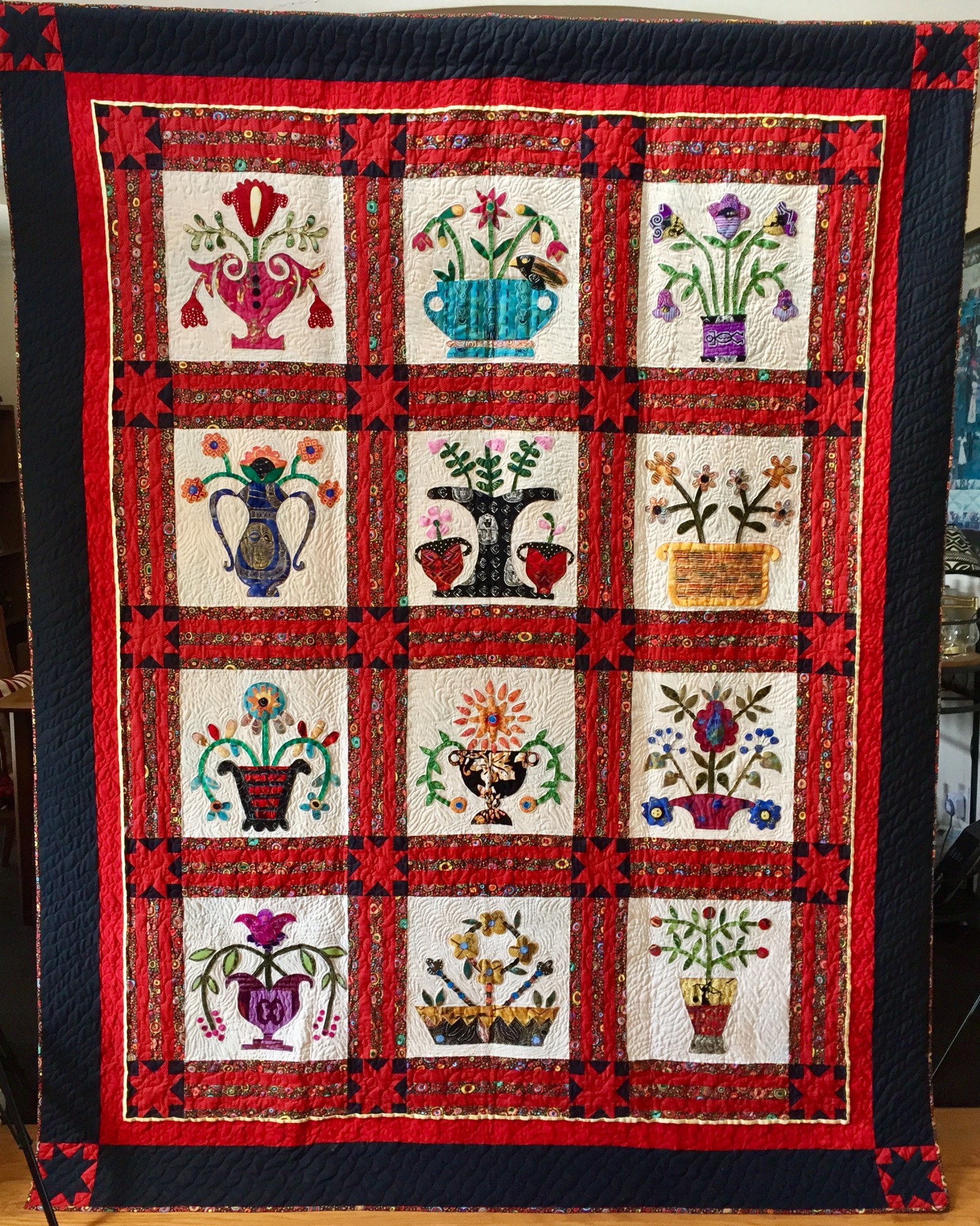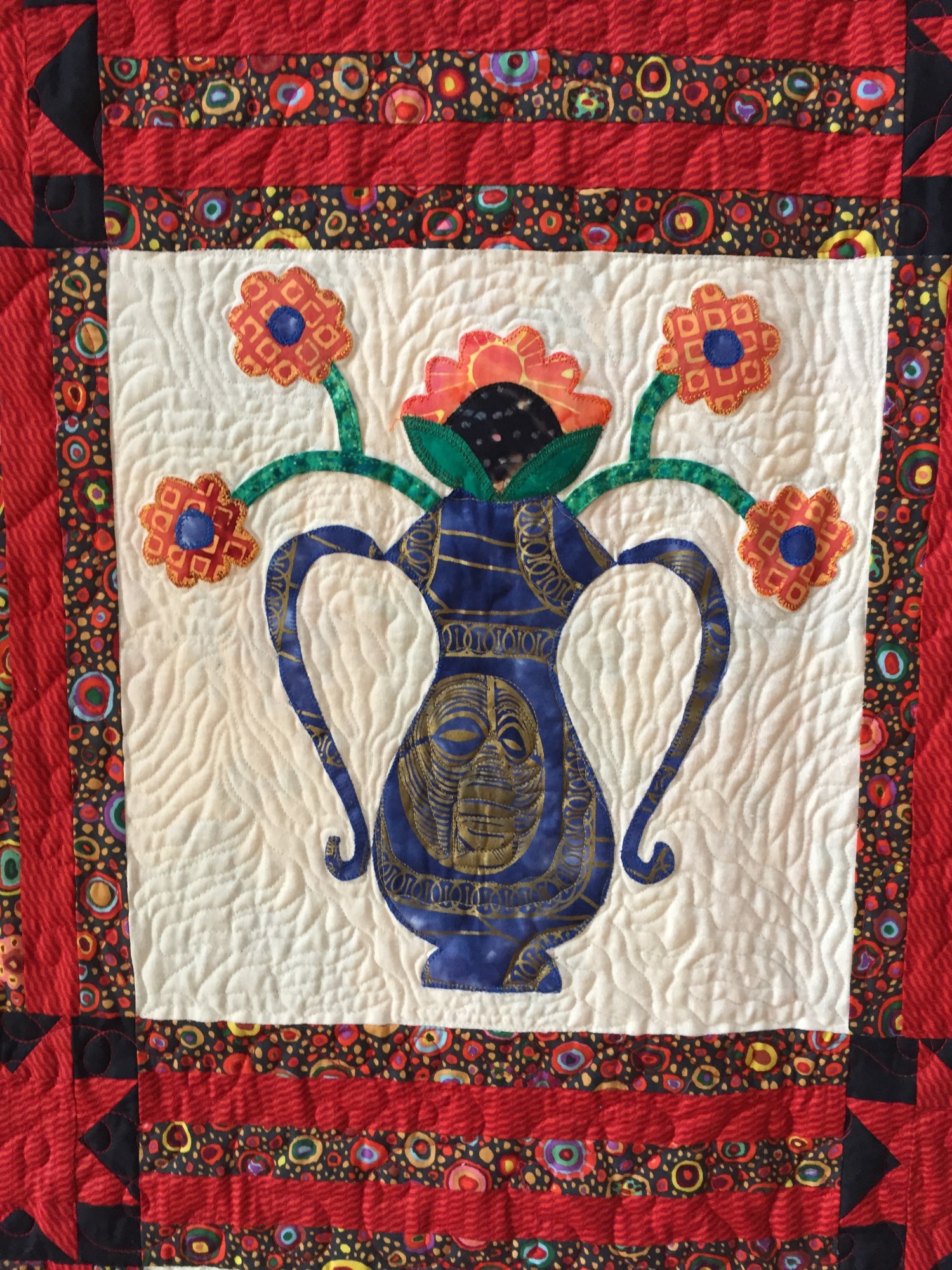 Applique sampler quilt with an emphasis on African fabrics. Custom quilted. Piping border.