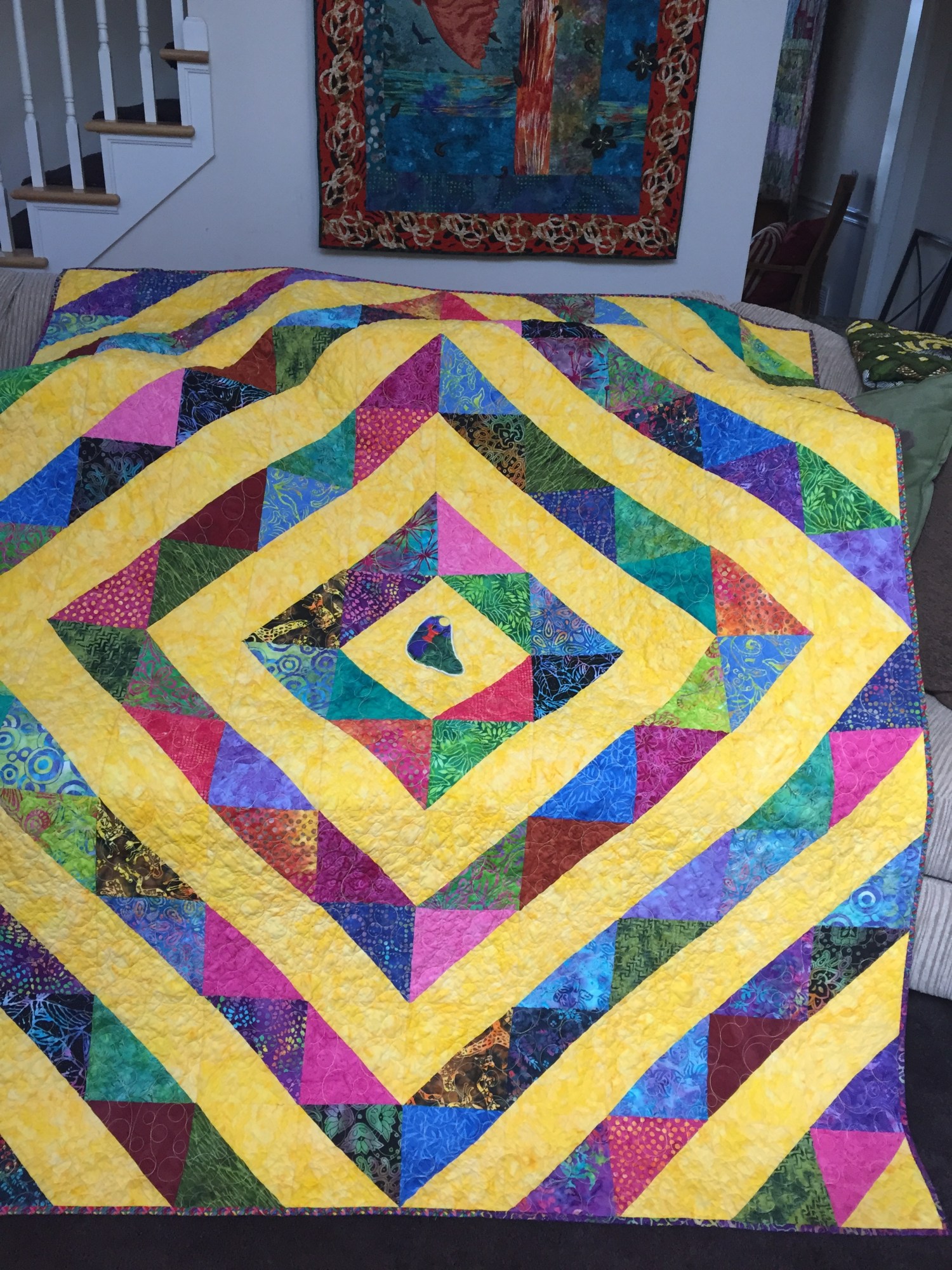 Because of its size, "Awaken!" can function as a lap quilt or a wallhanging. It is machine pieced and quilted.