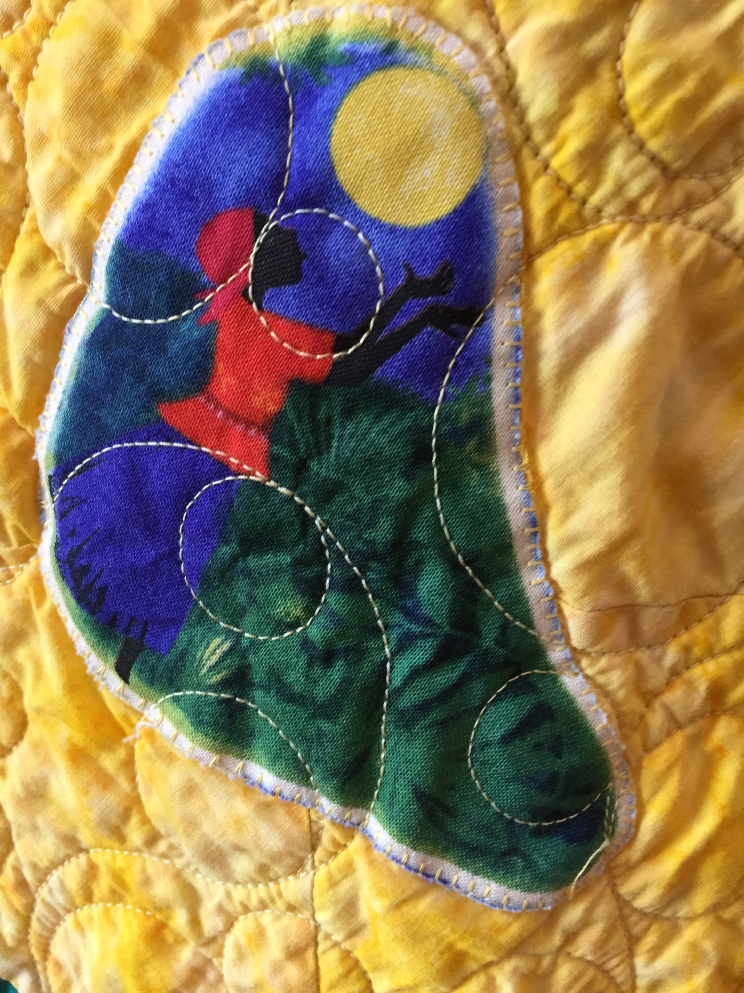 "Awaken!" is a brightly colored quilt that measures 60x72 inches. The bright colors seem to demand that you wake up and get going and that you do so happily. In the center of the quilt, an African woman looking up at the sun carries out the theme. The African woman was created by Julia Cairns for Timeless Treasures fabrics.