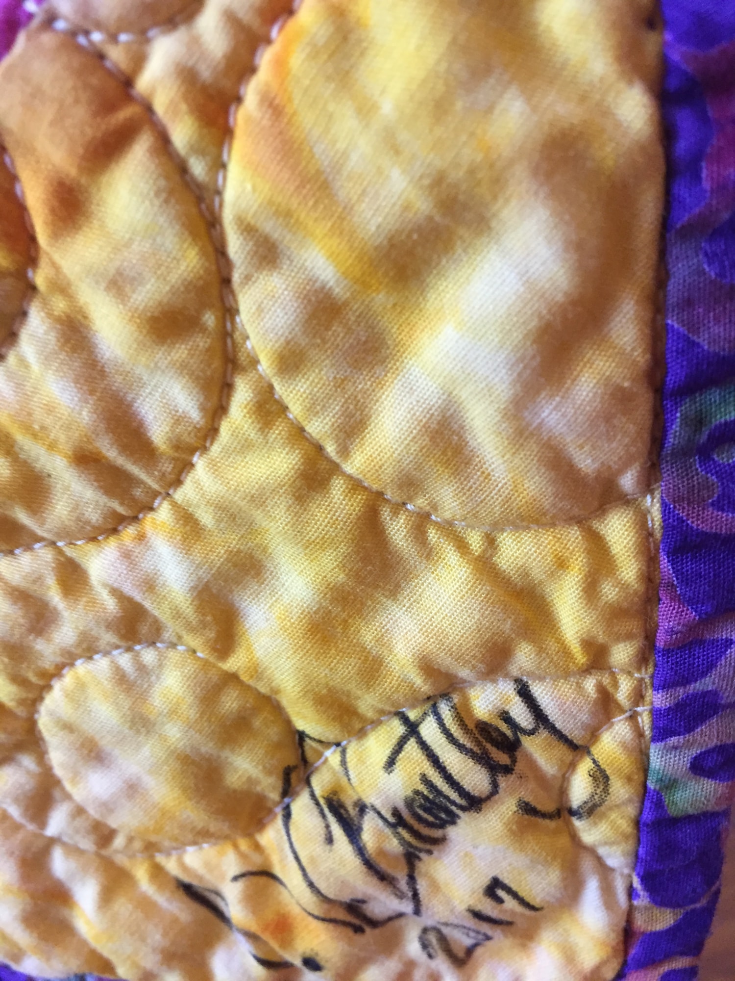 The fabric on the back is a bright orange and yellow African fabric. There is a hanging sleeve on the back in case you want to hang it, and a label that documents the quilt. I signed it on the front.
