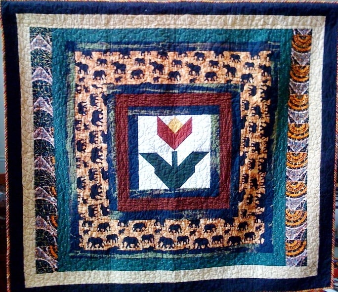 Awesome African Elephants in My Garden #3 has a majestic rust colored flower in the center framed by several borders, including a herd of elephants. This quilt measures 55 x 49 inches and is accented by a bright striped binding that contains all the colors in the quilt. There is a herd of elephants on the back of the quilt, as well as, a hanging sleeve for easy display. The quilt is signed and dated by quilter O.V. Brantley.