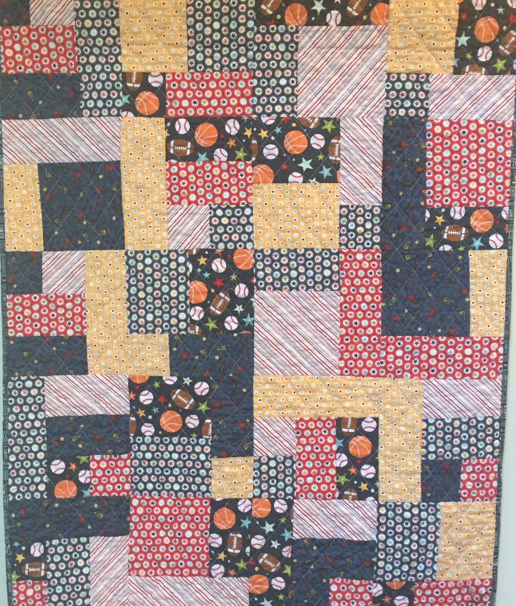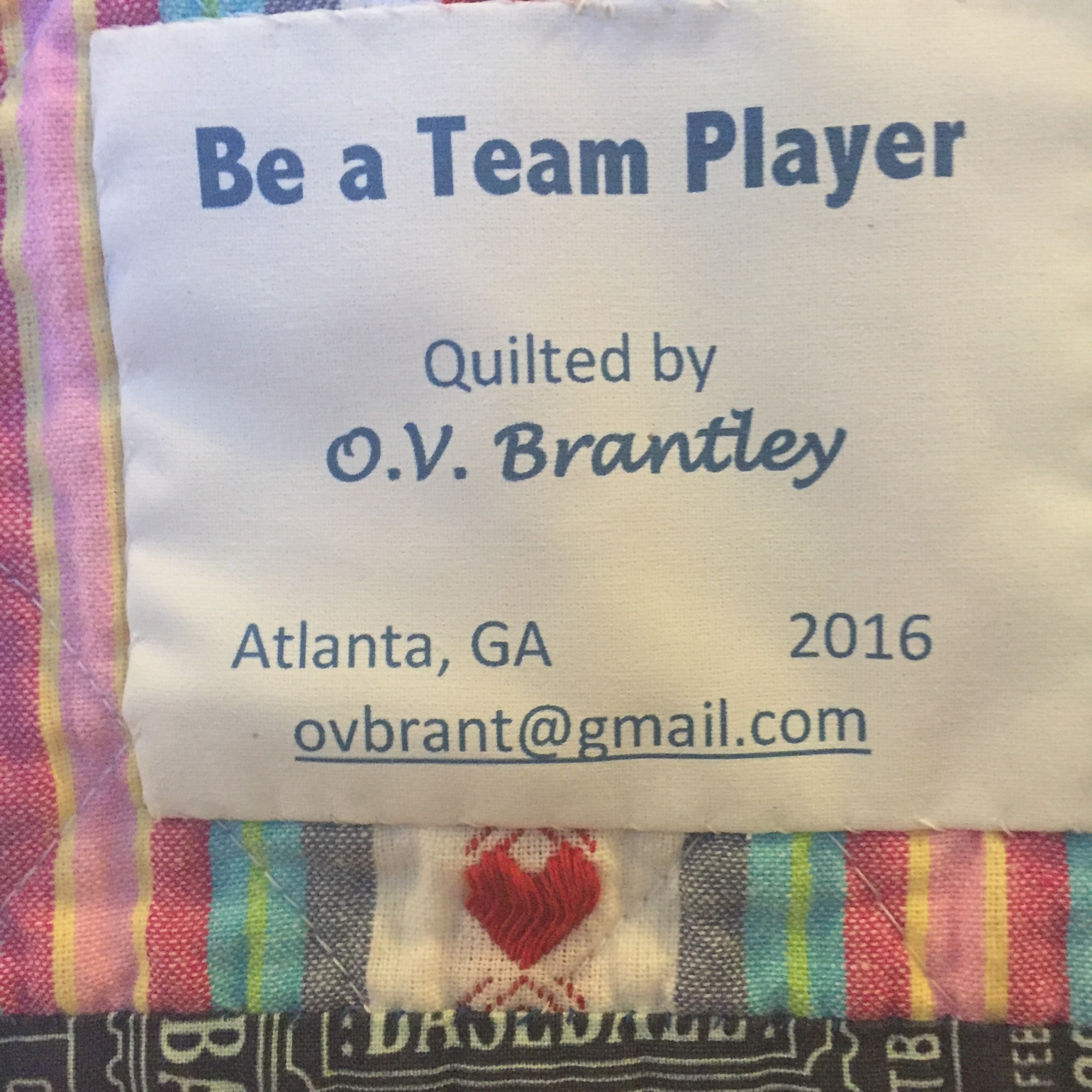 "Be A Team Player" is a quilted wallhanging or a baby quilt that measures 36x45 inches. It is machine pieced and quilted. The fabrics have an all sports theme. The dominant color is blue.