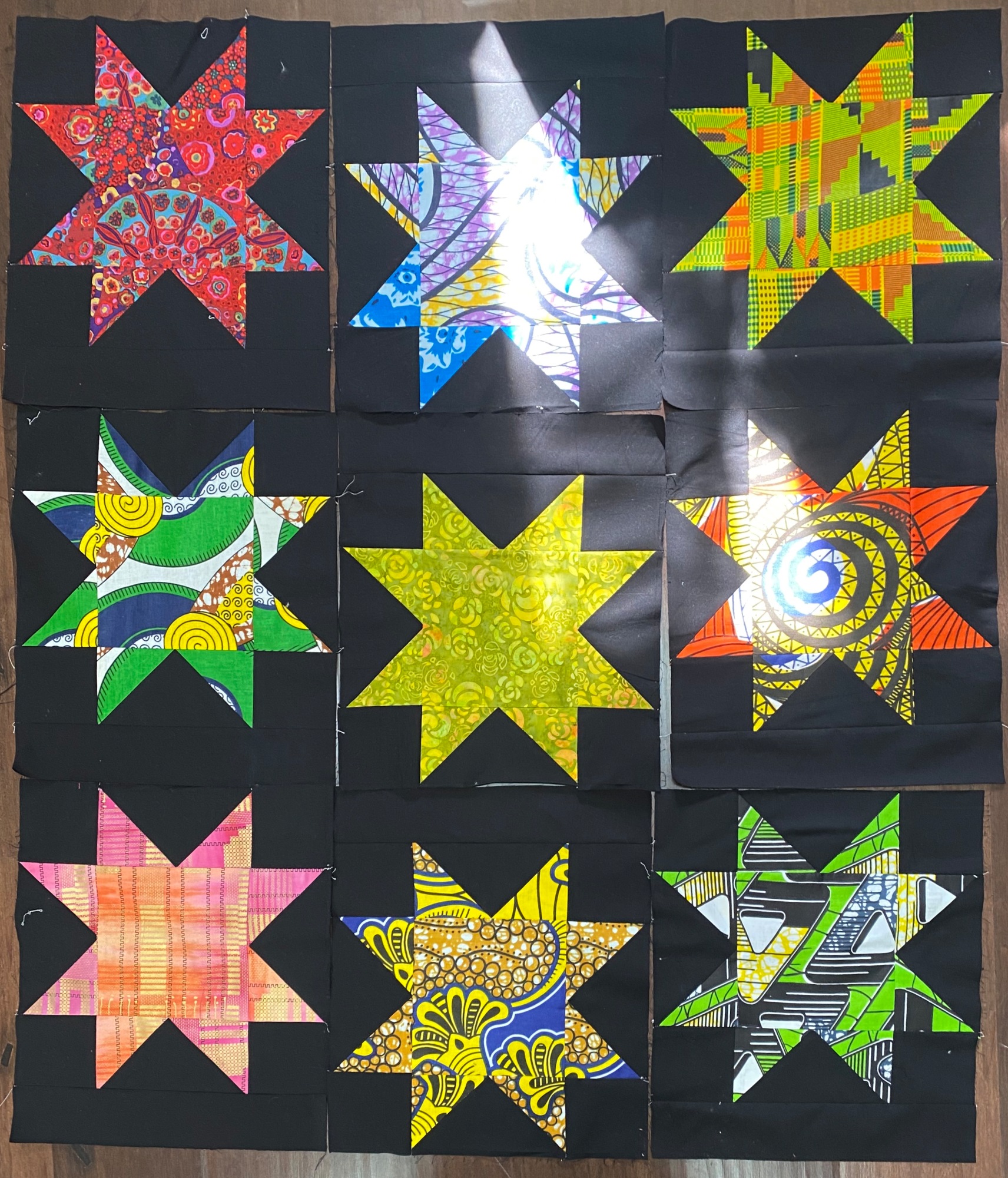 The fabric on the back is a bright African stripe fabric. A label documents the quilt. This quilt is one-of-a-kind. I hope you like it.