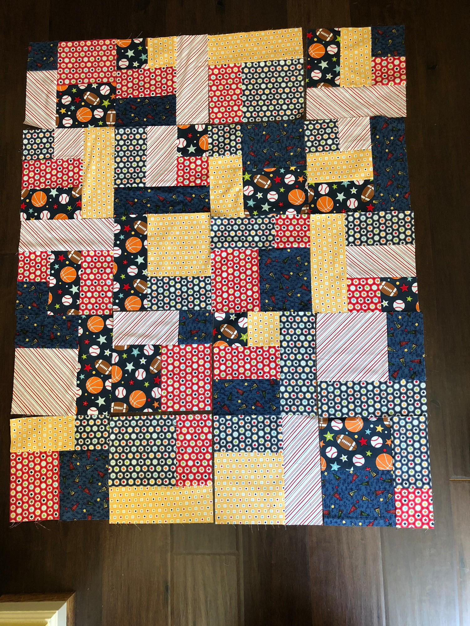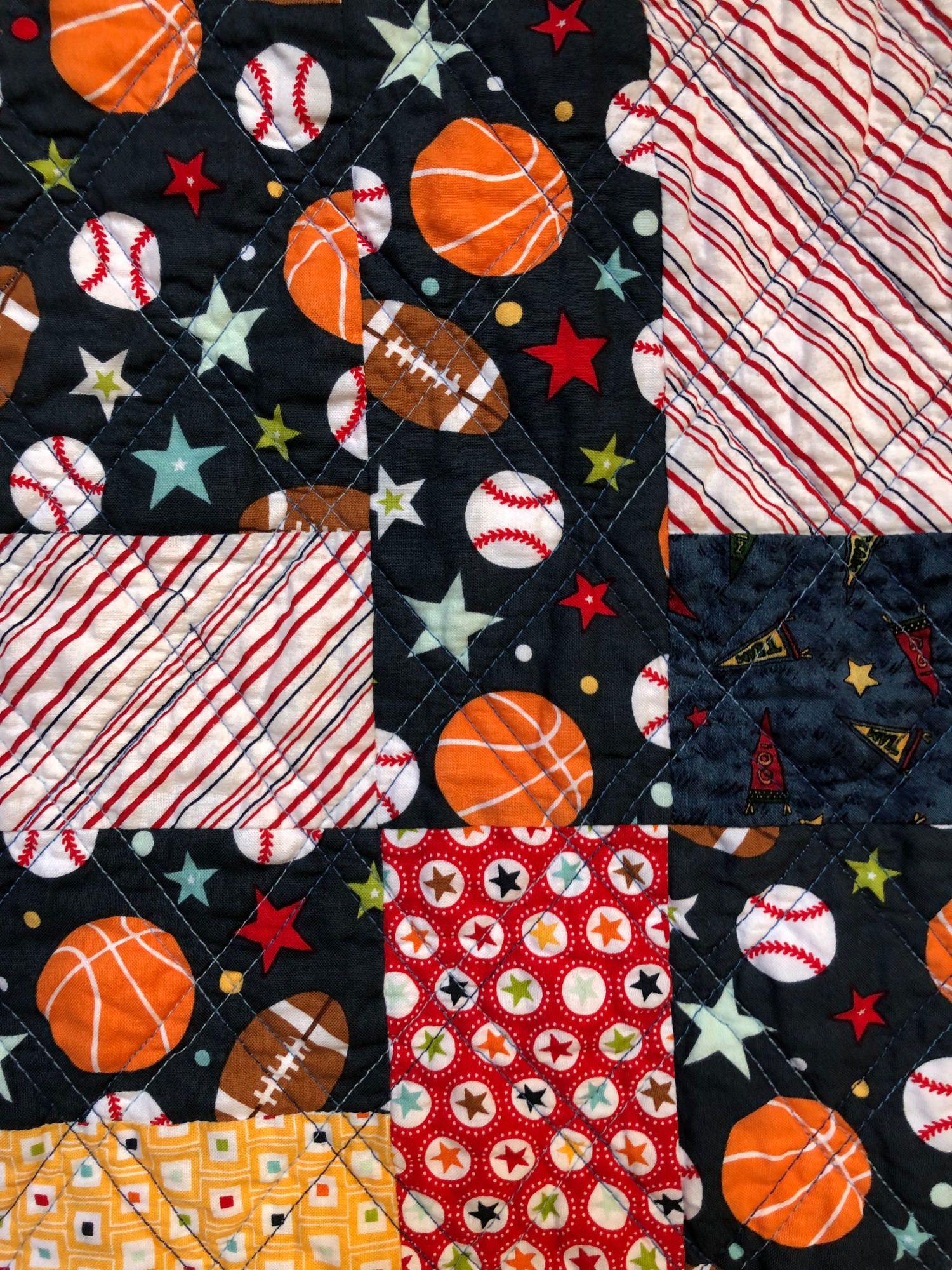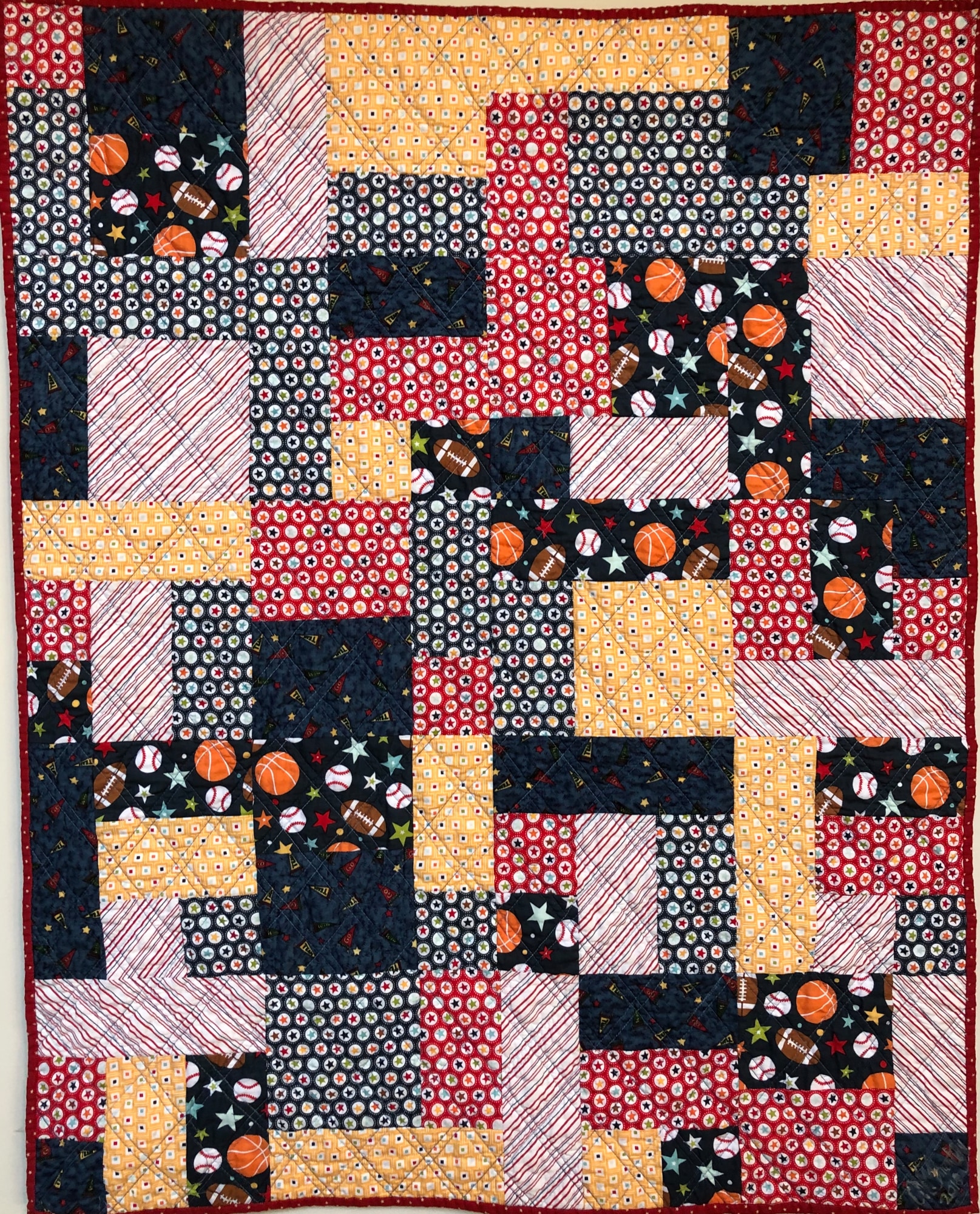 “Be the Team Captain” is a baby quilt that can also function as a wallhanging. The fabric in the quilt has a sports theme colors in reds and blues. It measures 34x42 inches. I pieced and quilted it on my machine.
