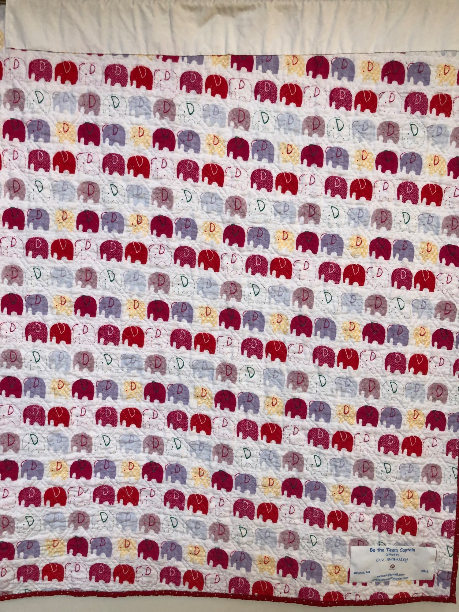 The back of the quilt has an elephant print which symbolizes strength. There is a hanging sleeve in case you want to hang it. A label documents the quilt.