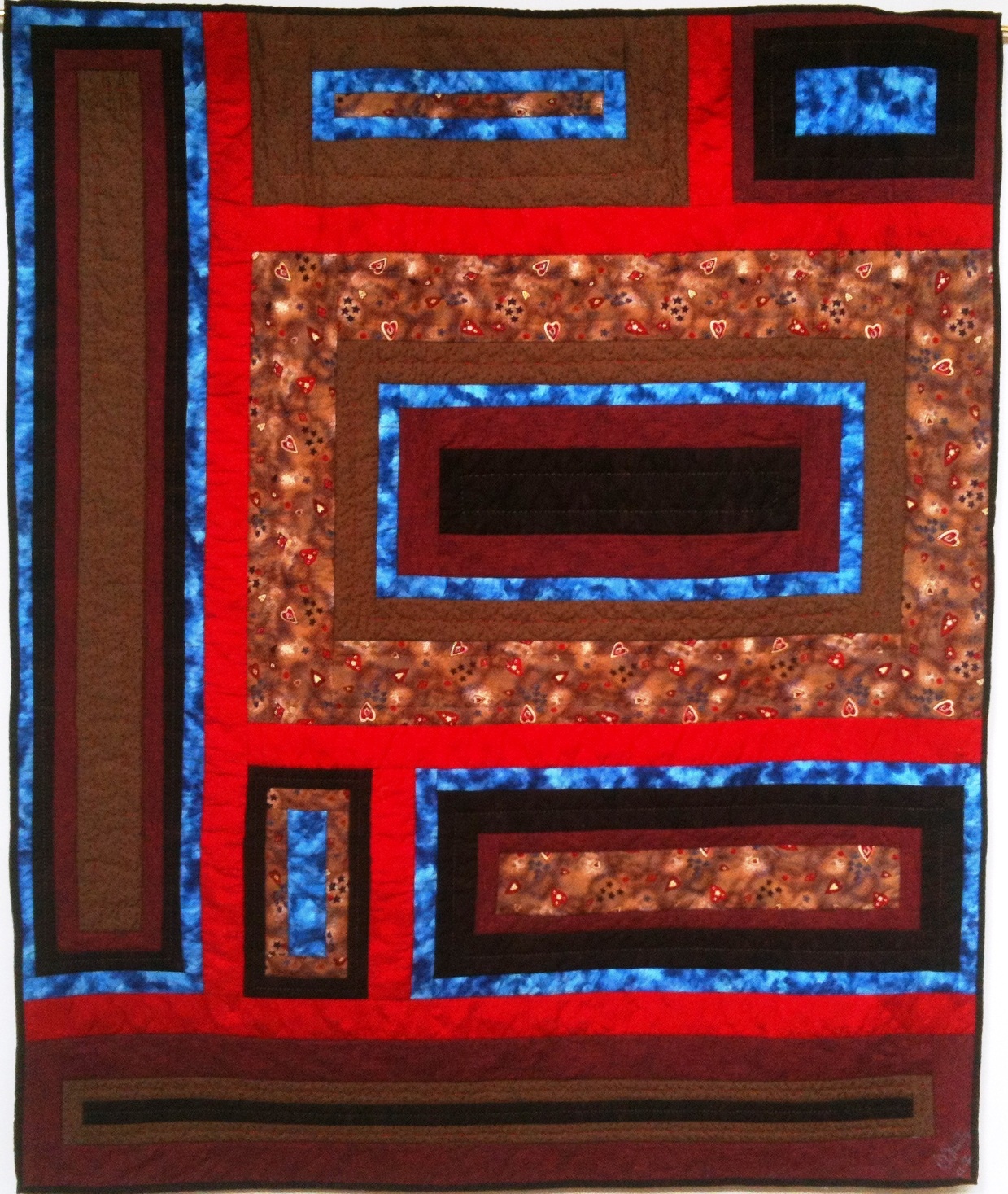 Blue Heart is a quilted wallhanging that measures 44 x 52 inches. The dominant colors are brown, red and blue. The quilt is embellished with big stitches in red thread on the brown fabric done by hand.