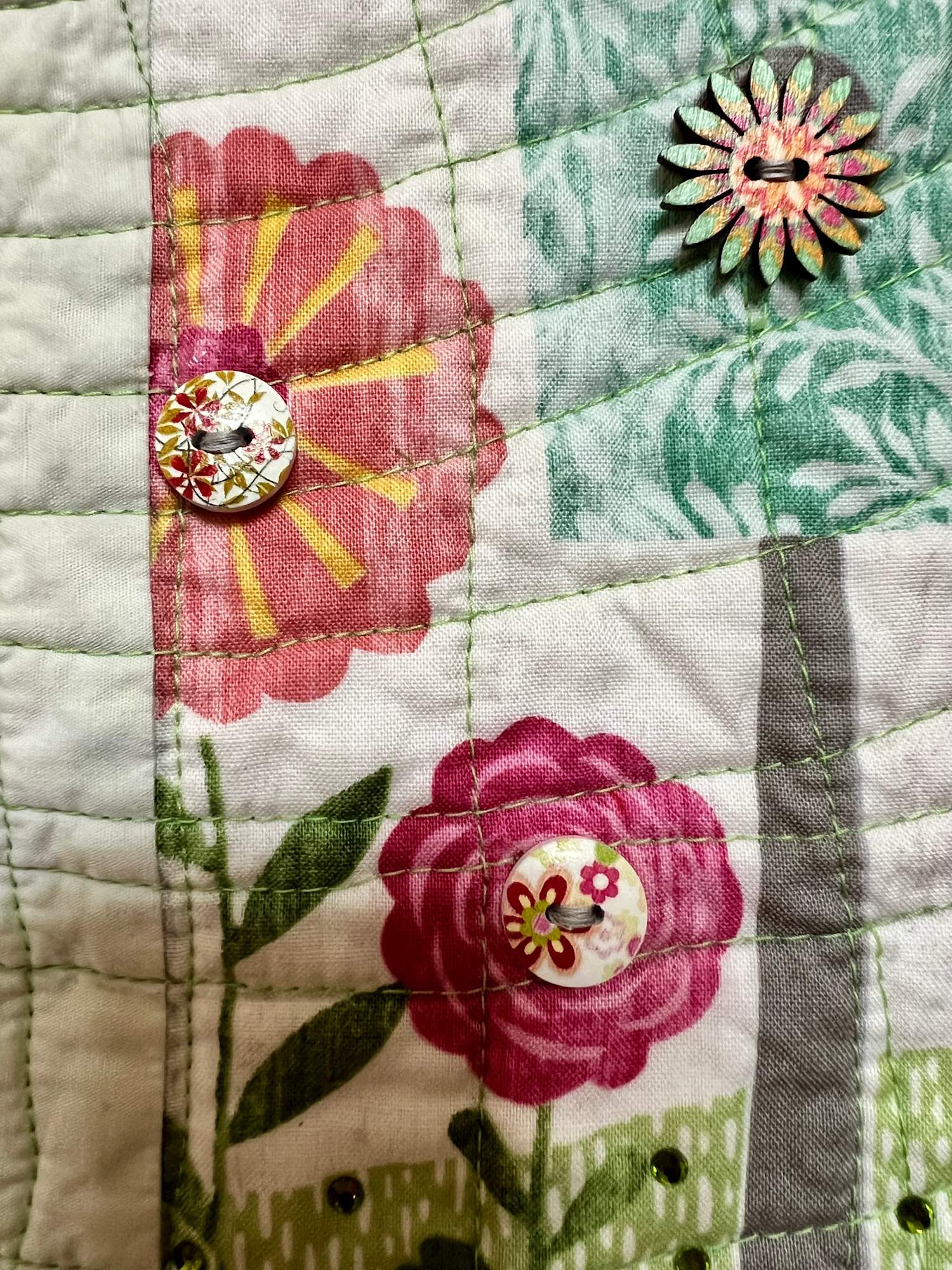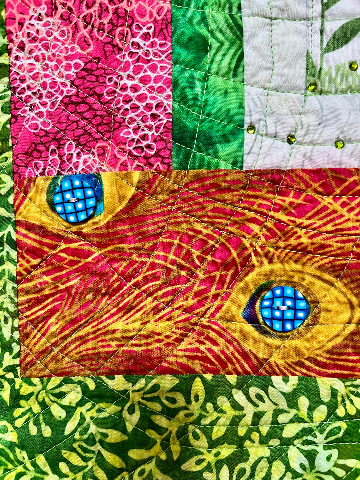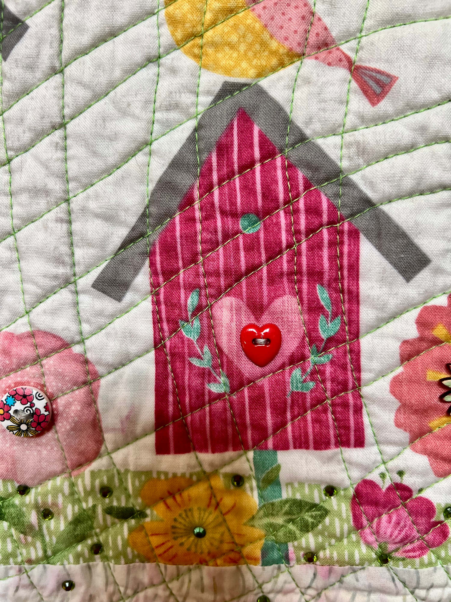 The quilt measures 26 X 26 inches. The dominant colors are pink and green. I pieced and quilted Choose Happy #4 on my Janome sewing machine. After it was quilted, I embellished “Choose Happy #4” with painted buttons, crystals and a charm.
