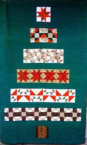 Traditional row by row quilt that forms a Christmas tree.