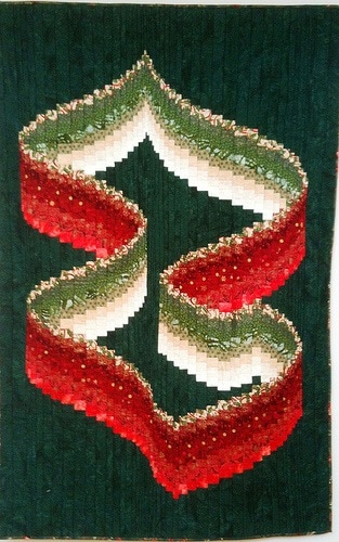 Christmas Ribbons is a stunning Bargello quilted wallhanging that measures 37 x 57 inches. It features red and green fabrics on a dark green background. It is machine pieced and quilted.