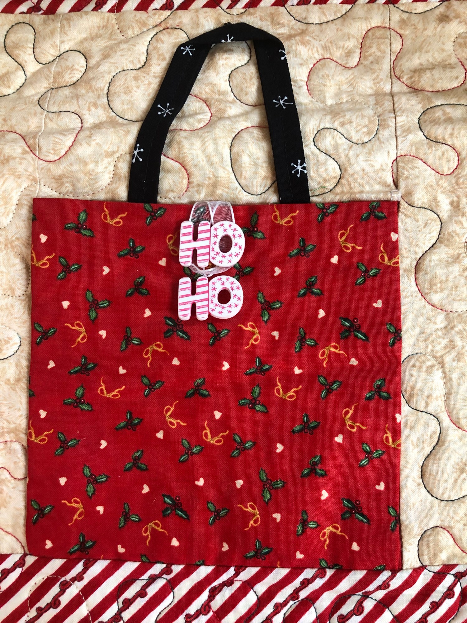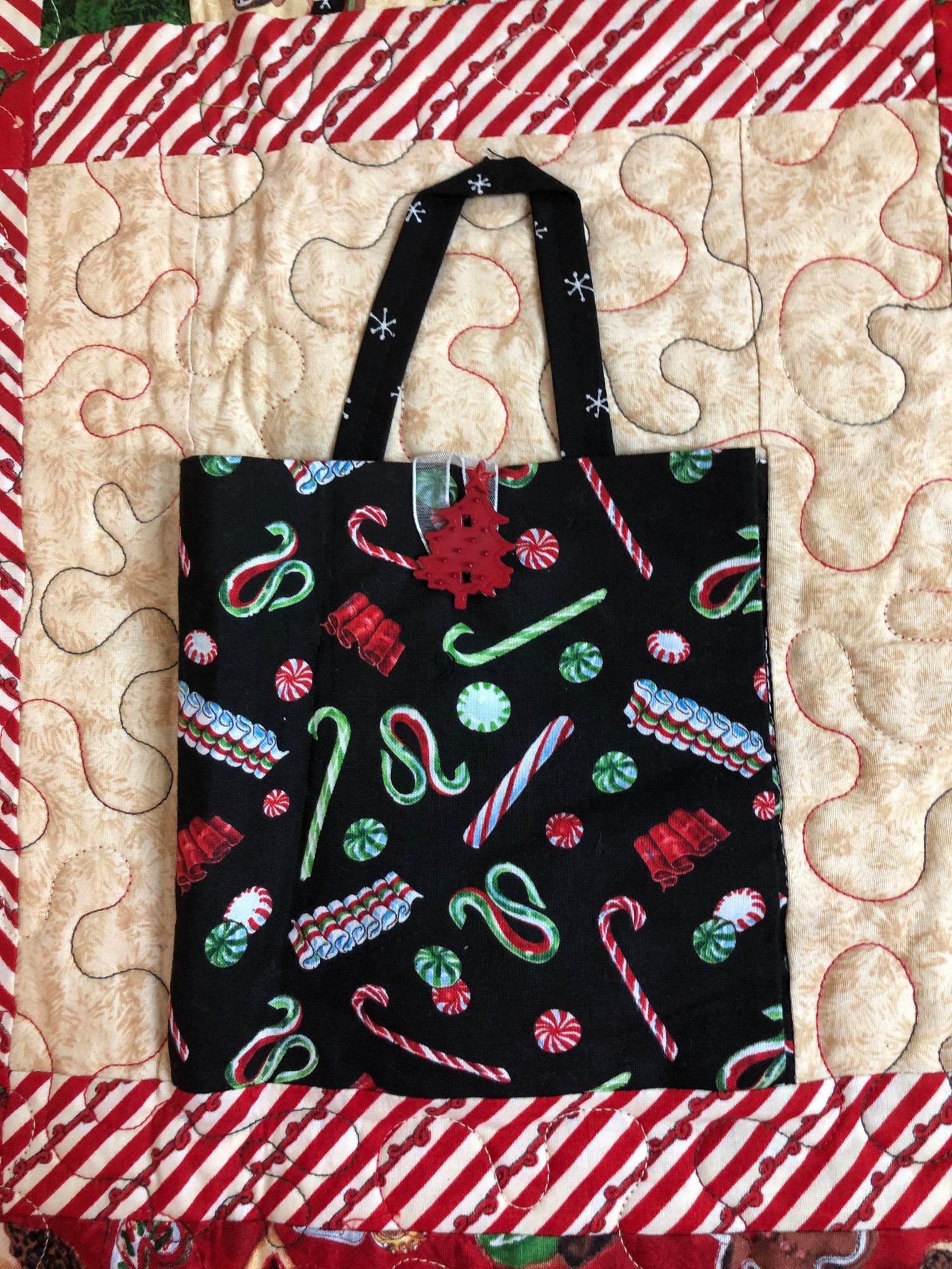 "Christmas Shopping" speaks for itself. It is a quilted wallhanging composed of 9 party bag blocks. It is machine quilted and embellished with holiday buttons.