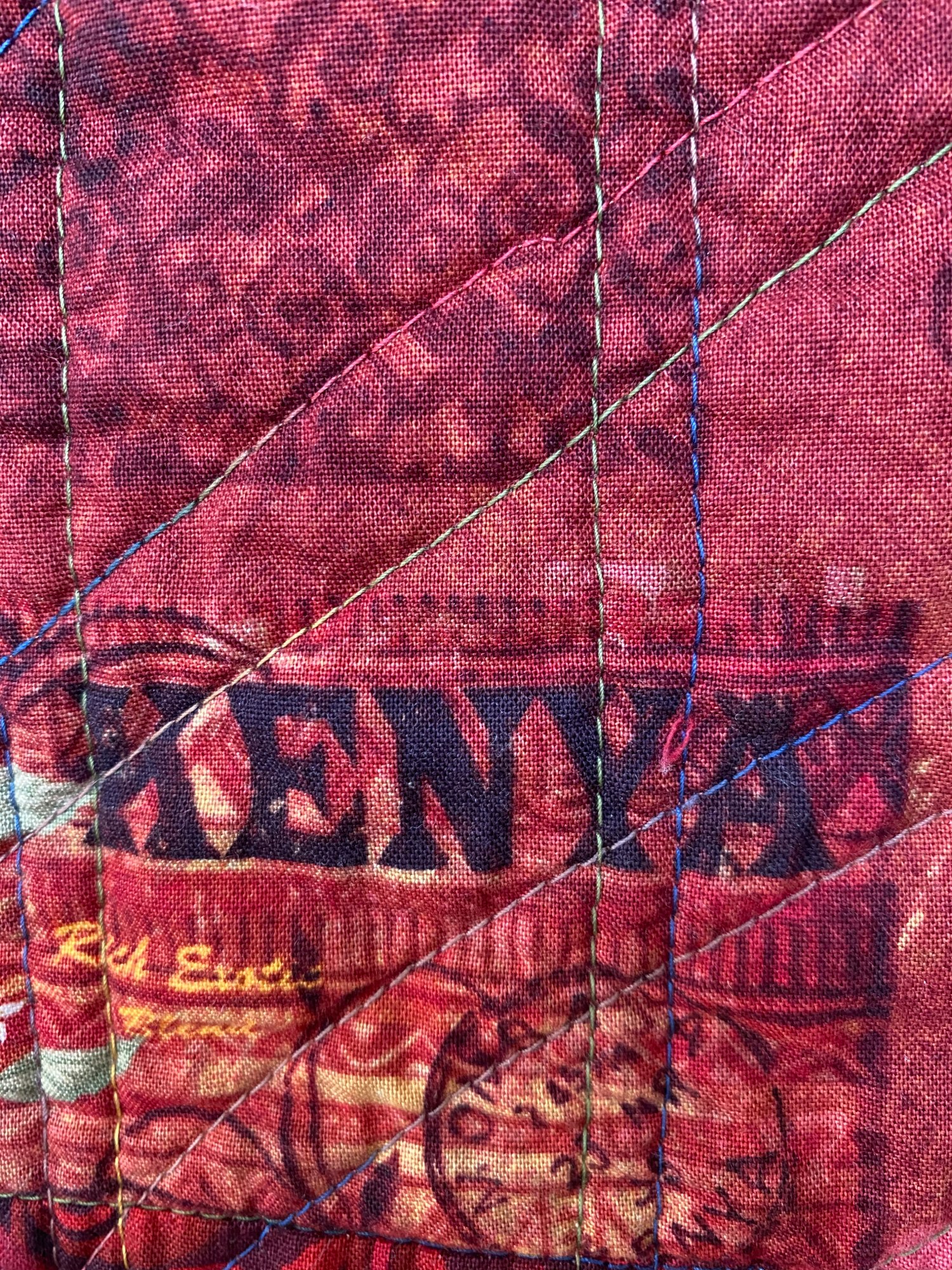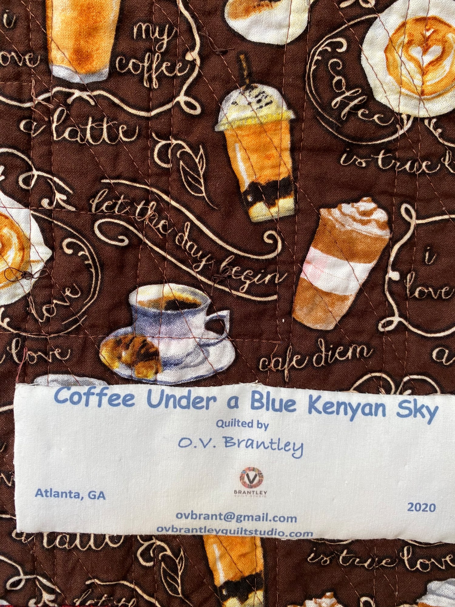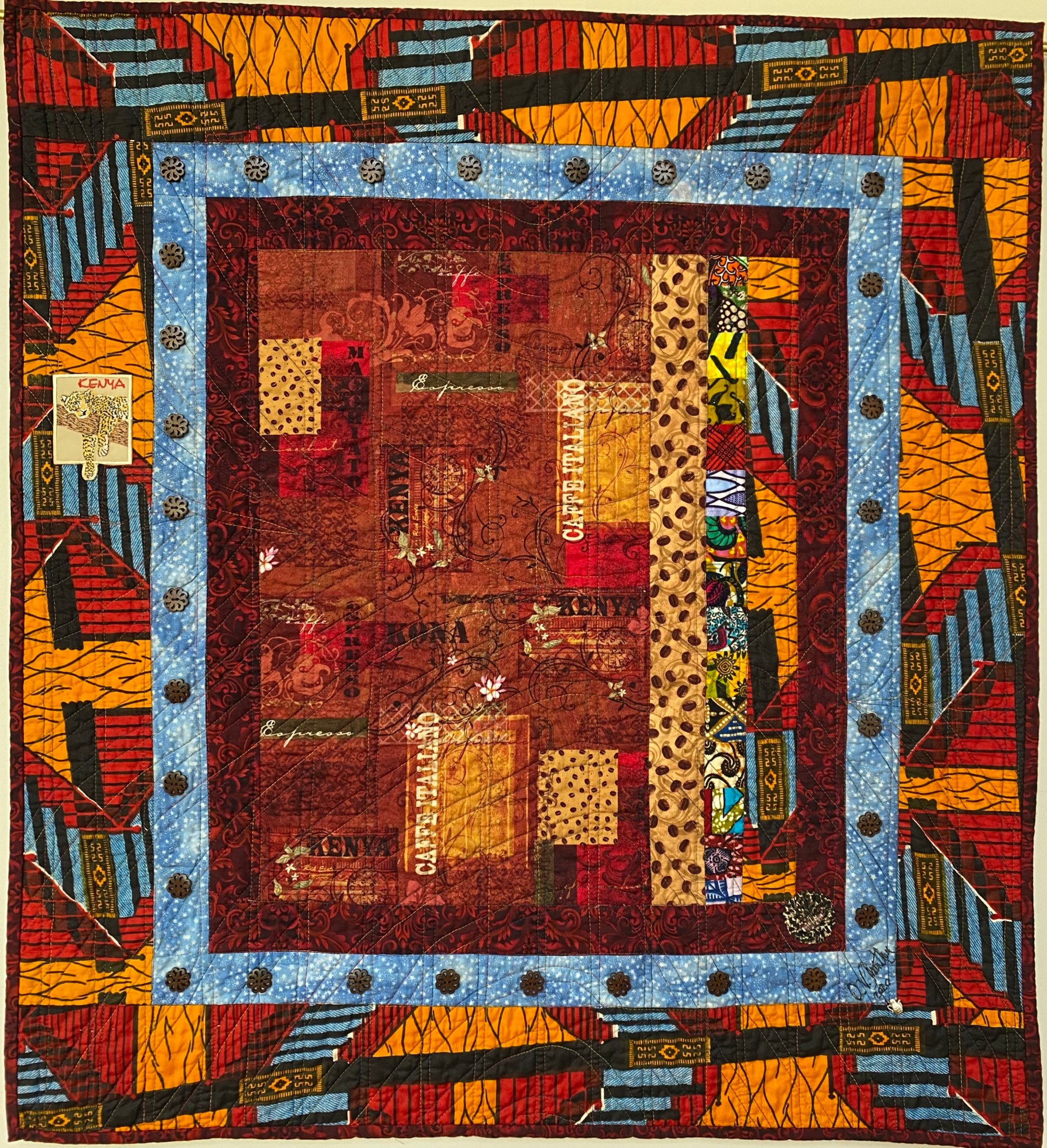 “Coffee Under a Blue Kenyan Sky” is a quilted wallhanging that measures 32x35 inches. I pieced and quilted it on my Janome sewing machine with variegated thread.