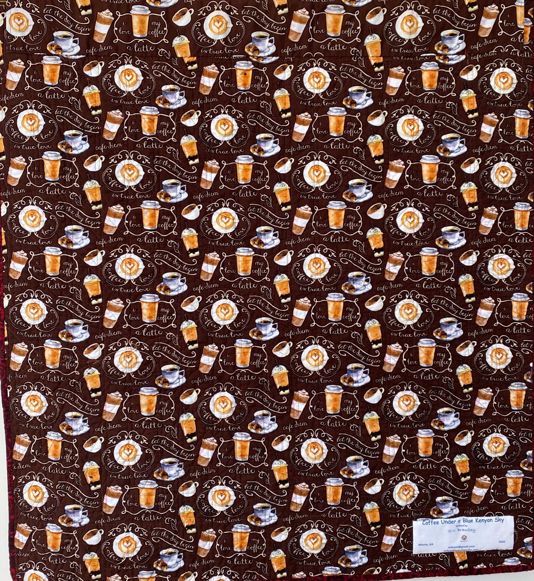 “Coffee Under a Blue Kenyan Sky” is a quilted wallhanging that measures 32x35 inches. I pieced and quilted it on my Janome sewing machine with variegated thread.