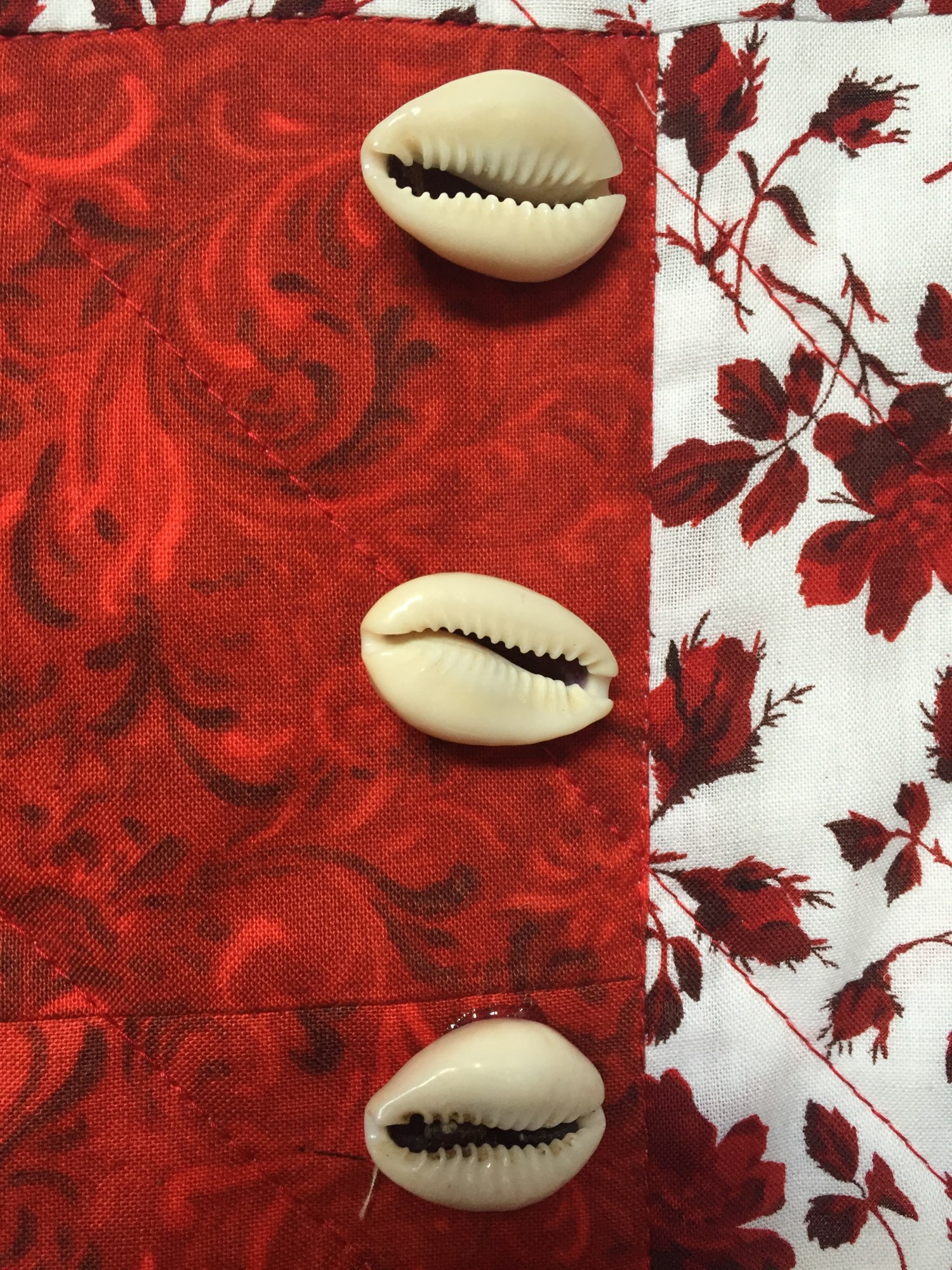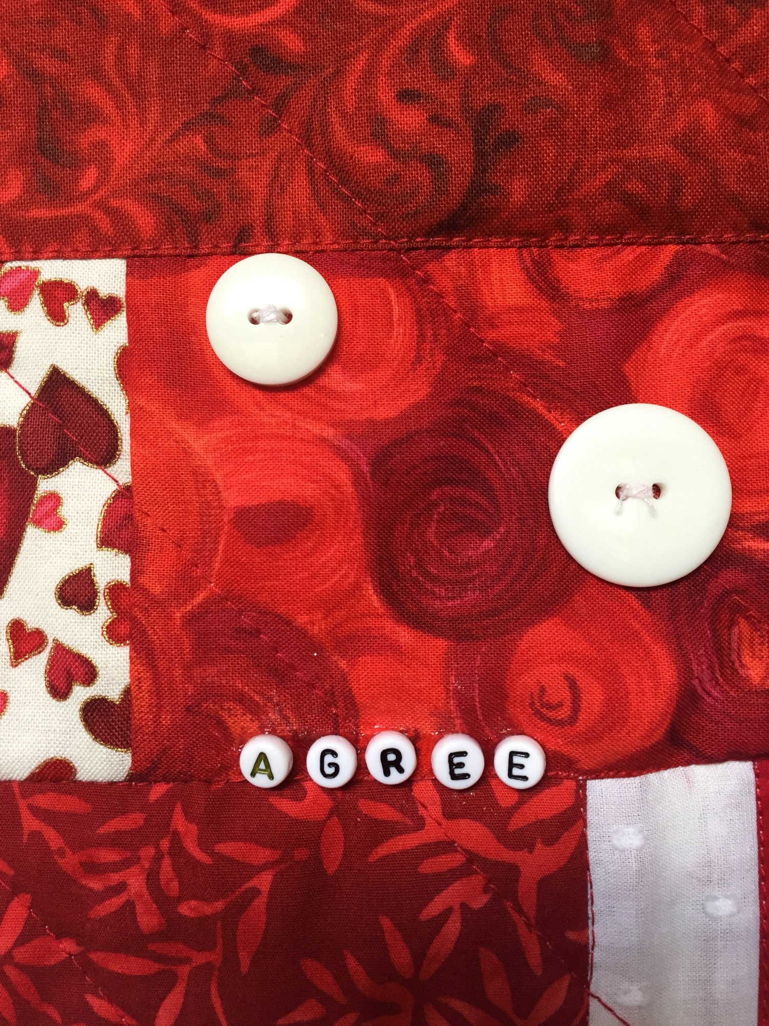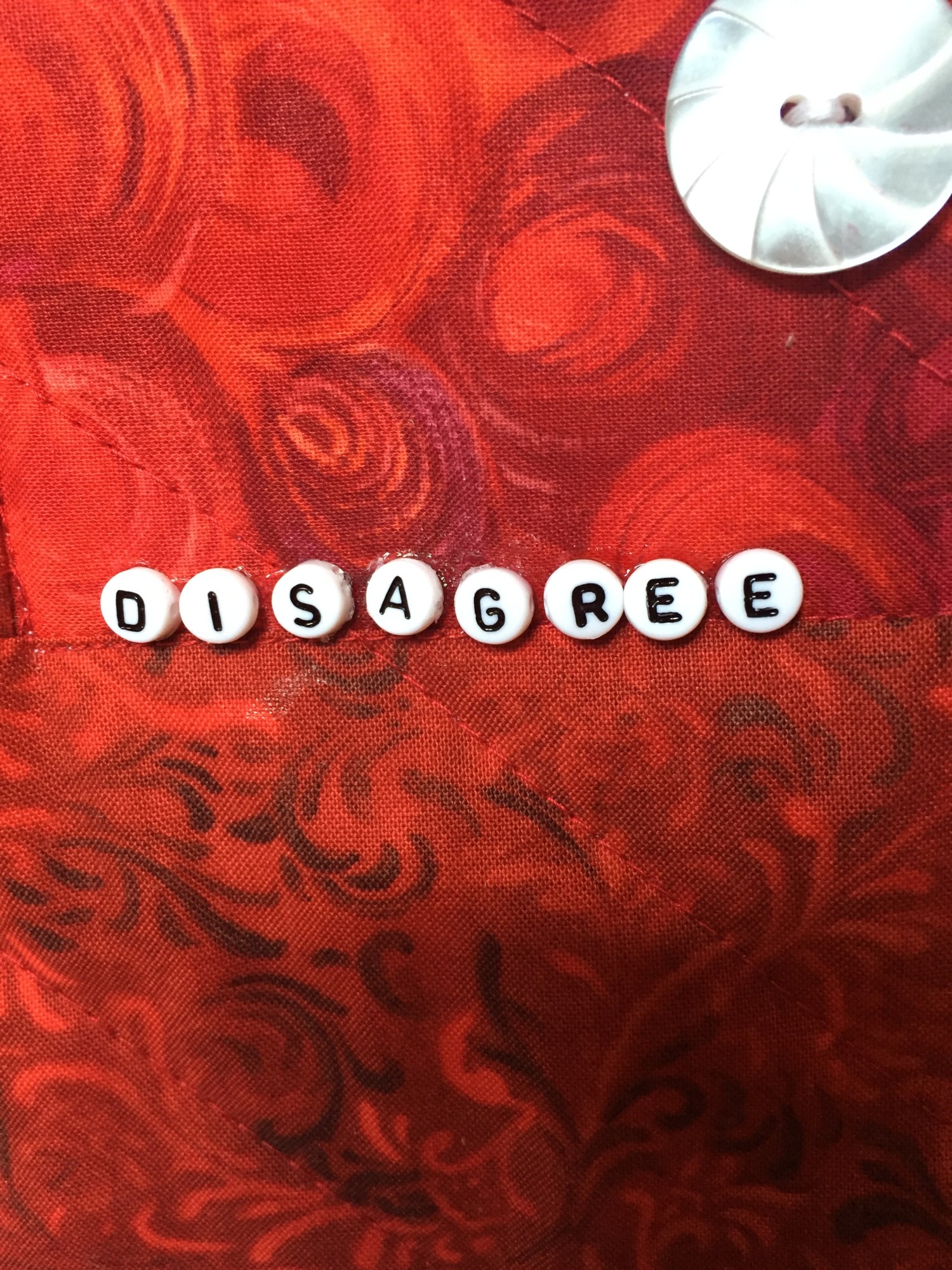Even though we love each other, we can disagree. 2 cardinals facing opposite directions. Machine appliqué and machine quilted. Embellished with buttons, crystals and words.