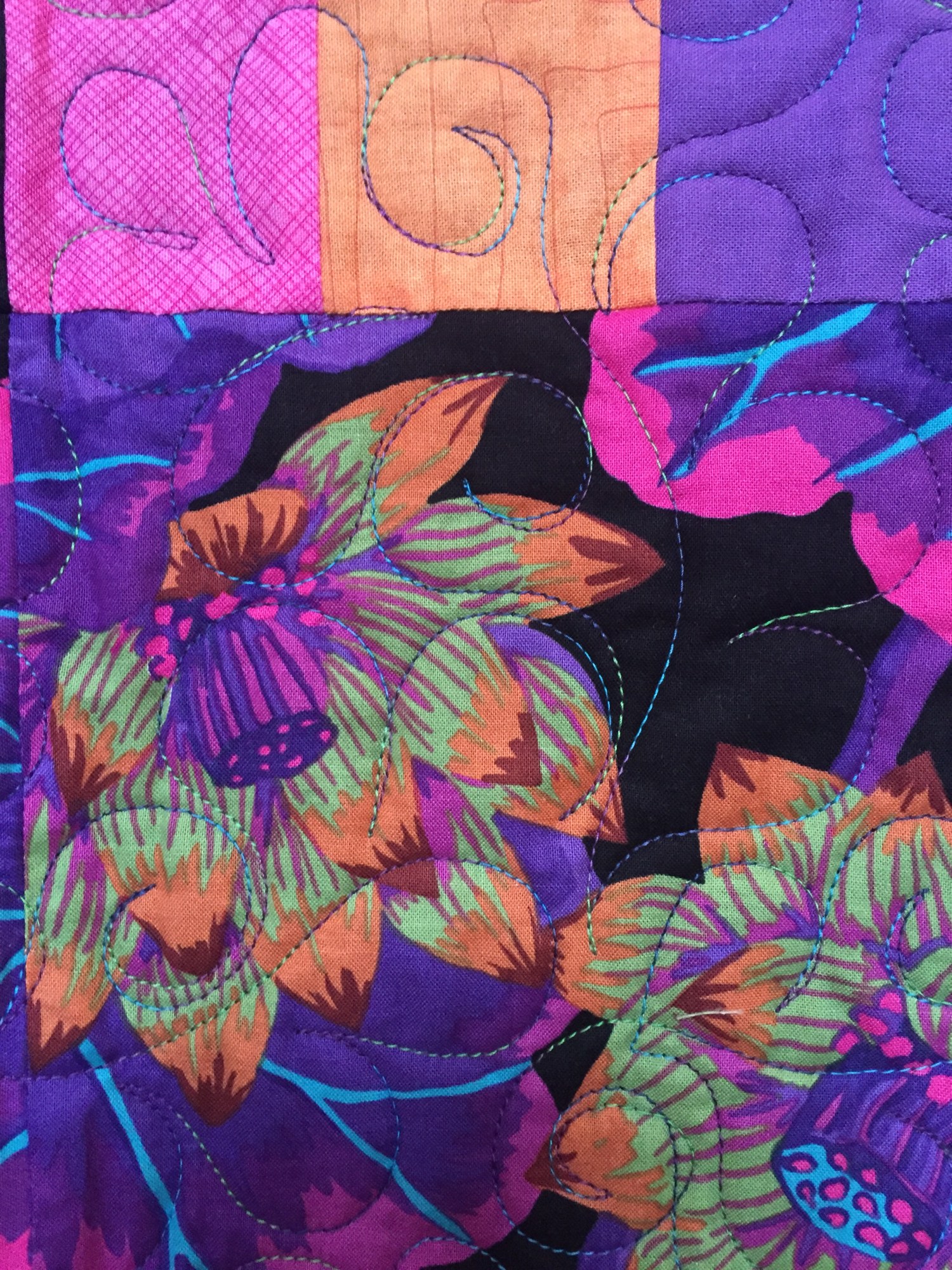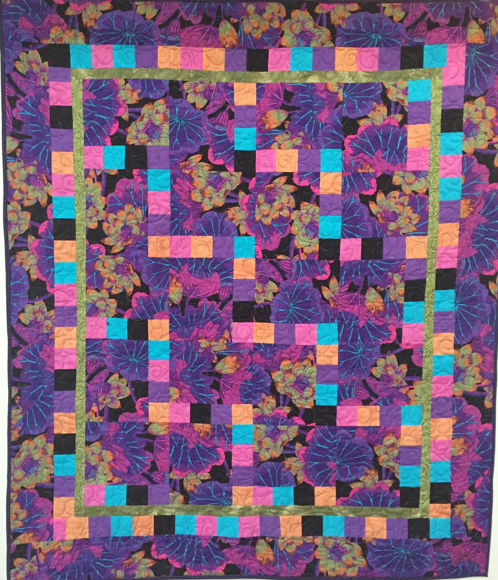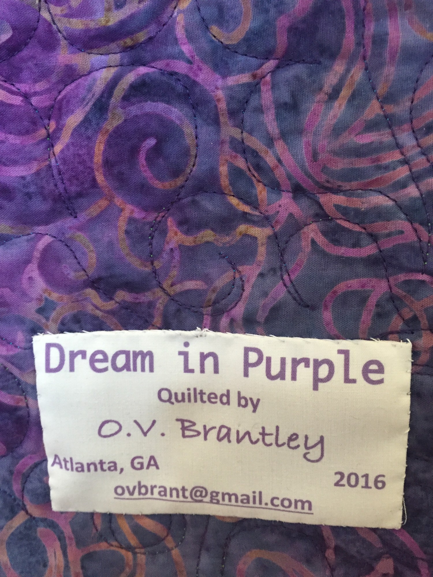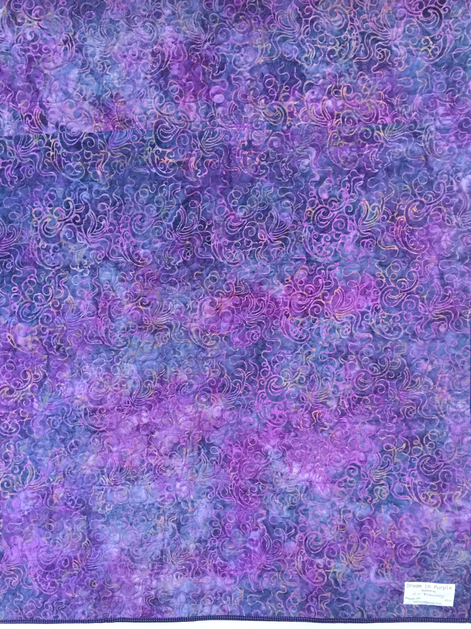 "Dream in Purple" is vibrant and explosive. The dominant color is purple but the colors float on a black background. It is machine pieced and machine quilted in variegated thread. The batting is black cotton and the back is a purple batik.