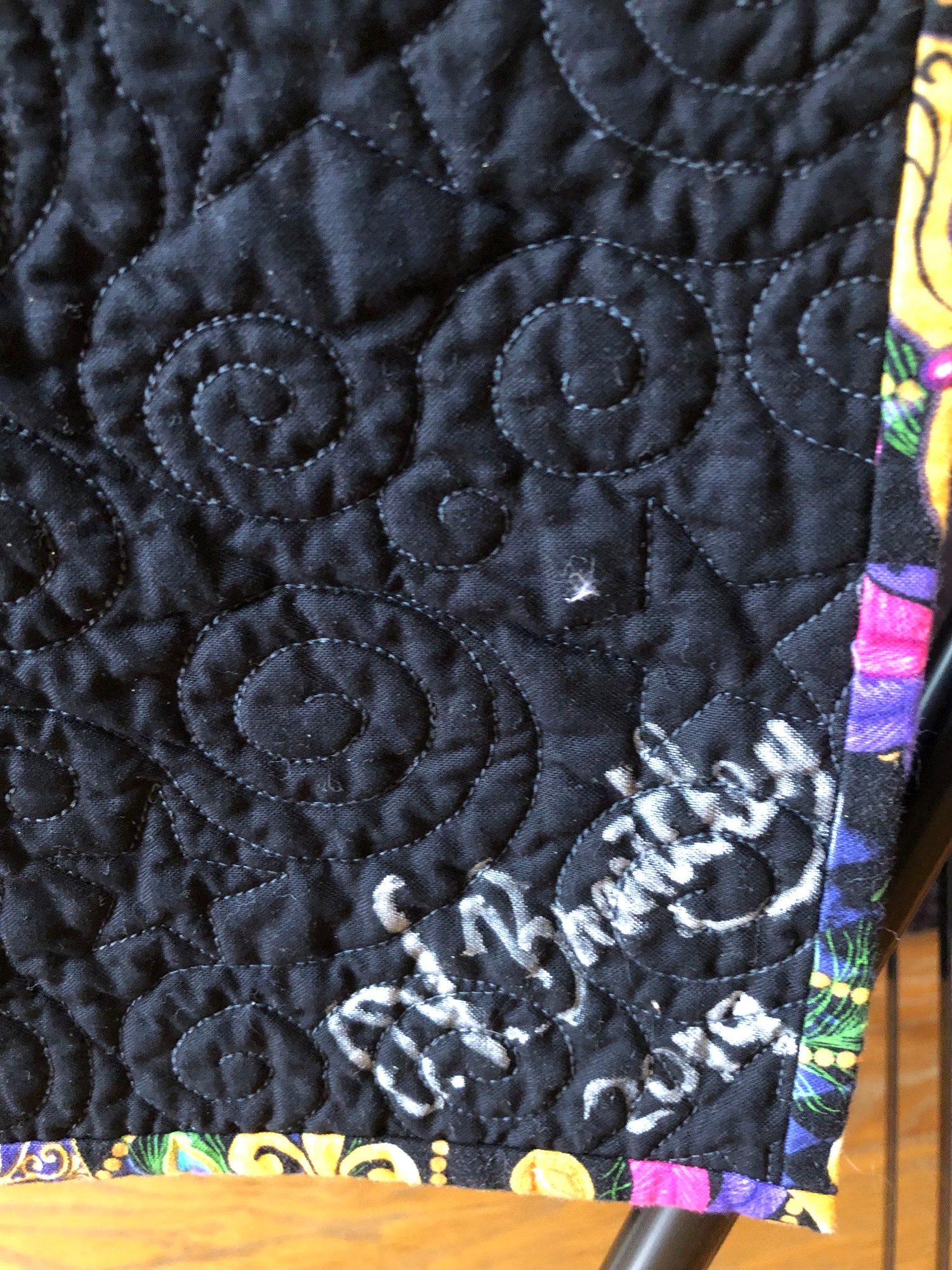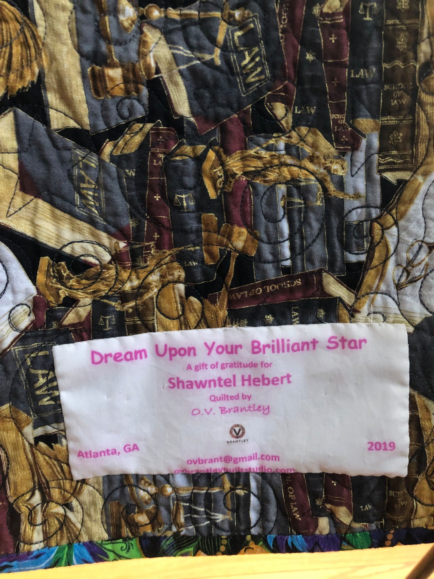 The fabric on the back of the quilt is a law fabric motif that carries out the theme of the quilt. A label documents the quilt and I signed it on the front.