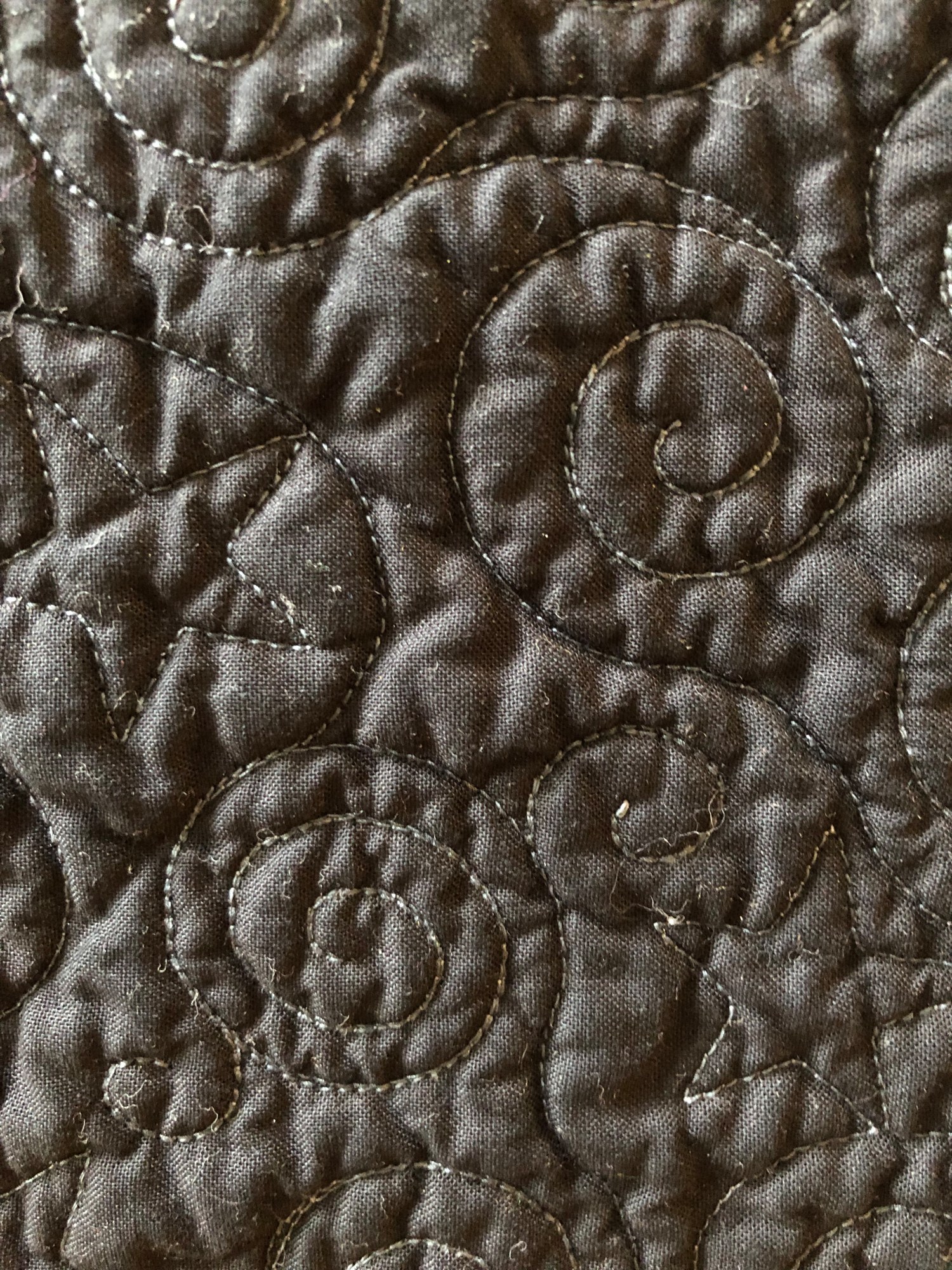 Often simple is most beautiful. “Dream Upon Your Brilliant Star” is one big pieced star made from African fabrics, jet black background fabric and a Mardi Gras fabric to personalize the quilt for the new owner. . It is pieced and quilted by machine.