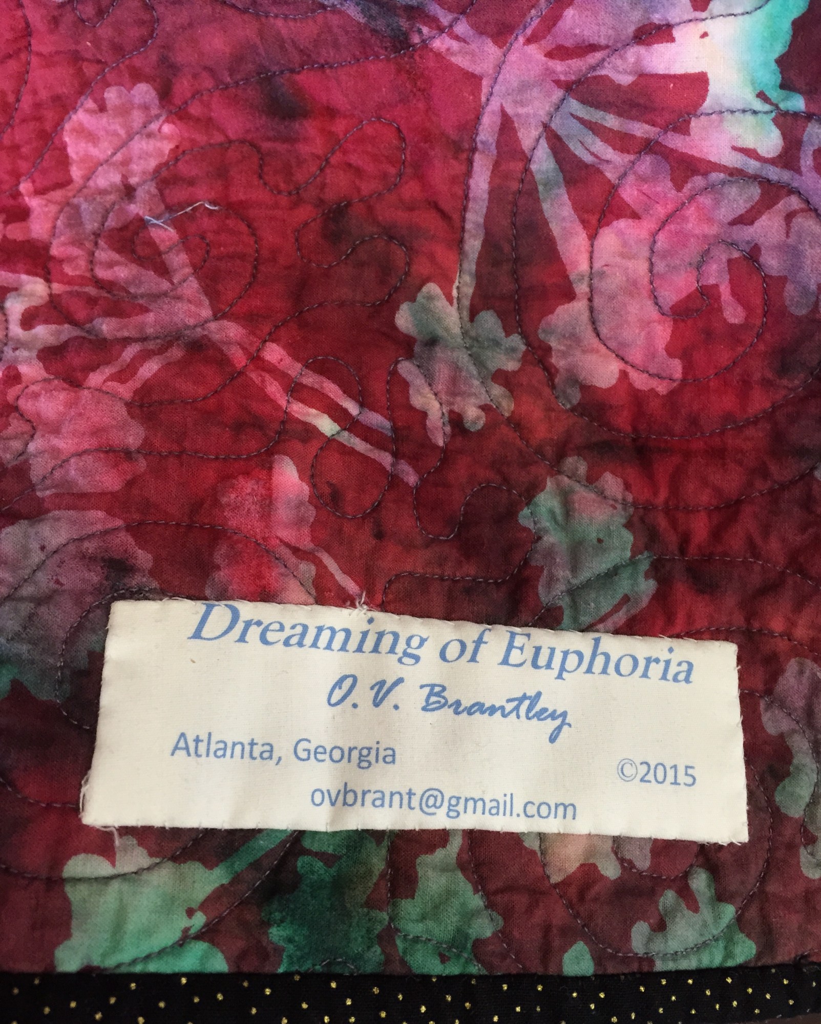 It is machine pieced and machine quilted. There is a hanging sleeve on the back and a label that documents the quilt. The fabric on the back is a rose and teal batik.
