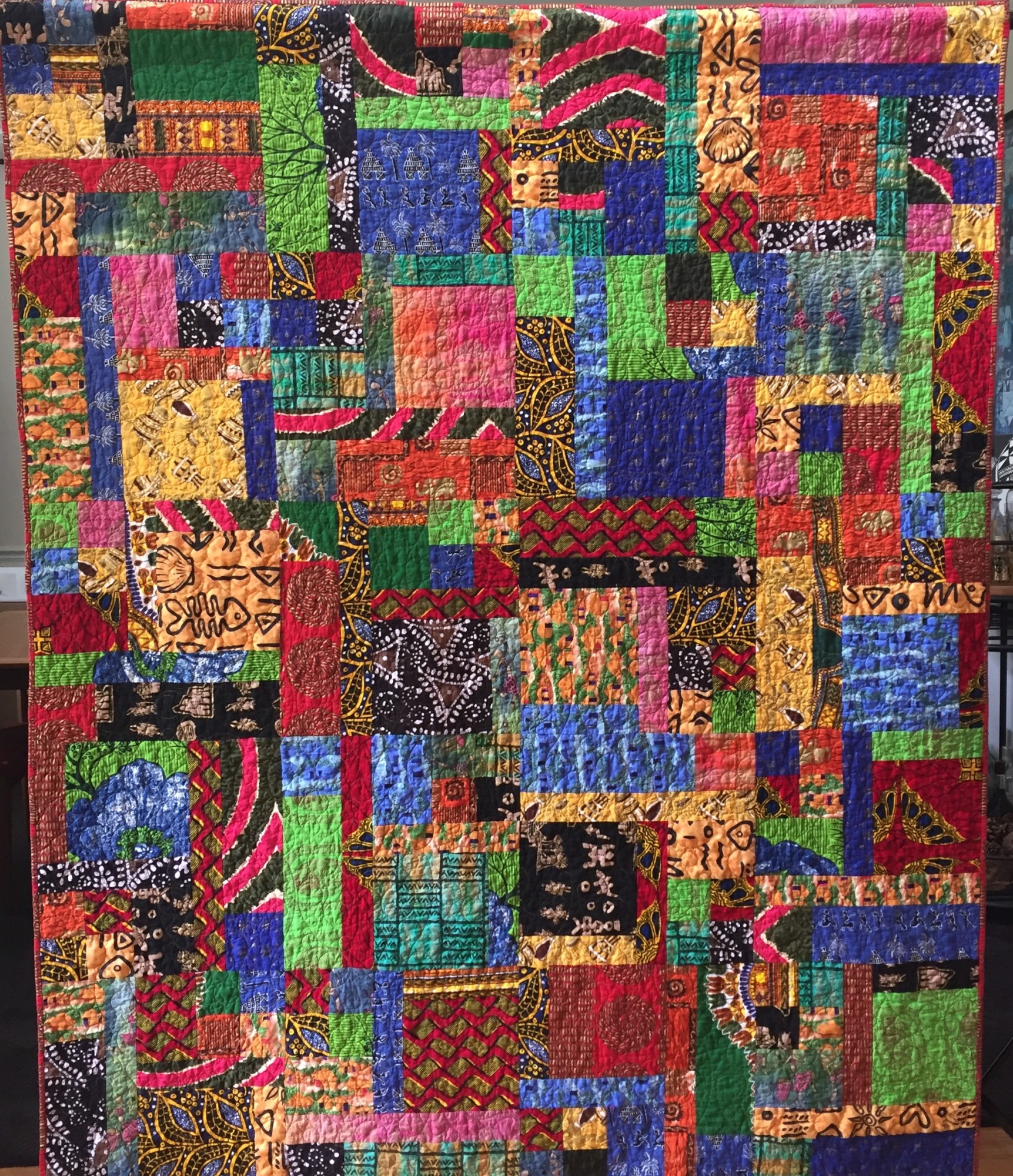 "Dreaming of My Ancestral Home" is a lap quilt that measure 60x75 inches. The bold color and pattern of African fabrics turns even the simplest quilt pattern into an amazing work of art. "Dreaming of My Ancestral Home" is based on the "Turning 20 Again " pattern. It is machine pieced and quilted.